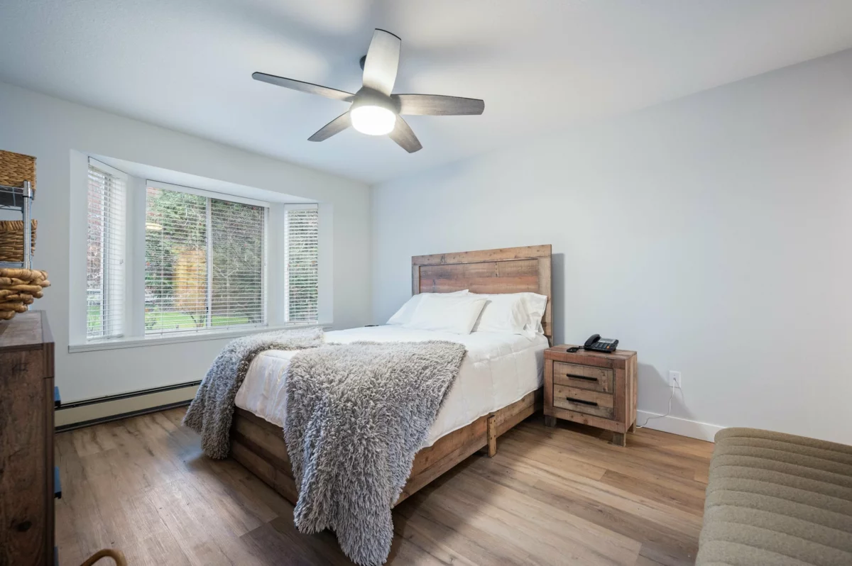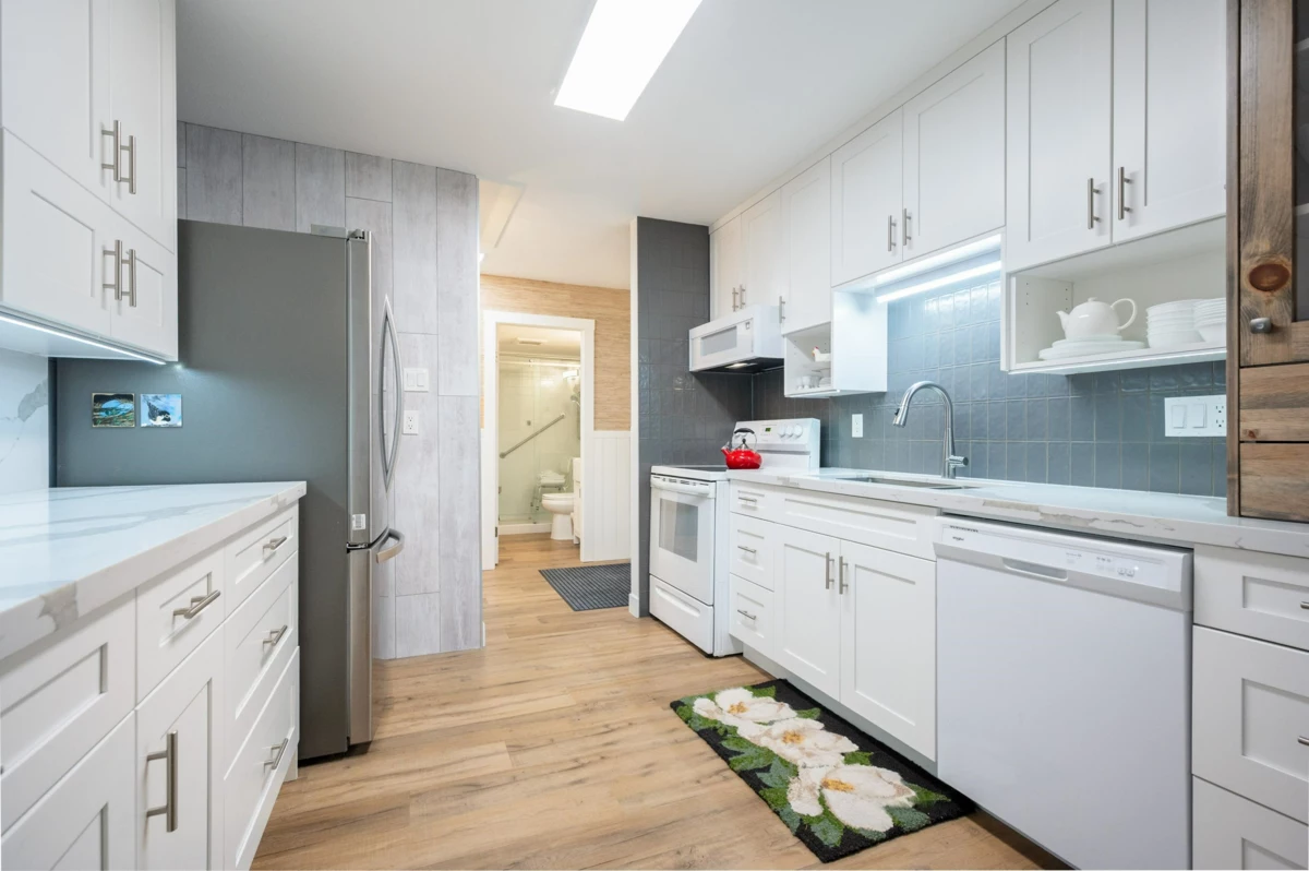 WELCOME HOME to this beautiful, professionally renovated unit in 55+ building. Stunning, personal touches to this 2 bed, 2 bath home make it unique and cozy! Kitchen reno includes carefully & mindfully designs including large, deep pull out drawers, upper cupboards lowered for easier access, storage/den with quartz feature wall & bench, large pull out drawers for storage; walk in shower with sliding glass door and multiple grab bars strategically mounted for safe maneuvering; side-by-side washer and dryer; unique epoxy flooring and so much more! Hot water baseboard heaters for economical heating plus a cozy gas fireplace. This 55+ building is located within easy walking distance of buses, & close to the freeway and shopping.