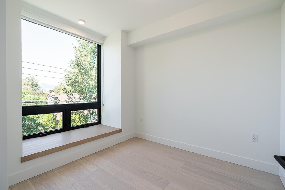 Welcome to Soto on W28 by FORME Development. This move-in ready 3 bed & Flex + 2.5 bath townhome offers 1,453 sqft of refined living with a rare 20’ wide layout, up to 10’ ceilings, and expansive floor-to-ceiling windows that fill the home with natural light. The modern kitchen features matte cabinetry, an oversized island with wine fridge, and a full Gaggenau appliance package. Enjoy A/C, engineered flooring, a custom media wall, private storage, and an EV-ready double garage with direct access. Outdoor living includes front and back patios plus a private rooftop terrace with sweeping mountain and city views. All set in one of Vancouver’s best neighborhoods—steps to Cambie Village, Queen Elizabeth Park, rapid transit, shops, cafés, and top school catchments.