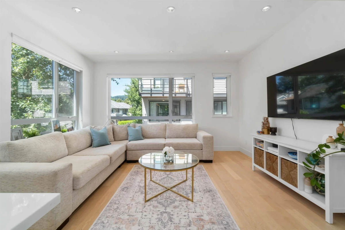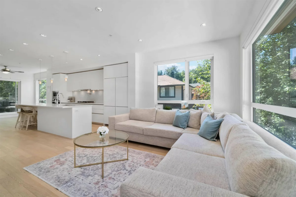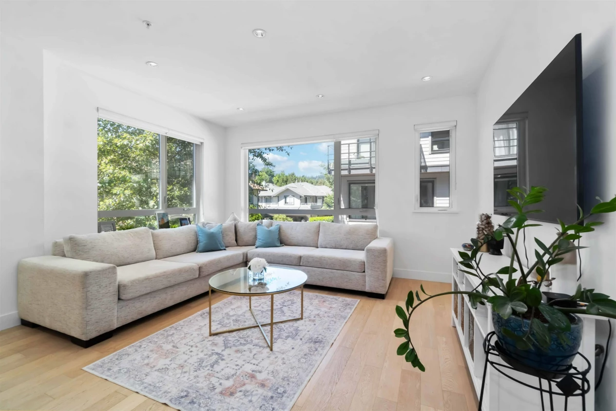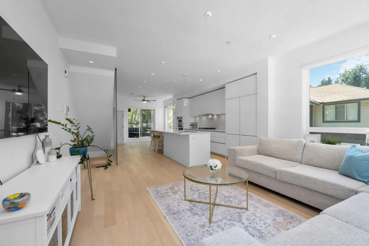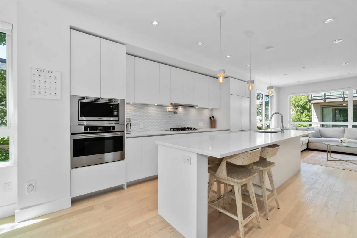 Welcome to Dwell24– Bright, modern living in a prime location. This end-unit townhouse is filled with natural light & located on the quiet side of the complex. With an oversized double car garage, EV charging, & quality finishes throughout, it offers both functionality & style. Open concept main level features a chef’s kitchen with cabinet-front double fridge/freezer, gas stove, pot filler, & oversized island—ideal for cooking & entertaining. Enjoy the spacious sun soaked living room, or lounge on the balcony with treed views & gas hookup for BBQ. Upstairs, the primary bedroom impresses w/12ft ceilings, balcony, his/hers closets, & a beautiful ensuite w/ double sinks. Dedicated office space on lower level overlooking fully fenced patio & yard.