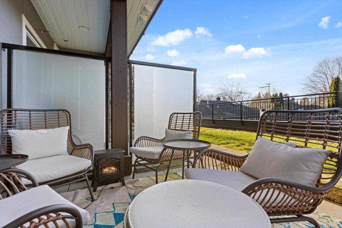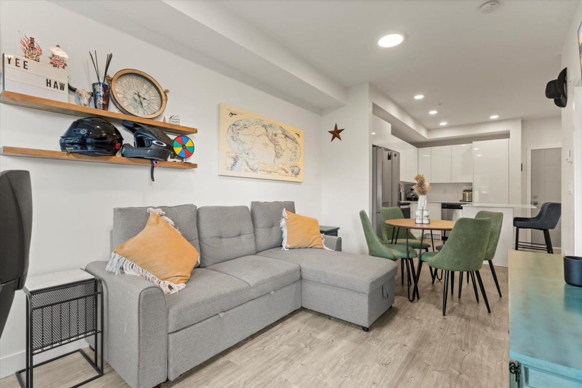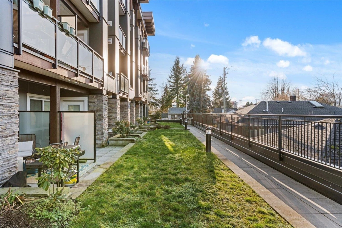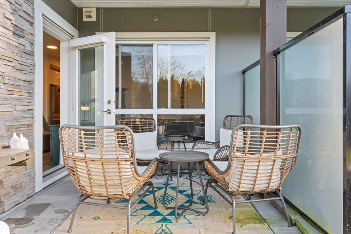 Modern 1 bedroom, 1 bathroom condo at The Robson, offering the perfect blend of privacy and convenience. This ground-level home is elevated above the street for added security and seclusion, while the large covered patio opens onto a grassy common area—making the space feel far larger than its footprint. Inside, enjoy a like-new feel with crisp white paint and cabinetry, stainless steel appliances, stone countertops, an island with breakfast bar and large windows that fill the space with natural light. Features include in-suite laundry with extra storage, secure parking and a storage locker. Well-maintained amenities include an exercise room and playground. Ideal for first-time buyers, downsizers, or investors.