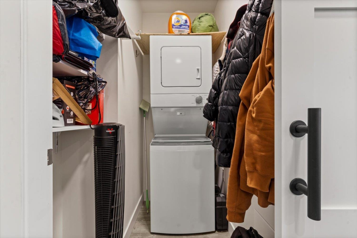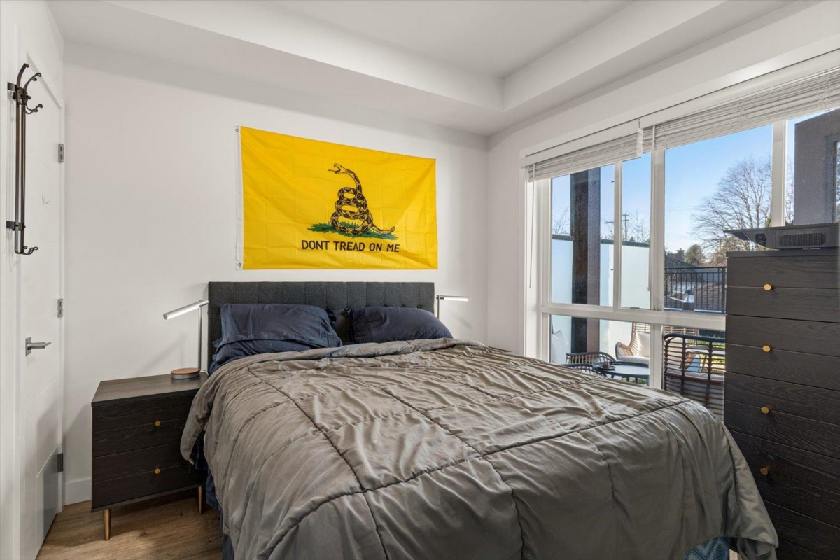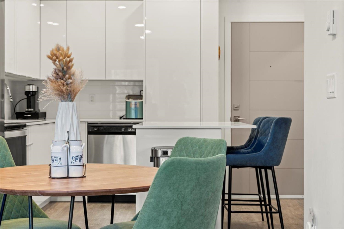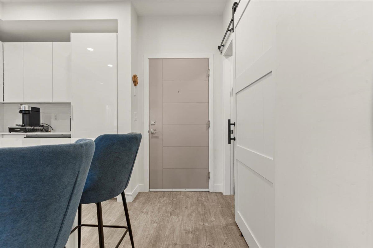 Modern 1 bedroom, 1 bathroom condo at The Robson, offering the perfect blend of privacy and convenience. This ground-level home is elevated above the street for added security and seclusion, while the large covered patio opens onto a grassy common area—making the space feel far larger than its footprint. Inside, enjoy a like-new feel with crisp white paint and cabinetry, stainless steel appliances, stone countertops, an island with breakfast bar and large windows that fill the space with natural light. Features include in-suite laundry with extra storage, secure parking and a storage locker. Well-maintained amenities include an exercise room and playground. Ideal for first-time buyers, downsizers, or investors.