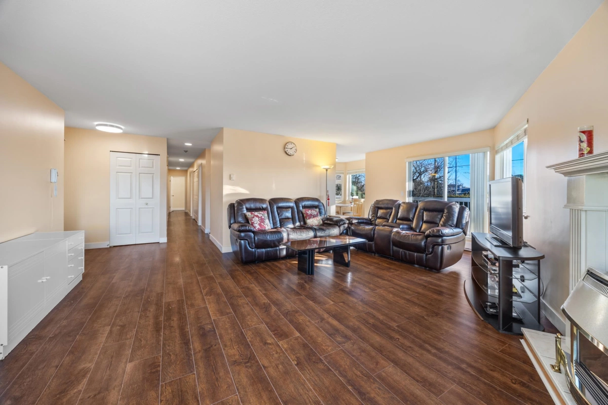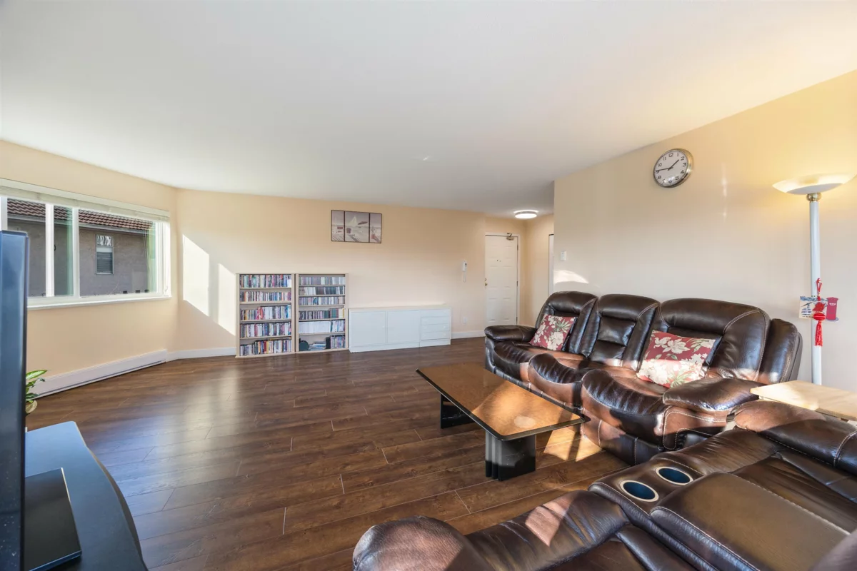 *PRE-INSPECTED* Welcome to Mellis Gardens! Why buy a townhome when you can have 1,556 sqft of Spacious Living without the stairs? This Rarely Available 2 Bedroom + HUGE Den, Southeast Corner Unit features 2 Balconies, fits House-Sized Furniture, and is Perfect for any family. The versatile den can serve as a 3RD BEDROOM, an office, or a formal dining room. Meticulously maintained with Updated Flooring throughout, Ceiling Lights, and Countertops. Enjoy peace of mind in a fully rain-screened building with a proactive strata. Includes 1 Parking & 1 Locker. Overlooking a serene courtyard, this is a MUST SEE! Perfect for First Time Home Buyers & Families! Please call to tour this home!
