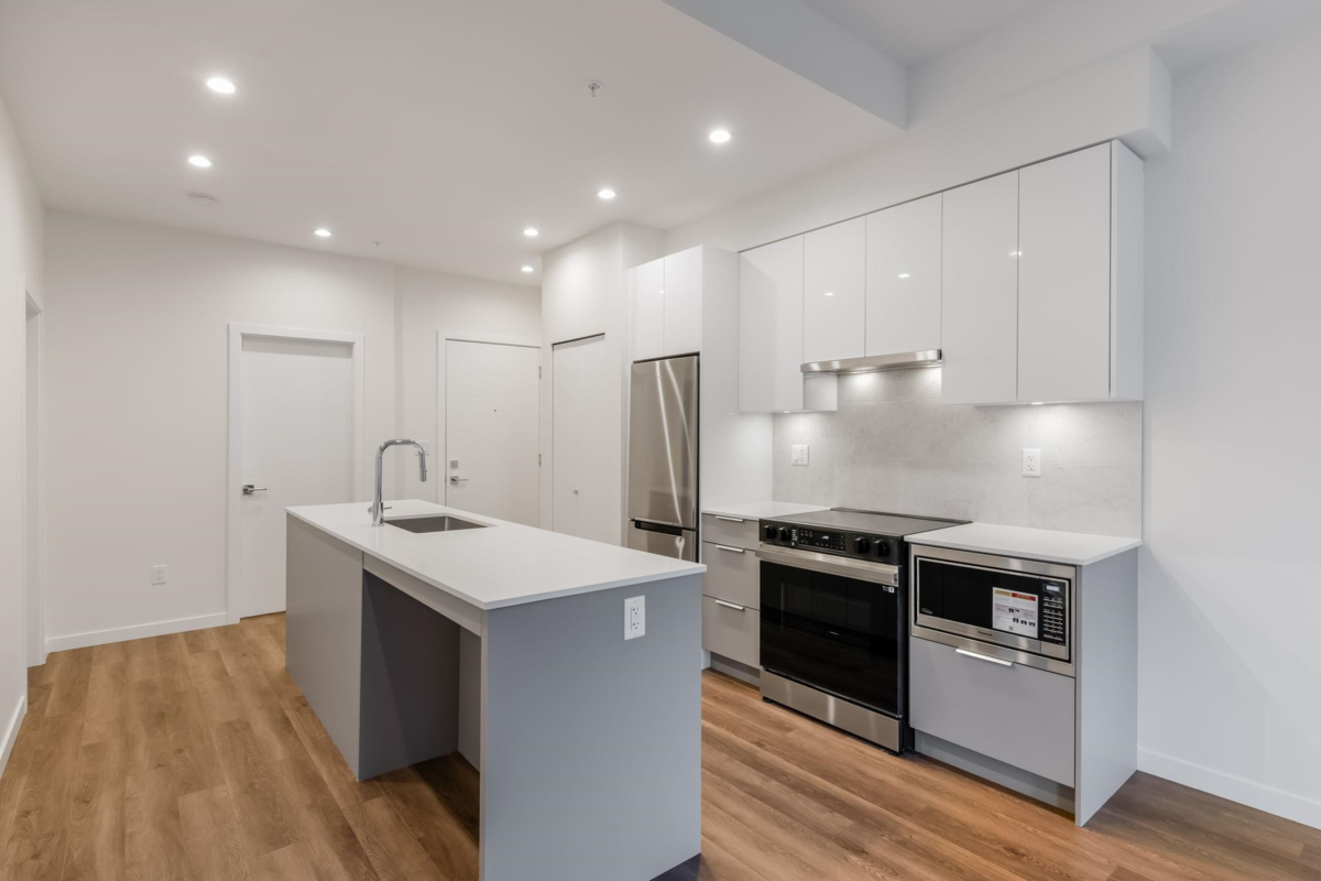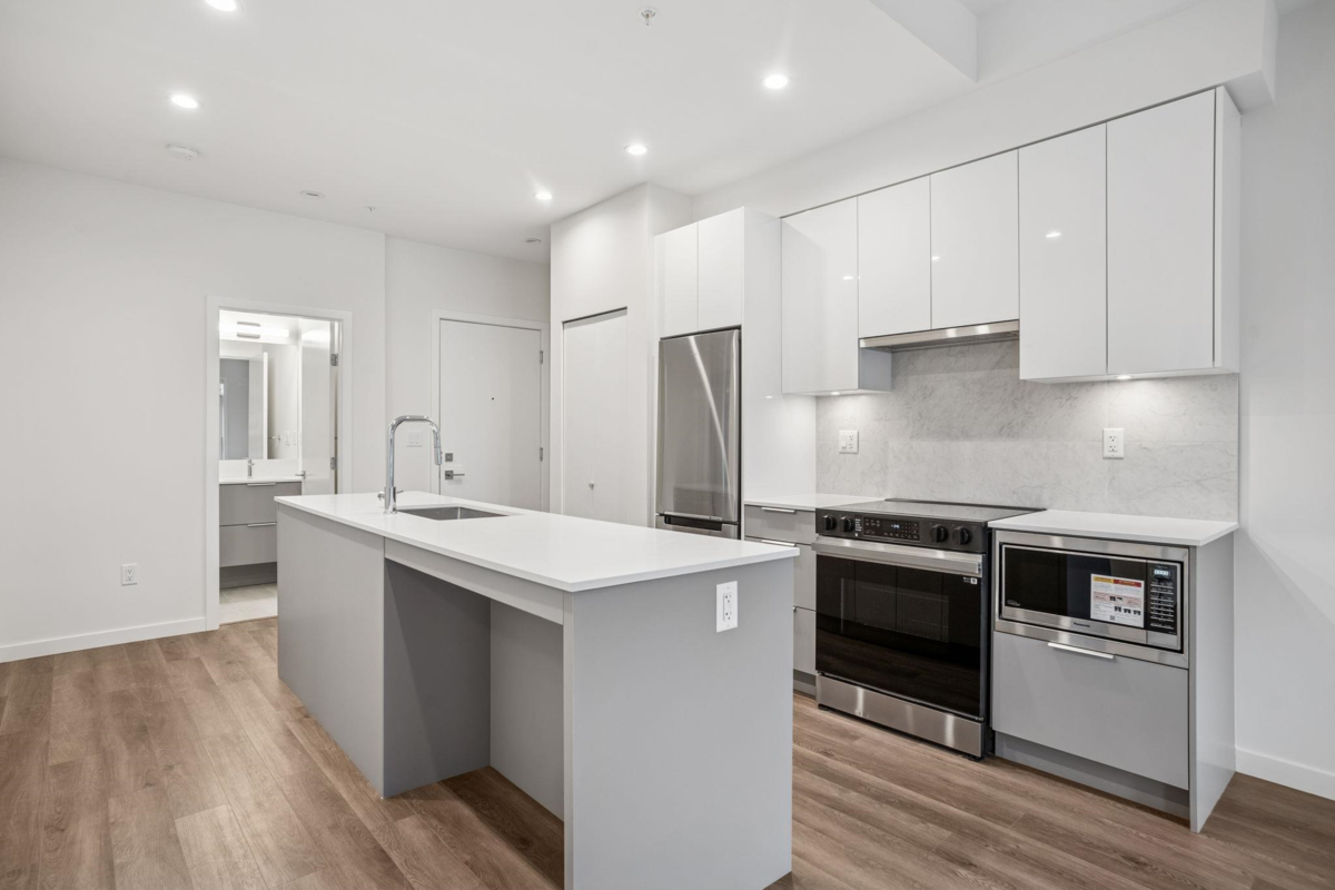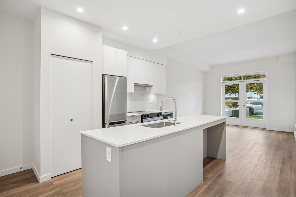Welcome to Prosper! Ground floor south facing comer 2 Bed 2 Bath home with approximately 10 foot ceilings offers an open stylish design. Laminllte flooring throughout, sleek cabinetry, Samsung stainless steel appliance package, full size washer and dryer and a large outdoor pario with street access for ullimate convenience. This home also includes I parking stall and I storage locker. Enjoy premium amenities including full kitchen dining area, a billards game zone, a theatre room, state Of-the-art fitness centre and an outdoor yoga/ meditation garden. Experience convenient living at Prosper, situated between Guildford Mall and Surrey City Centre. Minutes way from restaurants, shopping, transit, parks, and SFU Campus