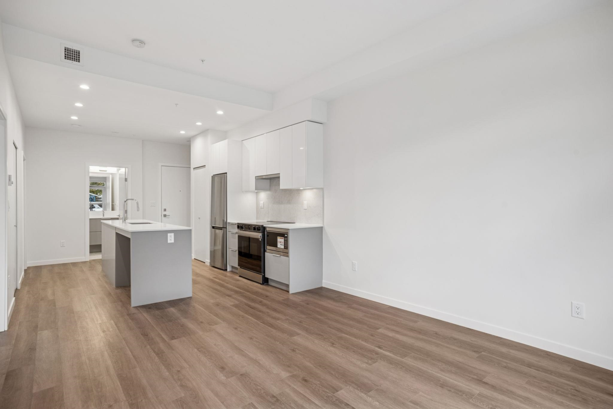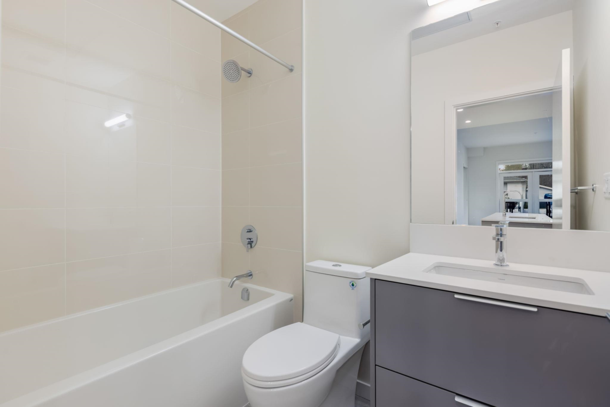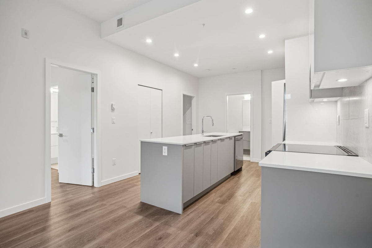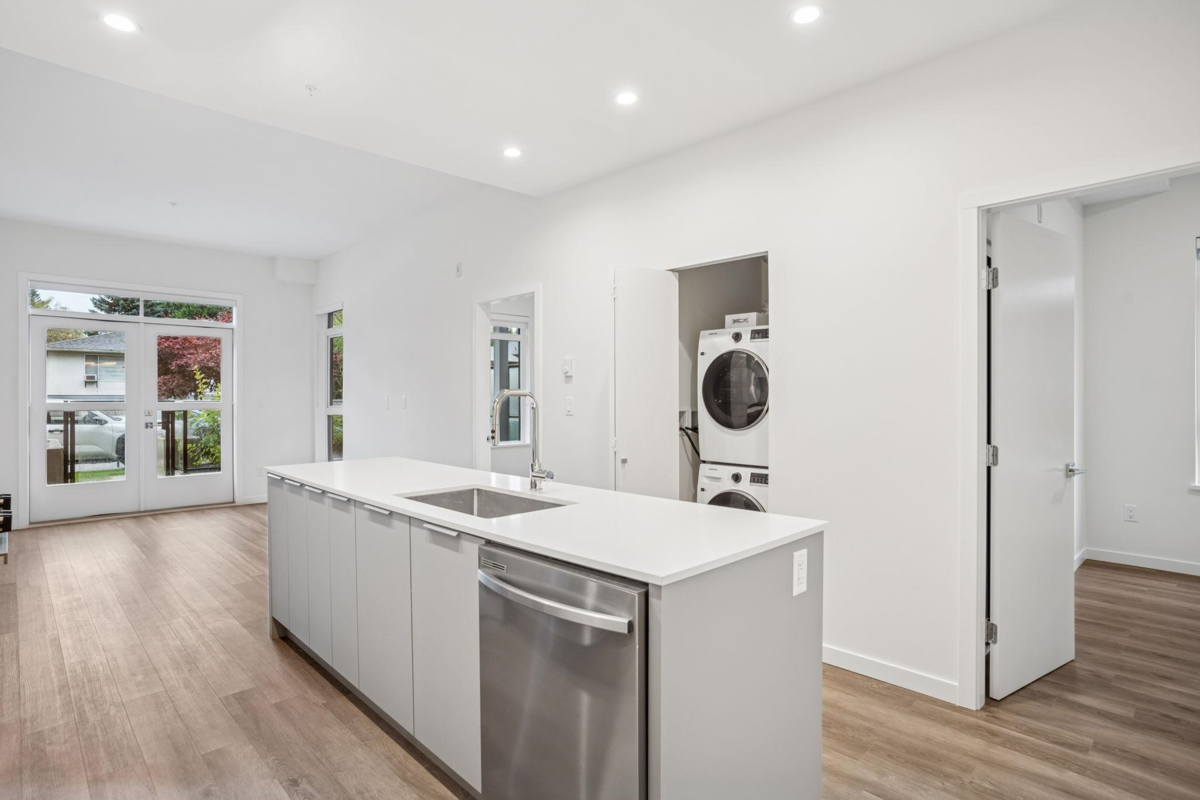 Welcome to Prosper! Ground floor south facing comer 2 Bed 2 Bath home with approximately 10 foot ceilings offers an open stylish design. Laminllte flooring throughout, sleek cabinetry, Samsung stainless steel appliance package, full size washer and dryer and a large outdoor pario with street access for ullimate convenience. This home also includes I parking stall and I storage locker. Enjoy premium amenities including full kitchen dining area, a billards game zone, a theatre room, state Of-the-art fitness centre and an outdoor yoga/ meditation garden. Experience convenient living at Prosper, situated between Guildford Mall and Surrey City Centre. Minutes way from restaurants, shopping, transit, parks, and SFU Campus