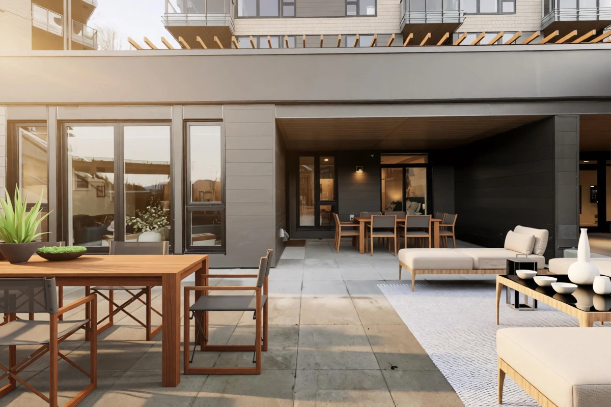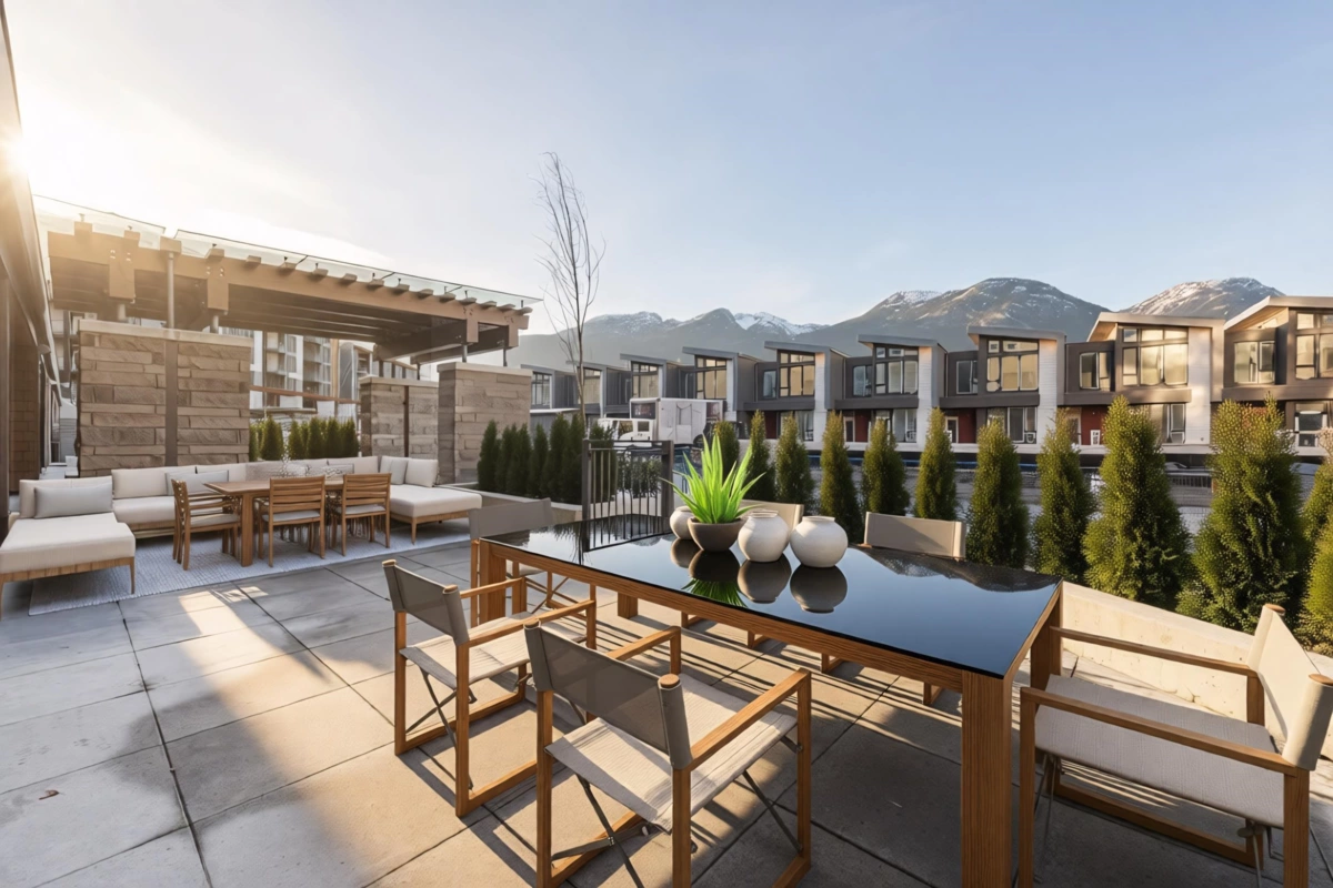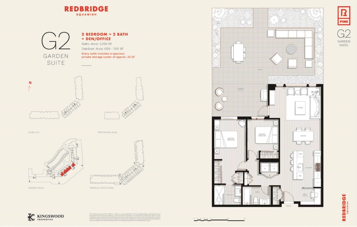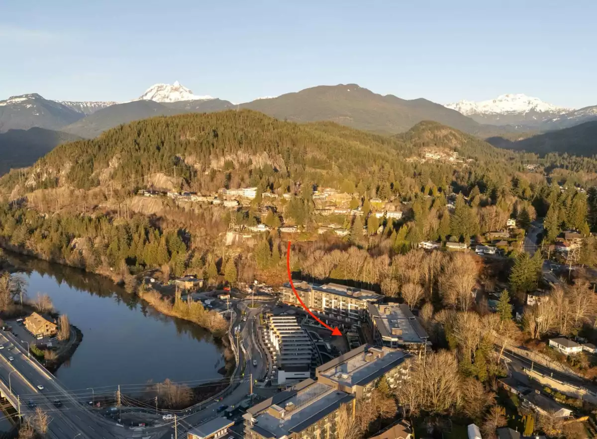 Incredibly unique with one of the largest floor plans and outdoor patios in the development. This 1,055 sq/ft, 2 bed + den, 2 bath condo features a heat pump and an expansive patio of nearly 700 sq ft, offering almost 1,700 sq ft of total living space. With mountain views, high end finishes and no neighbours above, below, or beside, as well as private ground-level access, it lives like a detached home. Combined with the proximity to trails, downtown and Redbridge's 20,000+ sq ft of amenities including - yoga room, a full gym, sauna/hot tub/cold plunge, outdoor kitchens, co-work space, workshops and much more this home is truly unparalleled in Squamish.