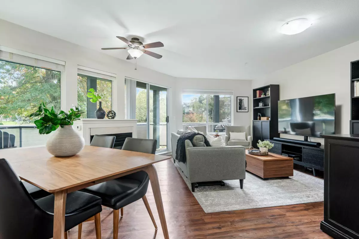 ELEVATED first floor condo surrounded by mature trees for privacy, southwest exposure- this quiet corner unit has easy outside access to walk the dog. Large kitchen w/upgrades include (2023) new subway tile backsplash, countertops, and professionally painted cabinets, d/w brand new. Spacious bedrooms, master has large W/I closet with plenty of storage and features a private balcony as well. Gas fireplace in Livingroom that opens to wrap around balcony. Laminate flooring throughout. Bathrooms also updated 2023. Above garage so no downstairs neighbors to disturb, secure parking and storage locker, short walk to groceries, bank restaurants and shops and pool with waterpark, schools nearby. Bus stop right out front.