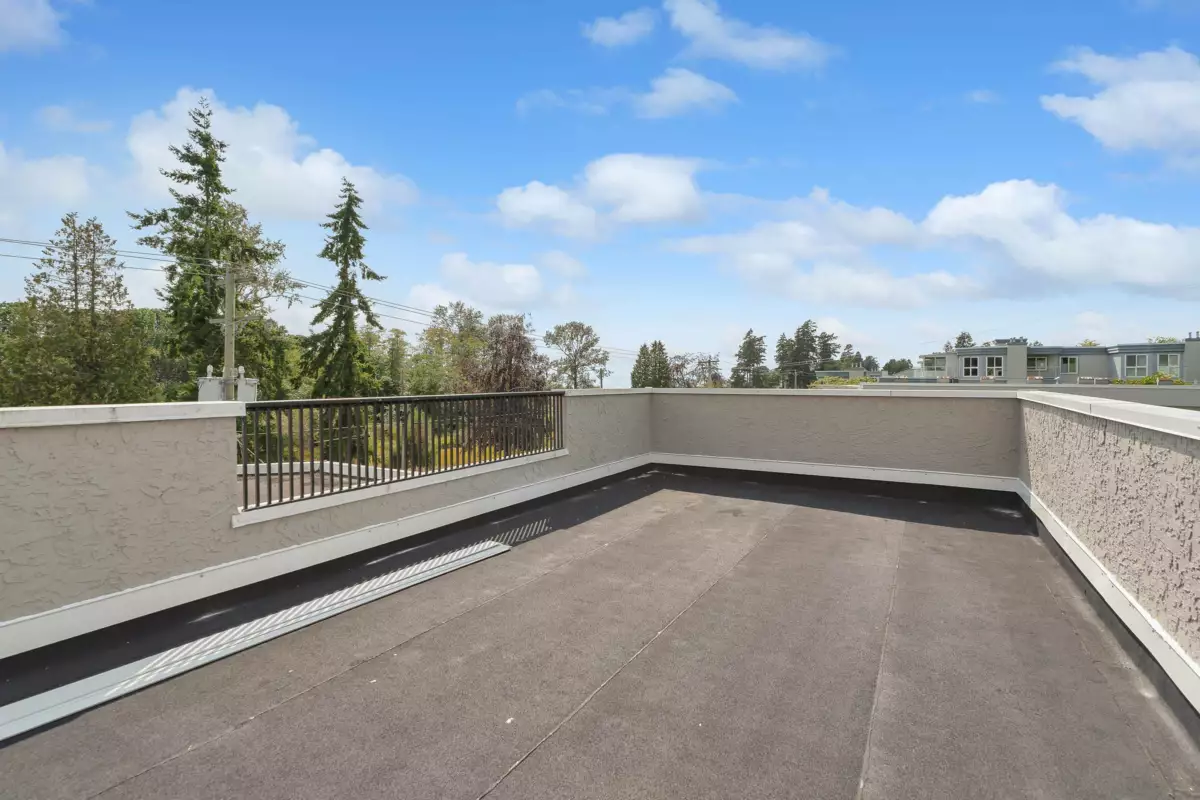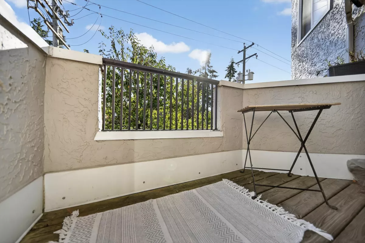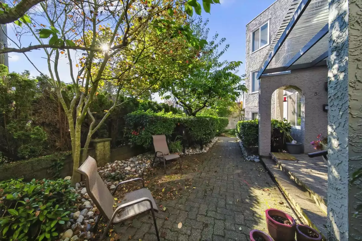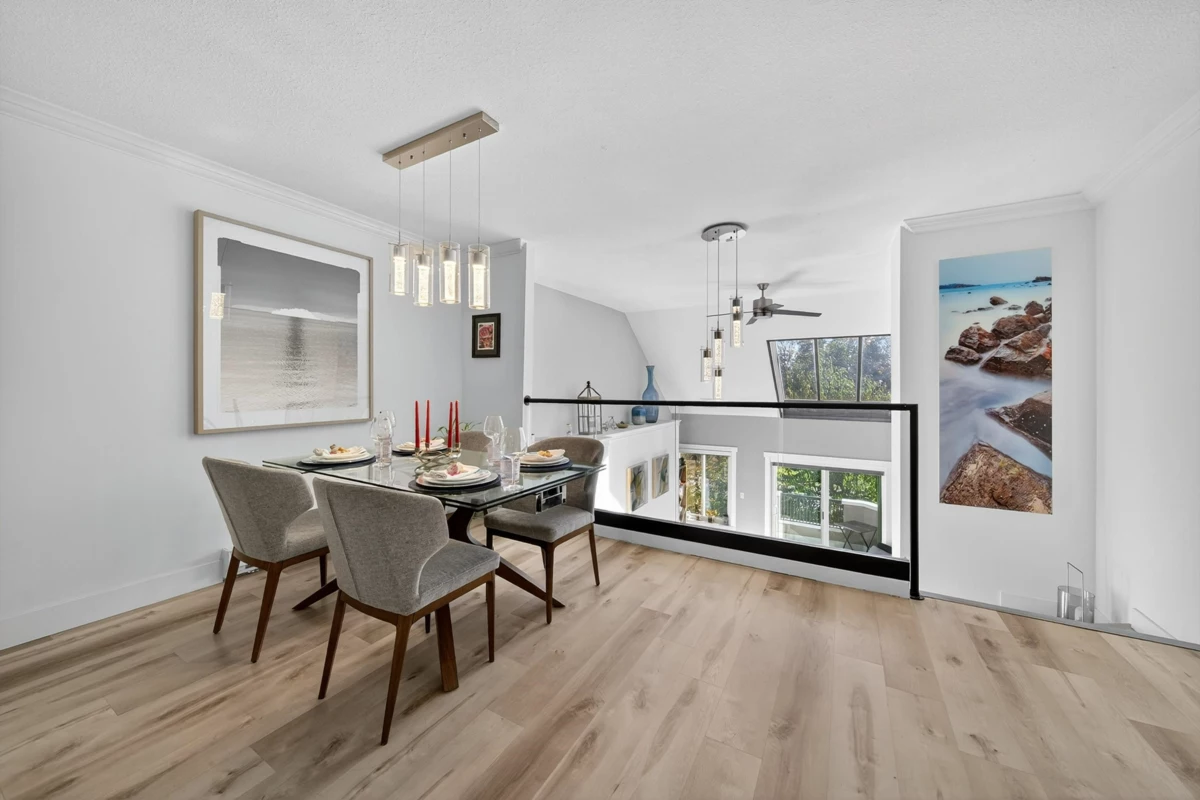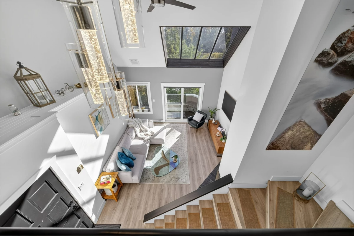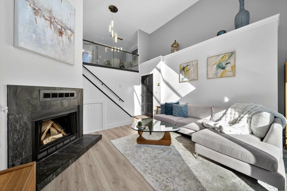 Mariner Estates—where artistic charm meets coastal living. This fully renovated 2-bed, 2-bath corner townhome offers soaring 20-ft ceilings, skylights, and a multi-level layout that keeps you fit and defines the rooms that exudes serenity & privacy. The 2022 renovation includes quartz counters, stainless steel appliances, induction cooktop, and spa-inspired bathrooms with Italian tile and rain showers. Freshly painted. Enjoy 2 private balconies and a rooftop deck with ocean & and river-views, backing onto protected greenspace alive with birdsong. Includes walk-in closet, two storage lockers, and covered carport. Pet friendly (2, any size). A 5-minute walk to East Beach, the Promenade, cafés, and shops. Truly a special home with soul.