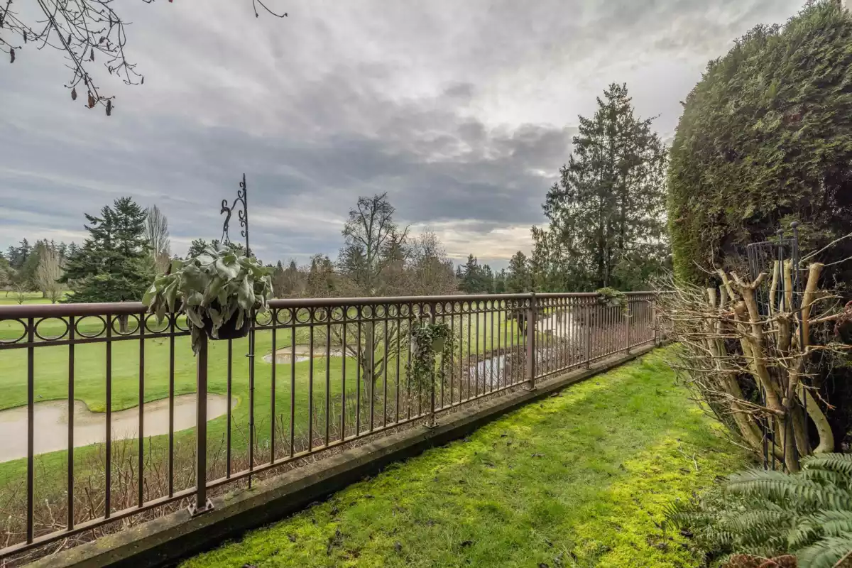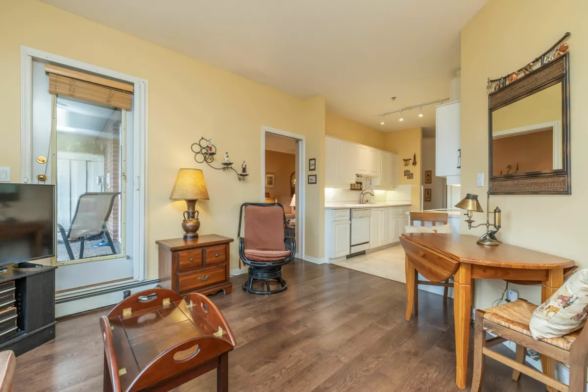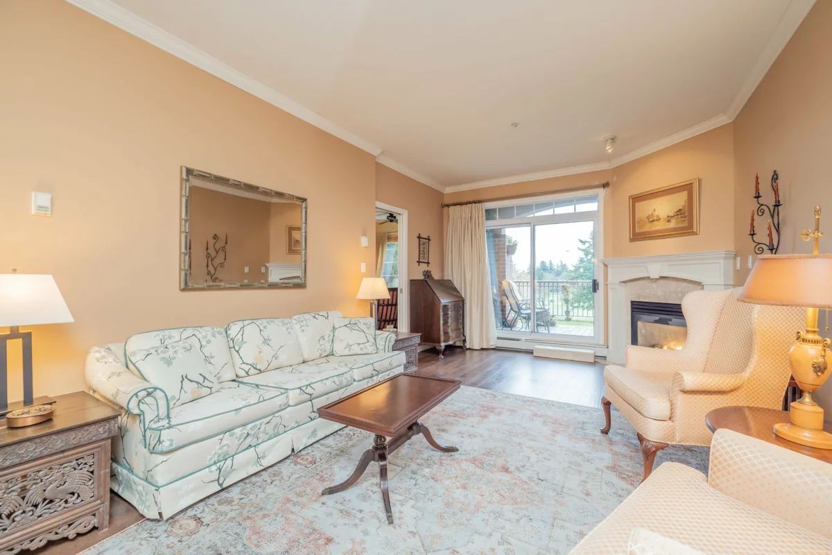 Hunter Green! Steps from Tsawwassen town center, this special 1362 sq.ft property features 9' ceilings in the expansive living/dining rooms with gas fireplace and sliding doors to large patio and garden with unobstructed year round VIEWS of the Beach Grove golf course! Spacious kitchen with adjacent eating area and family room. Generous primary bedroom - French door leads to second patio. Second bedroom and den complete this wonderful property. Two decks connected by garden area - so much space! Storage locker, secure parking, workshop, bike storage and recreation room. No pets. Main fees $668/mo (includes heat/hot water/gas/mgmt./gardening). Parking #34. A unique and special property!