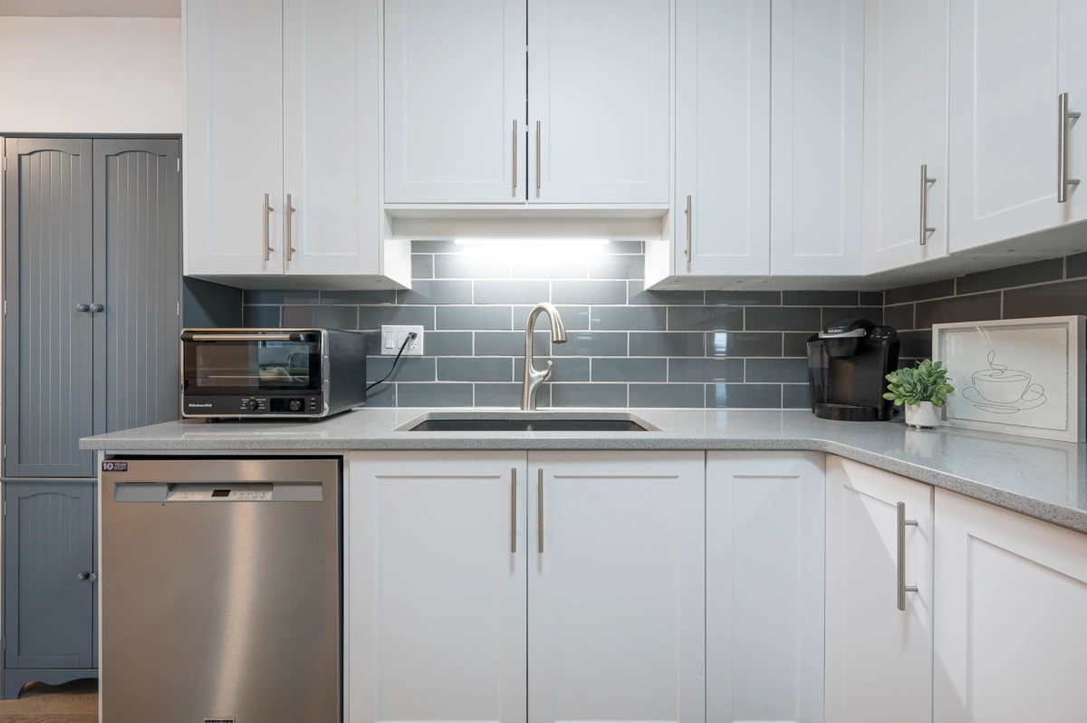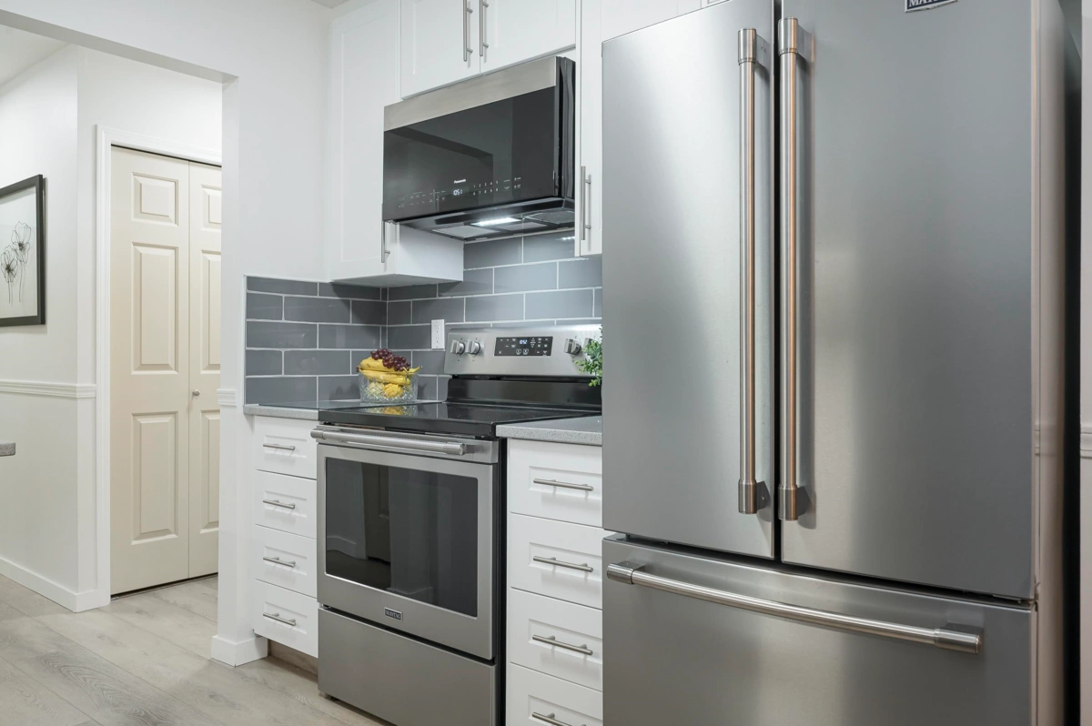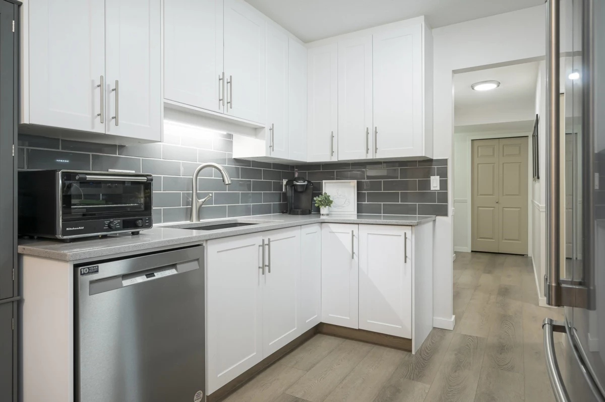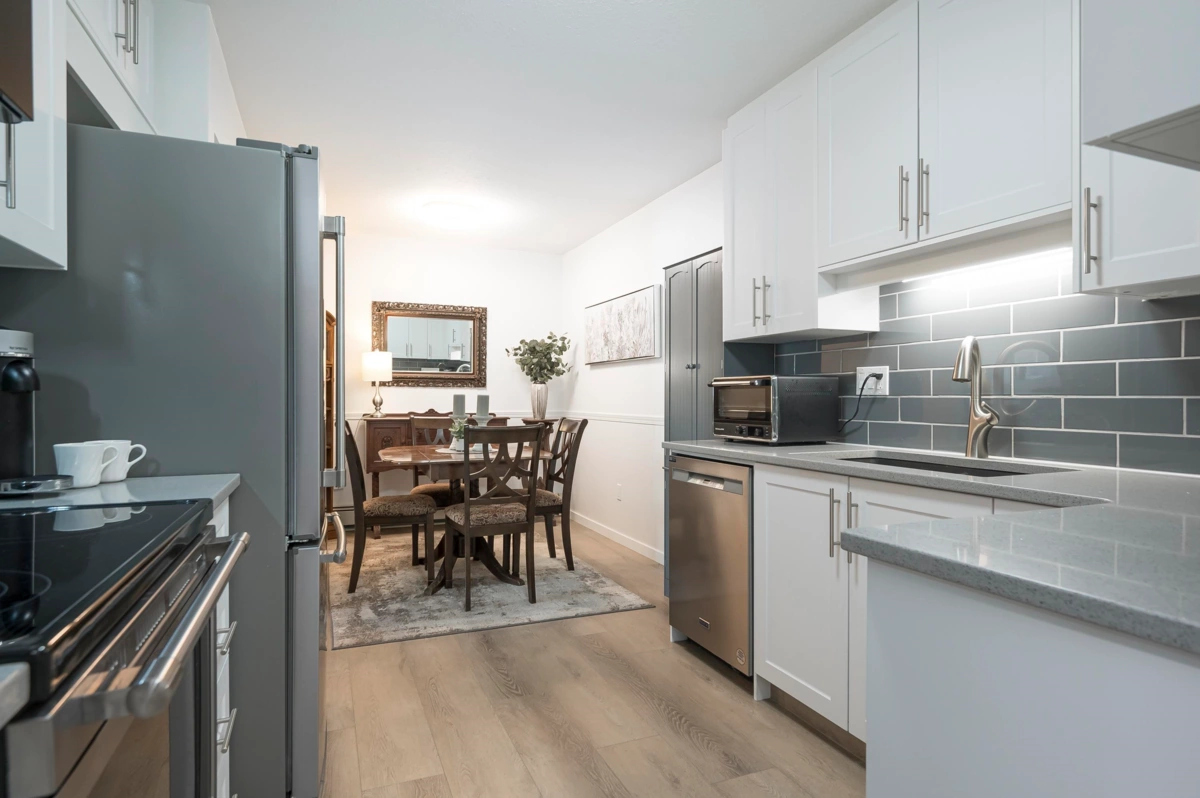 Beautifully renovated 2-bedroom, 2-bathroom condo in the desirable 55+ Park Place community. Updated kitchen features stainless steel appliances, quartz counters, white cabinets, & modern backsplash. Quality wide-plank style flooring throughout the kitchen & living areas. Enjoy a full dining room plus a bright living room w/ sliding door access to the peaceful, raised balcony. Large primary bedroom suite w/ walk-in closet & modern 3pc ensuite w/ glass shower. Updated 4pc main bath & newer side-by-side washer & dryer. Well-managed building w/ outstanding amenities: indoor pool, hot tub, sauna, guest suite, games room w/ fitness area, & workshop. Prime location just a short walk to grocery stores, Sevenoaks Mall, restaurants, cafes, & Mill Lake. Storage locker & secure underground parking.