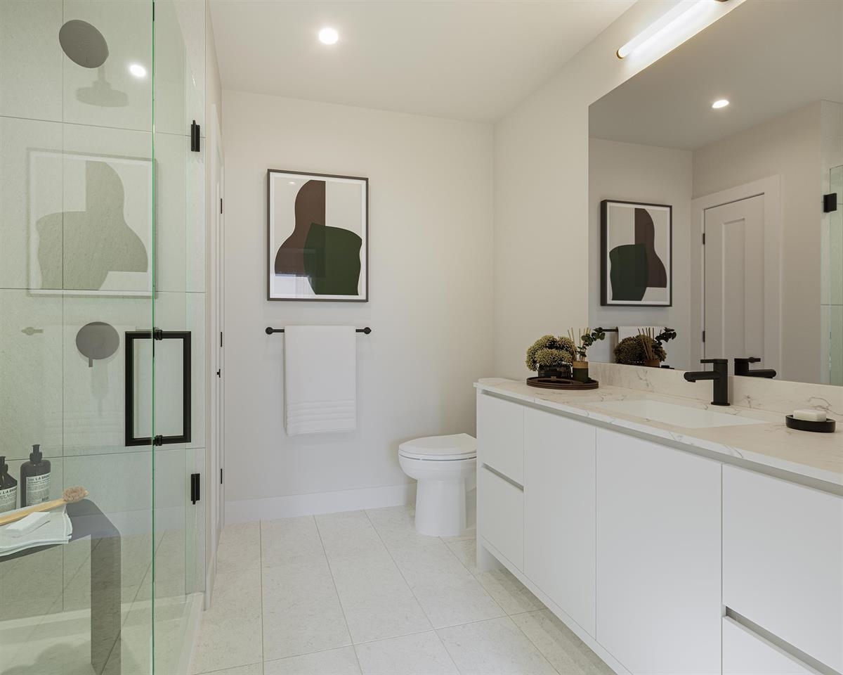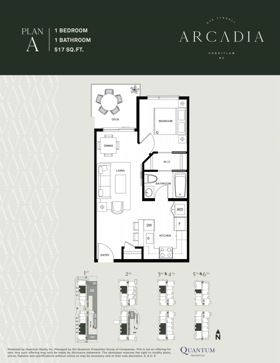 Welcome to Arcadia in Coquitlam West. This well-designed 1 bedroom, 1 bathroom home offers 517 sq. ft. of contemporary living with a functional open-concept layout & one secured underground parking stall included. Bright living & dining areas feature 9’ ceilings, laminate flooring, & central air conditioning. The modern kitchen is finished with quartz countertops, two-tone cabinetry, stainless steel appliances, & soft-close drawers. The bedroom features a walk-in closet & a spa-inspired bathroom with porcelain tile, matte black fixtures, & an undermount sink. Enjoy a private balcony plus amenities including a fitness centre, clubhouse, bike room, playground, & storage. Steps to SkyTrain, parks, & shopping. Only 5% deposit required to secure a home. Presentation Centre: 4 – 555 Clarke Road.