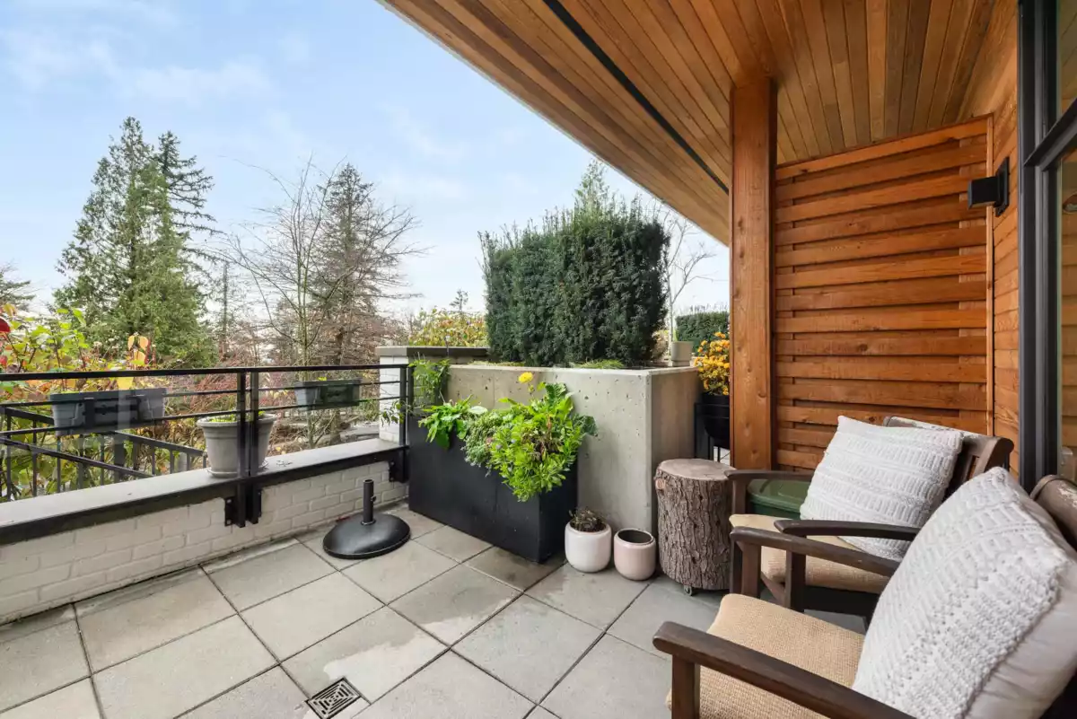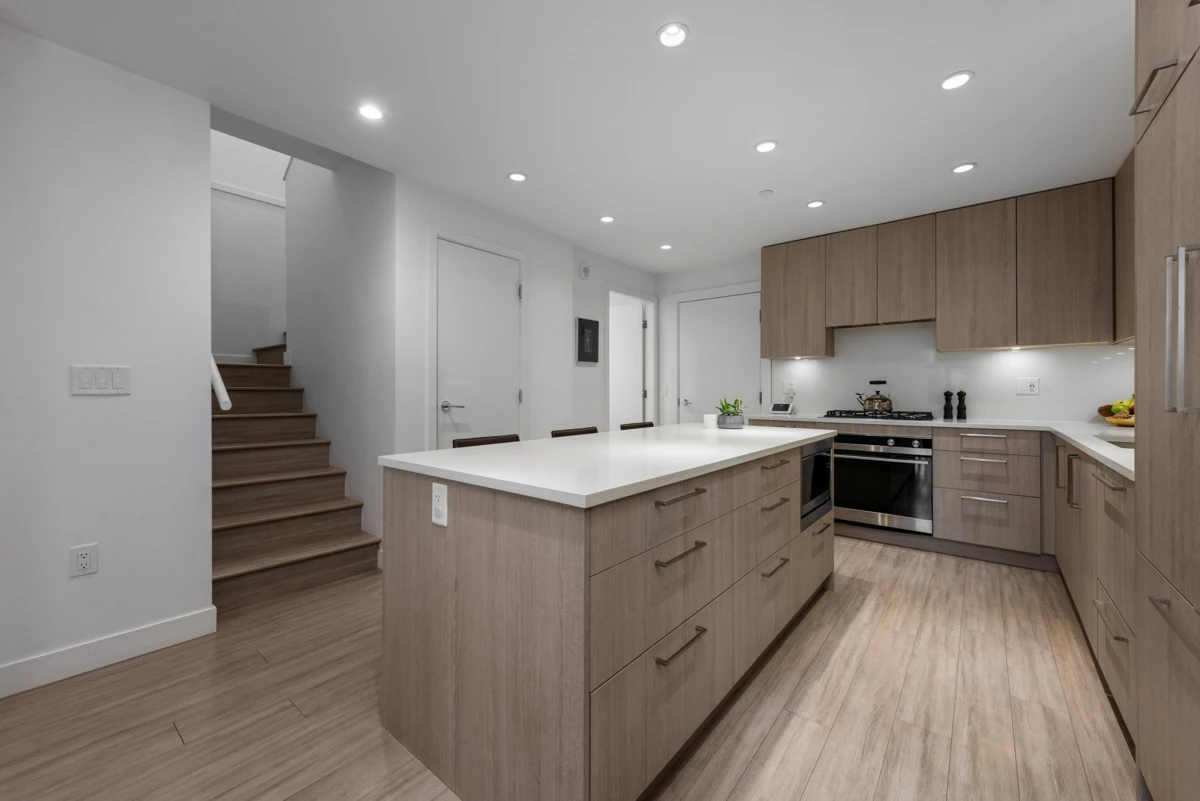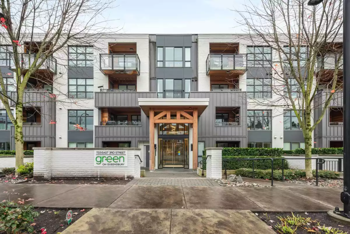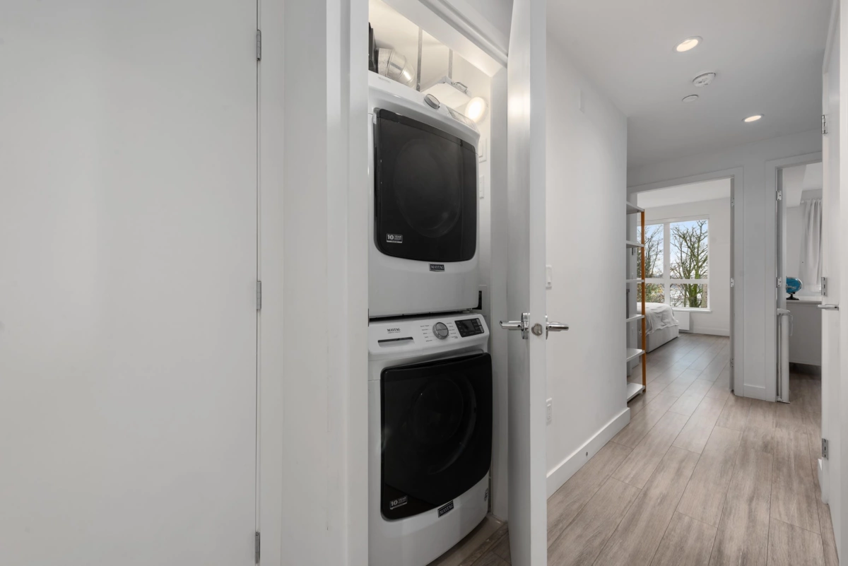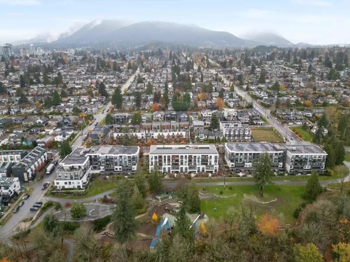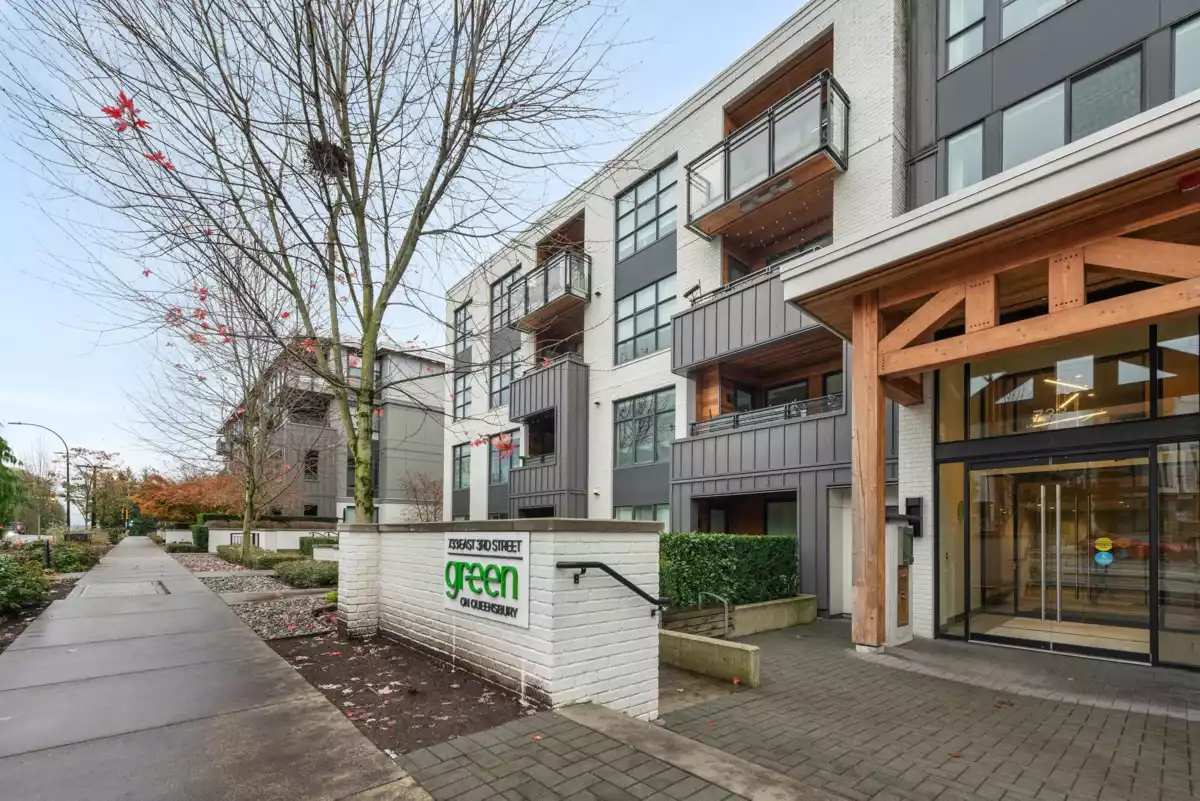 PARKFRONT PERFECTION AT GREEN ON QUEENSBURY– Luxurious 2-level, 3 bed, 3 full bath, 1,548 sq.ft. townhome with private front door opening directly onto Queensbury Park. Enjoy a sunny south-facing patio ideal for morning coffee or evening dining, plus true townhouse ease with direct access from the parkade and your two parking stalls into a practical mudroom—no elevators needed. Inside, an open, light-filled layout features overheight ceilings and a sleek modern kitchen with integrated Fisher & Paykel appliances, pantry, and wine storage. Spa-inspired bathrooms, large closets, and dual California Closets in the main bedroom add everyday comfort. Residents enjoy a fitness centre, guest suite, and social lounge with patio, just steps to the Spirit Trail and Lower Lonsdale.Two storage lockers