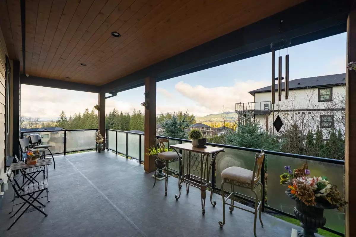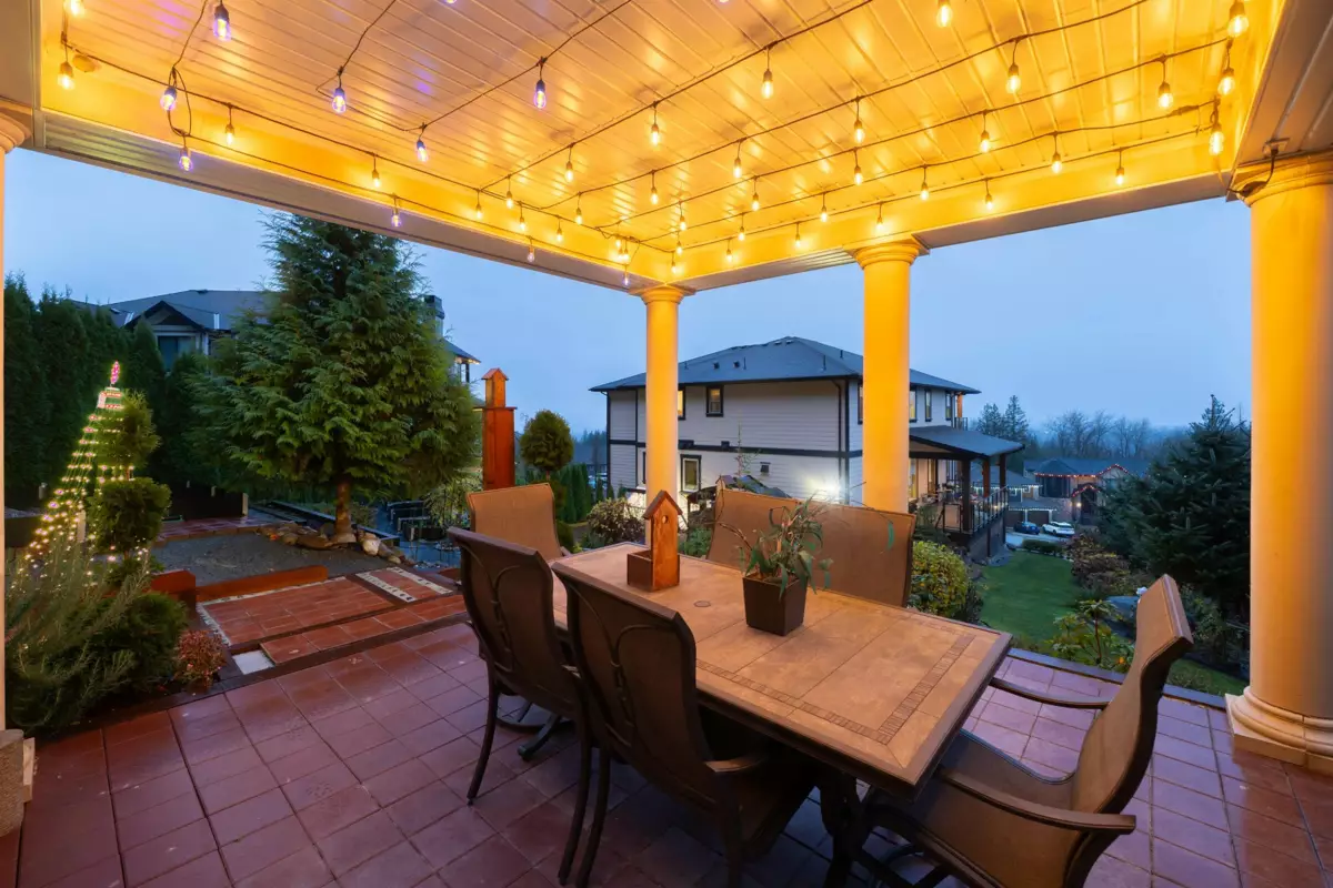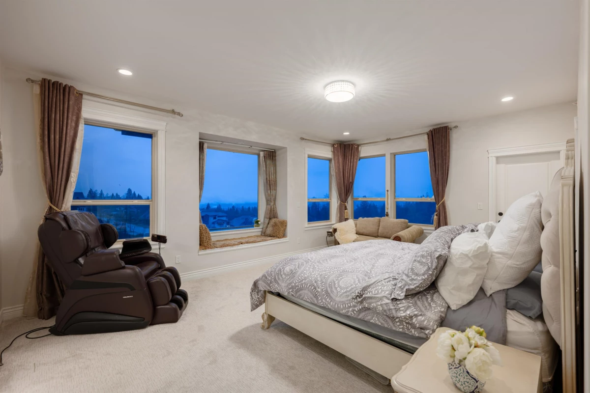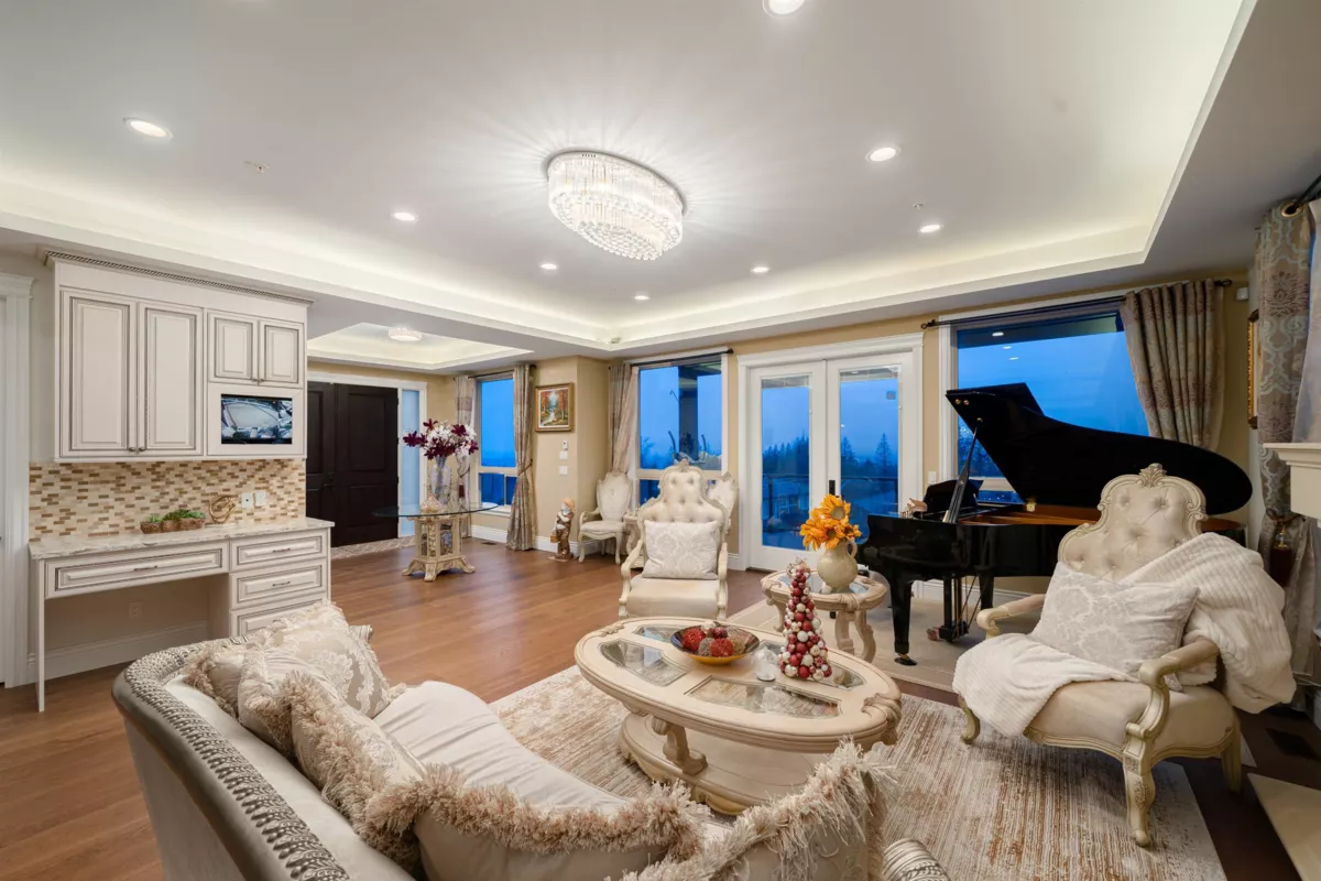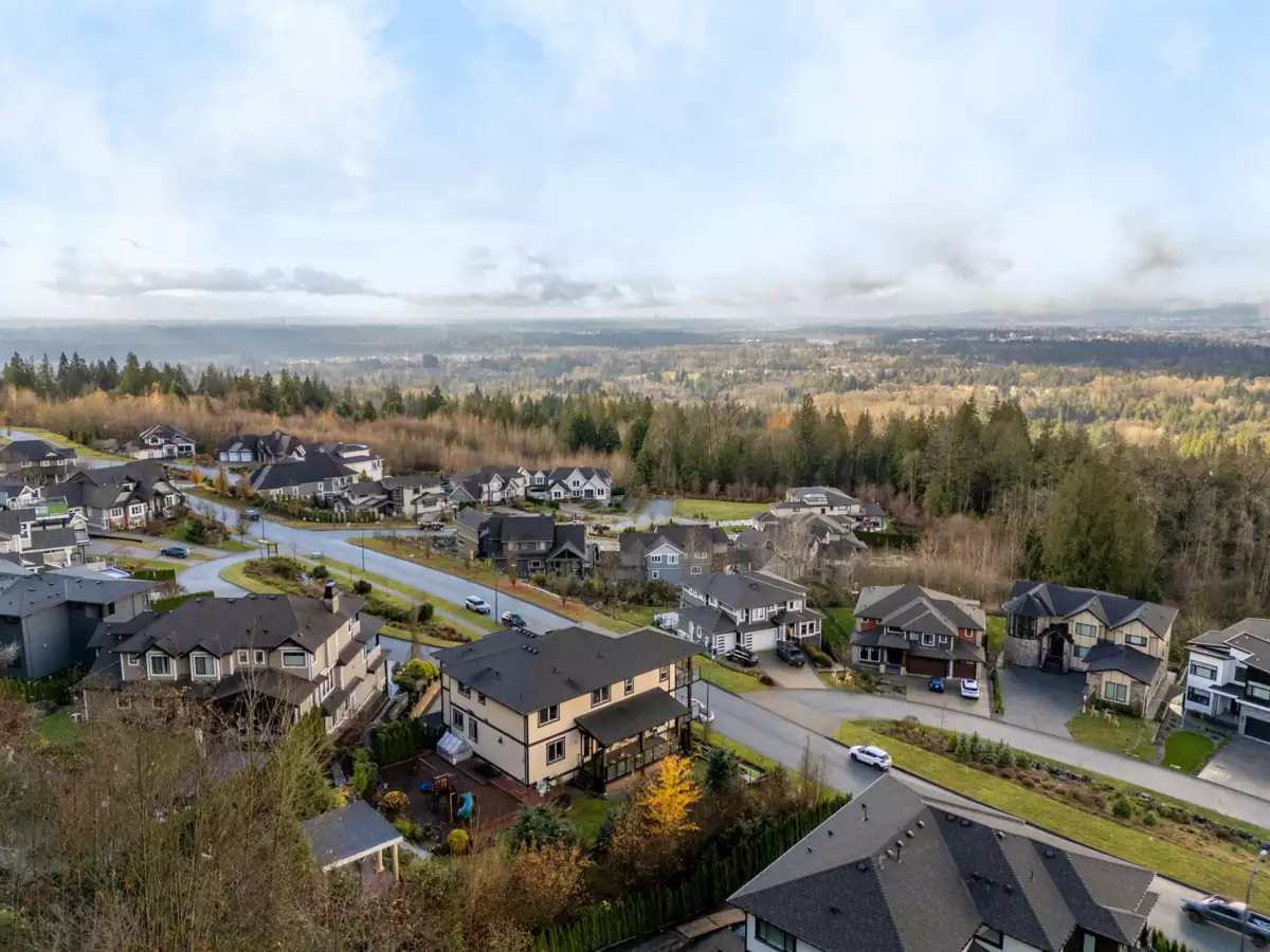 Prestigious Grant Hills Luxury Estate with stunning panoramic views of the Fraser Valley and Golden Ears Mountains. This 5,814 sq. ft. custom home on a 17,119 sq. ft. corner lot features A/C, radiant heat, central vacuum, and a triple garage with extra parking. The open-concept main level offers a bright living room with two wraparound sundecks, an antique-style kitchen with top-quality appliances, a wok kitchen, a primary bedroom with full bathroom, and a guest room/office. Upstairs includes a family room with bar and sundeck, a second primary with spa ensuite and balcony, an office, and three more bedrooms. The basement has a theatre/extra room and a one-bedroom legal suite. Enjoy multiple decks, a playground, rose garden, flower beds, and gazebo. Short drive to Meadowridge School.