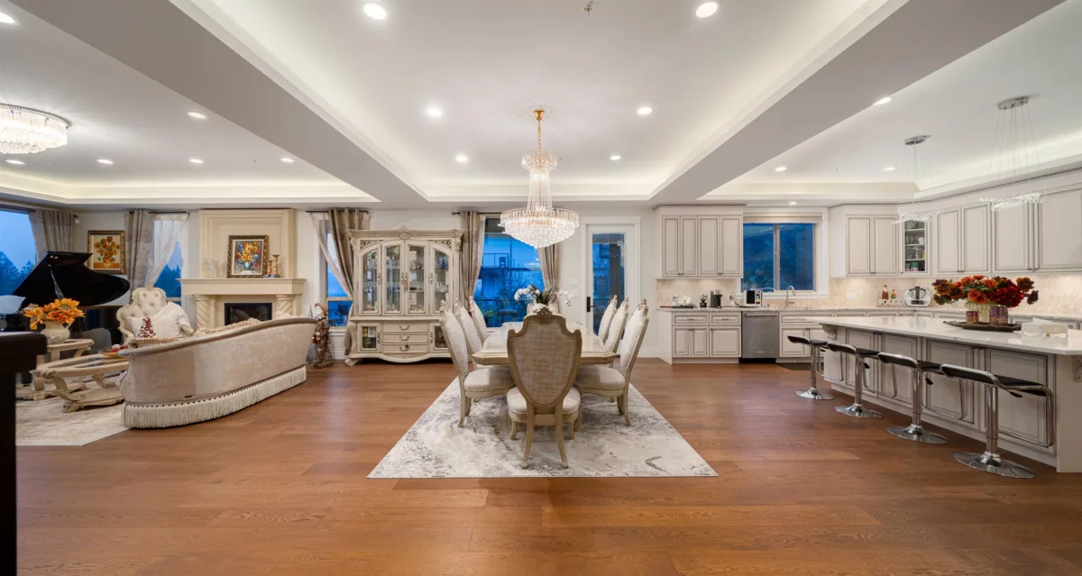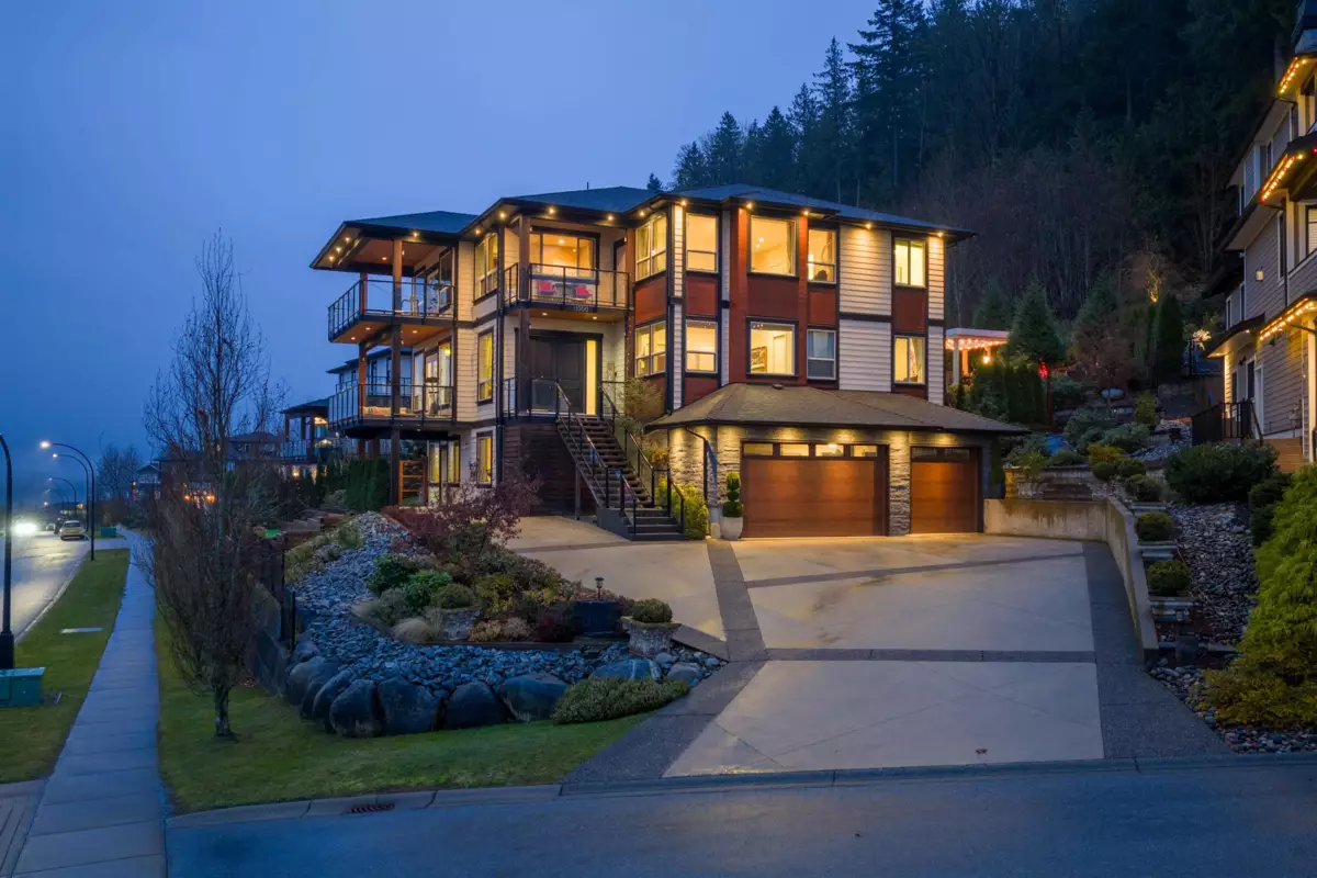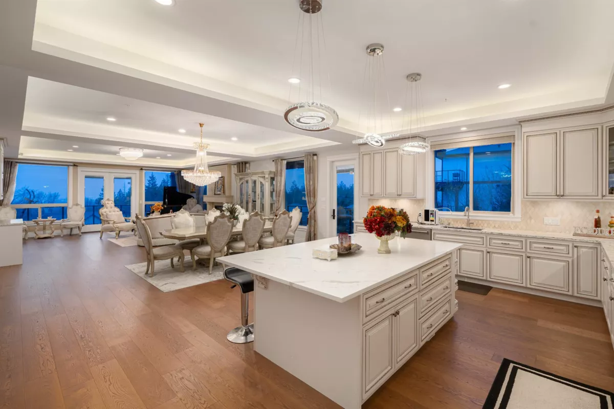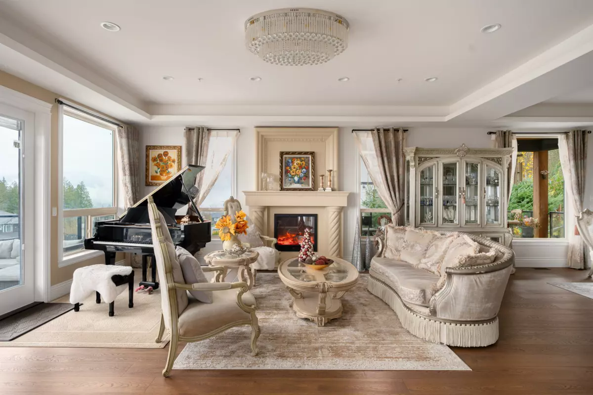 Prestigious Grant Hills Luxury Estate with stunning panoramic views of the Fraser Valley and Golden Ears Mountains. This 5,814 sq. ft. custom home on a 17,119 sq. ft. corner lot features A/C, radiant heat, central vacuum, and a triple garage with extra parking. The open-concept main level offers a bright living room with two wraparound sundecks, an antique-style kitchen with top-quality appliances, a wok kitchen, a primary bedroom with full bathroom, and a guest room/office. Upstairs includes a family room with bar and sundeck, a second primary with spa ensuite and balcony, an office, and three more bedrooms. The basement has a theatre/extra room and a one-bedroom legal suite. Enjoy multiple decks, a playground, rose garden, flower beds, and gazebo. Short drive to Meadowridge School.
