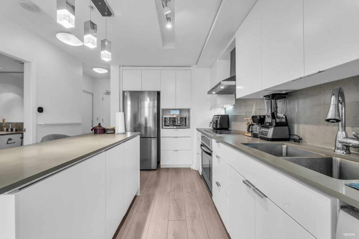 This spacious, open-concept one-bedroom unit offers exceptional value with an efficient layout and no wasted space. Highlights include laminate flooring, a sleek modern kitchen with stone countertops, and stainless steel appliances. The unit provides approximately 591 square feet of indoor living space, complemented by a covered balcony, and is located in Vista Place, a highly sought-after building in Central Lonsdale. Amenities include an exercise room, bike room, amenity room, guest suite, and car wash area. The unit also comes with one parking spot and one storage locker.