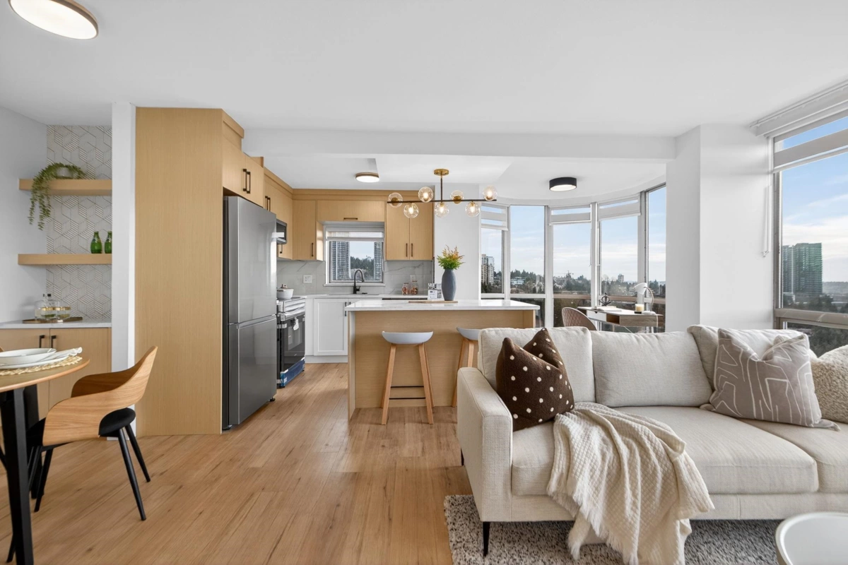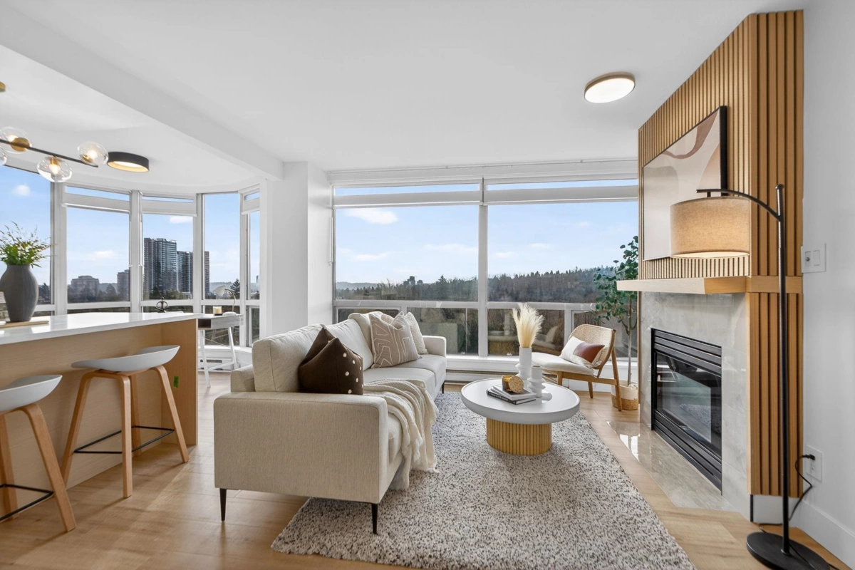 Fully renovated 1,000 SQFT corner unit with 2 bedrooms, 2 full baths, and bright southern views. Floor-to-ceiling windows fill the home with natural light. Upgrades include luxury plank flooring, KCO lighting, new plumbing fixtures, appliances, fresh paint, and 5" insulated Zebra blinds. Features a redesigned gas fireplace with tile and wood paneling, a new kitchen with a 5-ft island and two-tone cabinetry, and modern spa like bathrooms. Includes 1 parking (2nd to rent from strata) and 1 storage locker. A very short walk to Lougheed Mall and the SkyTrain station, with easy access to Highway 1. Amenities: Tennis court, outdoor pool, whirlpool, and sauna. BEST PRICED AND ONE OF A KIND UNIT ON THE MARKET ANYWHERE IN GRVRD. Check it out now! OPEN HOUSE SATURDAY & SUNDAY 2-4.