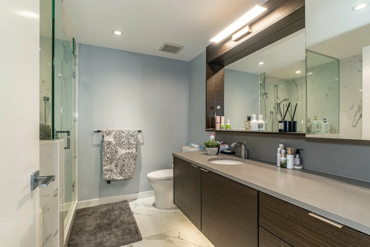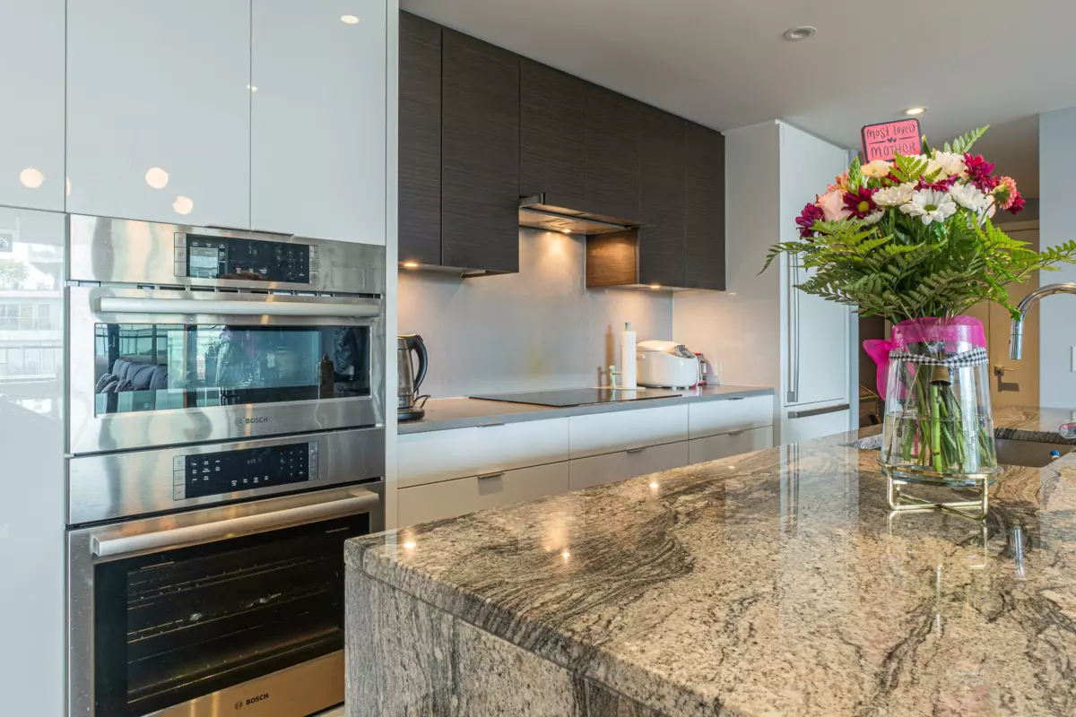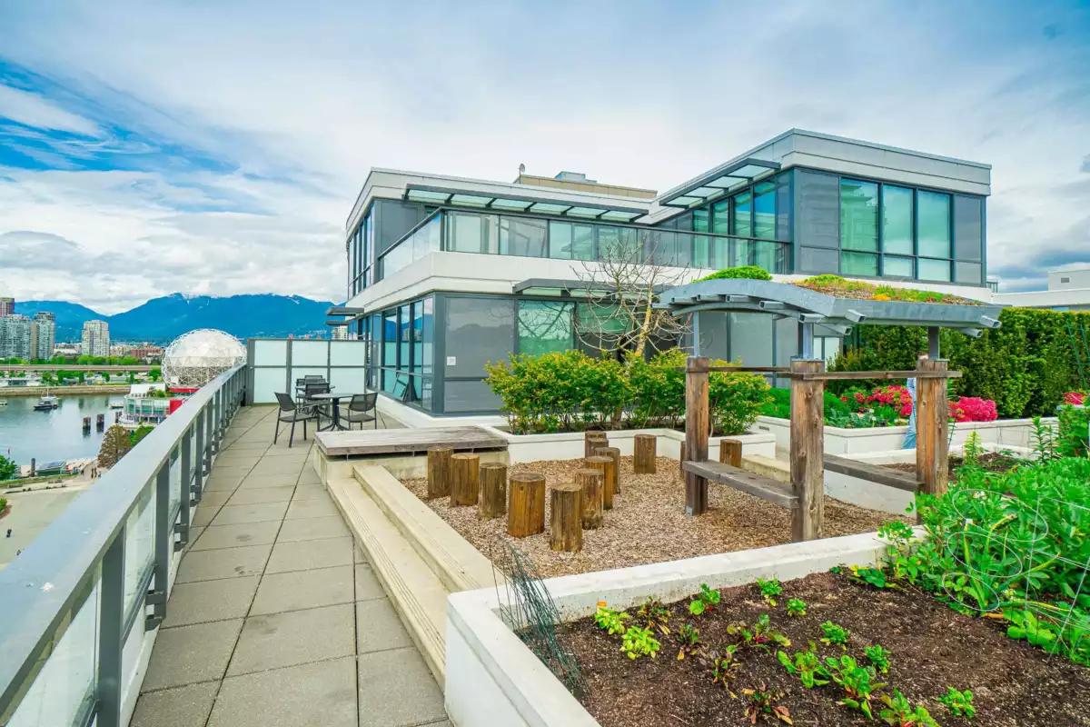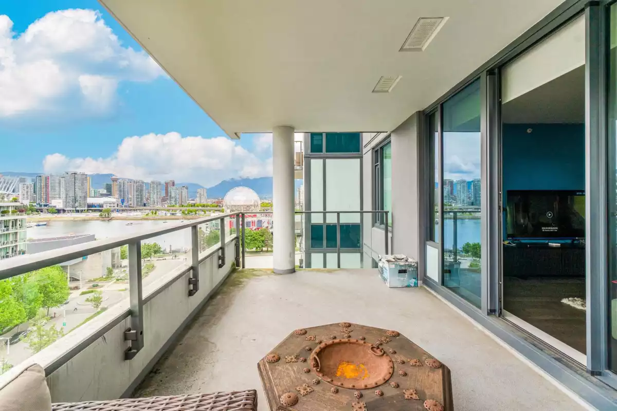 Navio South Tower developed by award winning Concert Properties! Enjoy unobstructed water views of False Creek, mountains, downtown overlooking an expansive 6-acre park. This 1,200 sqft. unit features 2 spacious bedrooms w/ensuites, large living area w/ sliding doors that open up to a 200+ sqft covered patio for indoor/outdoor living. Beautiful large quartz slab waterfall island, engineer hardwood flooring, spa-like bath, air-conditioning. This building boasts amenities such as a fitness centre, full-time concierge, rooftop garden & lounge. Steps from the vibrant Olympic Village neighbourhood,seawall,shops, restaurants at your doorstep.