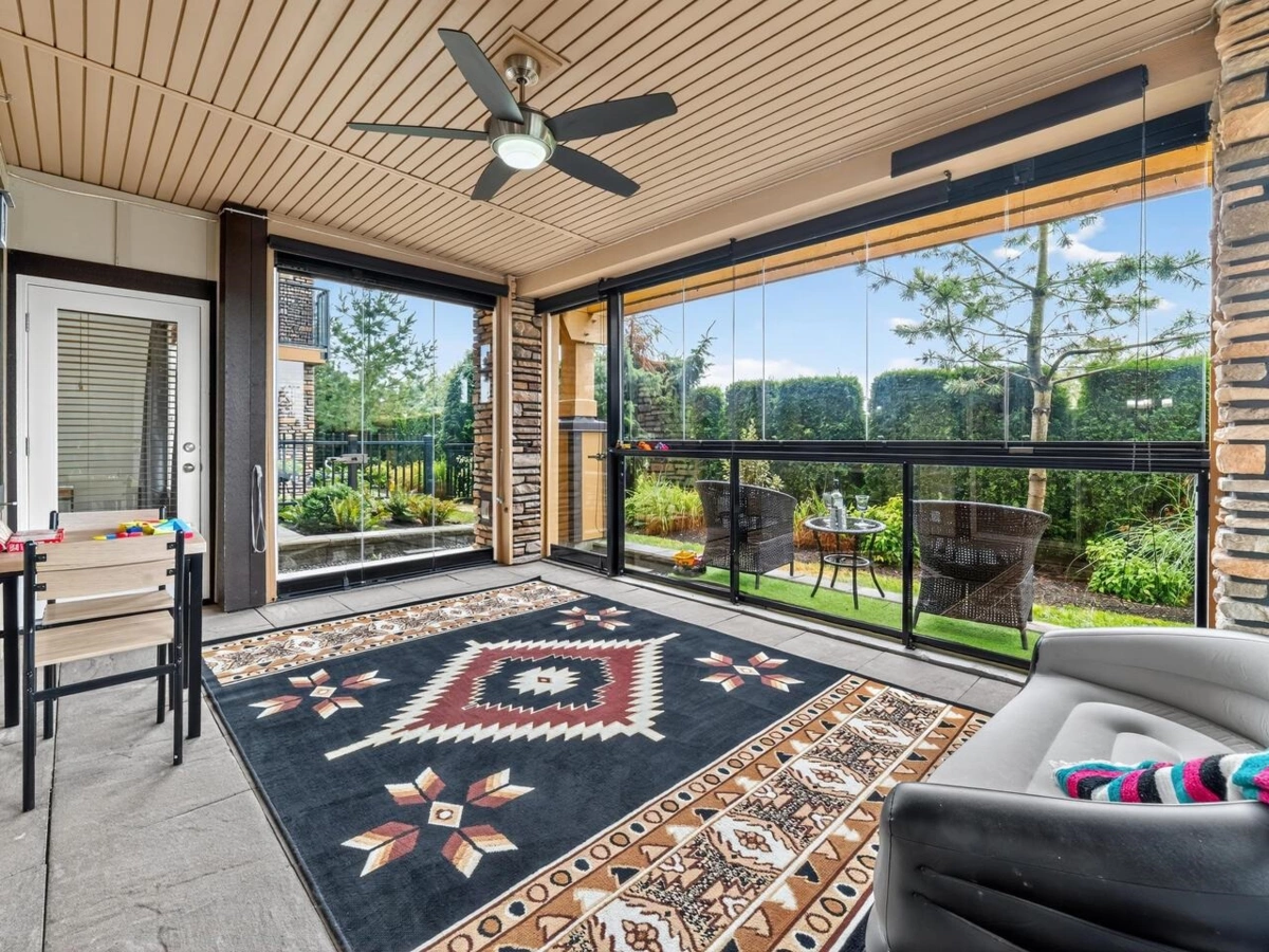 Rare 4 bedroom, 1,804 sqft ground floor condo in sought-after Yorkson! Offers 1,602 sqft of interior living + 202 sqft enclosed solarium w/ retractable glass panels, gas BBQ hook-up, and sound-proofing ceiling insulation - opening to a private grassy area. Primary bedroom with large walk-in closet has a private ensuite w/ in-floor heating, double sinks, and walk-in shower. Second bath has in-floor heating, dbl sinks, walk-in shower + soaker tub, and dual access from bedroom or living room. Kitchen features granite counters, S/S appliances, gas range w/ pot filler, and breakfast bar. A/C, heat pump, electric fireplace. Shaw Cable/Internet (to Mar 2027), and gas incl. in strata. 2 side-by-side parking stalls and 2 storage lockers (1 w/ EV charger capability). Walk to schools/parks/transit.