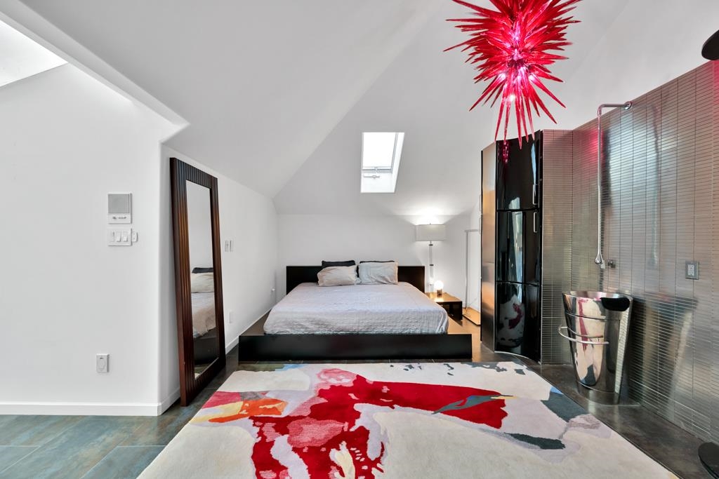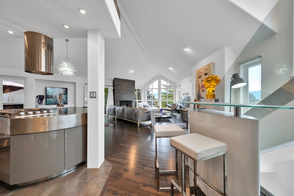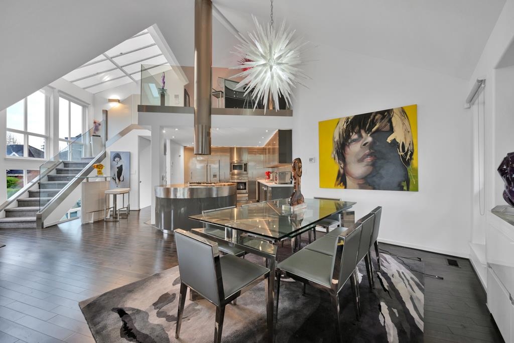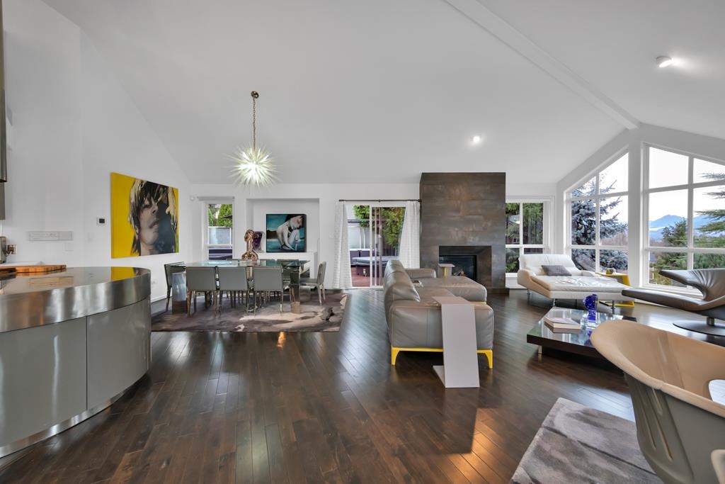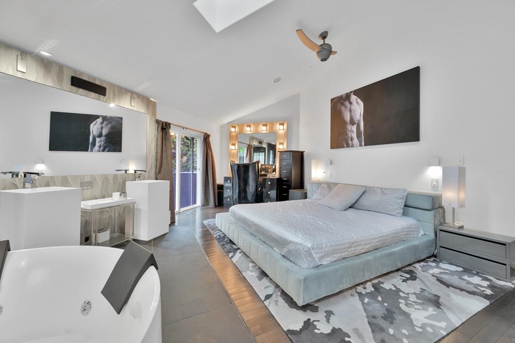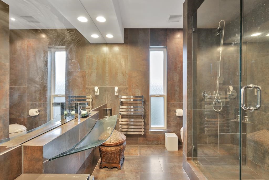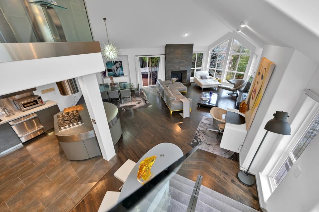 Spectacular contemporary urban gem flooded with natural light and framed by breathtaking mountain views. A dramatic double-height, open-concept living & dining area is crowned by a spacious loft bedroom featuring custom glass railings & skylights. Lavish upgrades and refined finishes throughout include hardwood floors & tiles, air conditioning, custom glass chandeliers, & a designer gourmet kitchen with stainless steel and lacquered cabinetry, quartz countertops, & premium Fisher & Paykel DCS appliances. expansive primary suite/master bedroom offers a true spa-like retreat with a double walk-in shower. Downstairs, is a one-bedroom suite w/ separate access through the double garage great as mortgage-helper potential. TREX deck off the living room, complete w/ a hot tub. Great location!