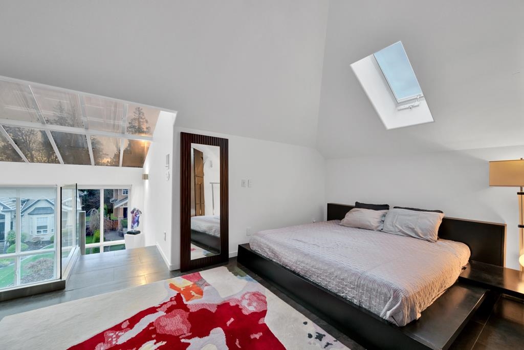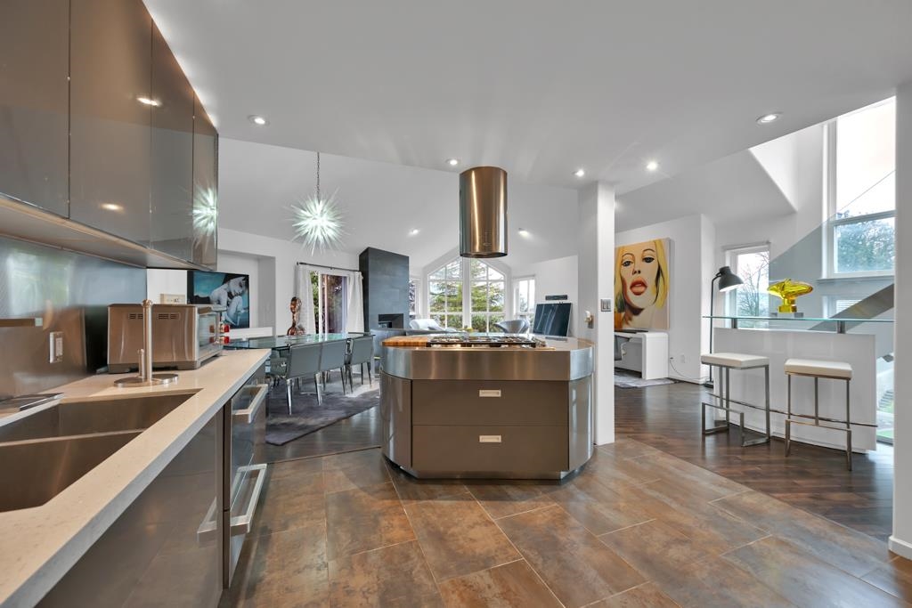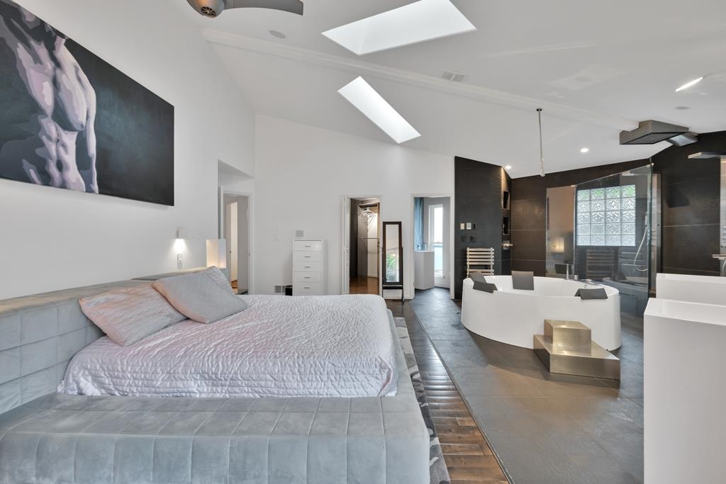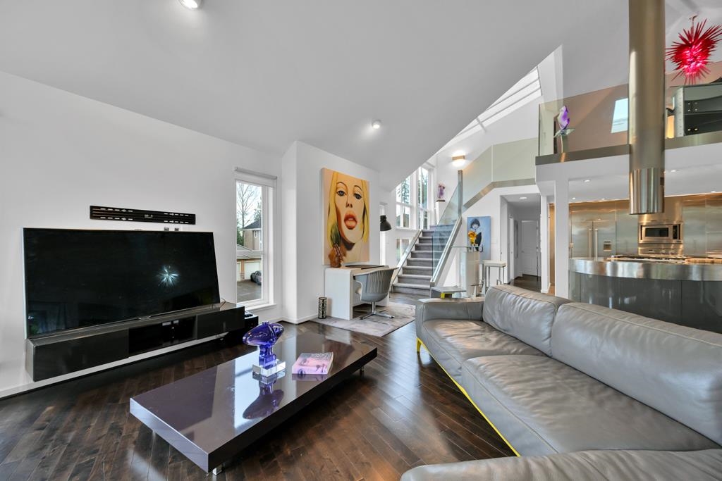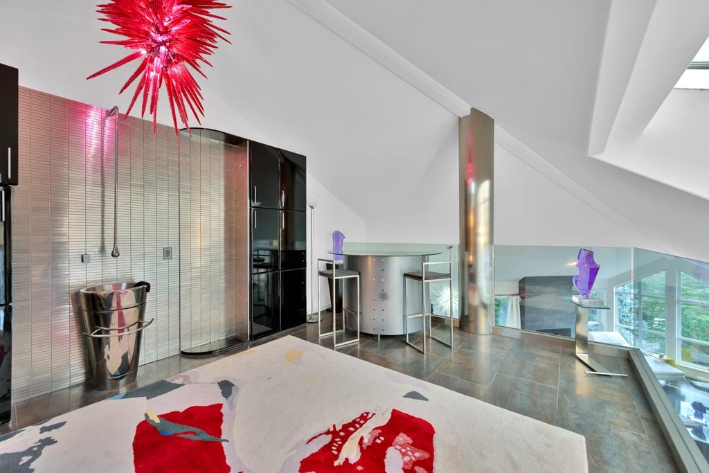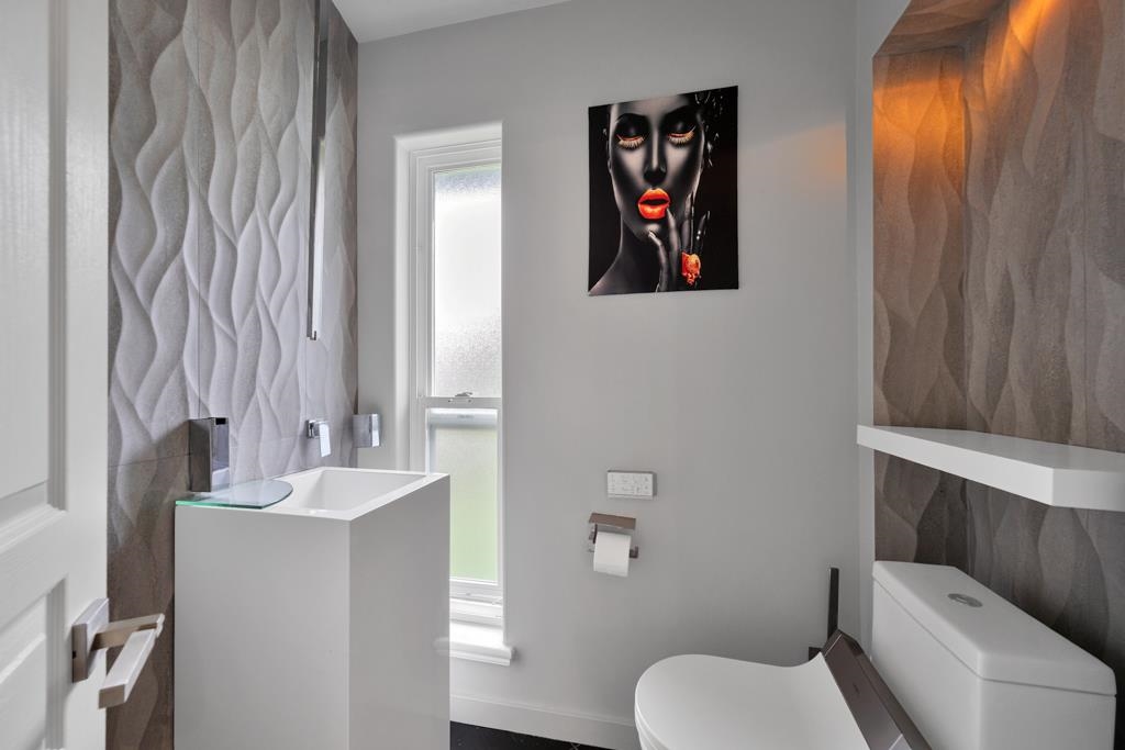Spectacular contemporary urban gem flooded with natural light and framed by breathtaking mountain views. A dramatic double-height, open-concept living & dining area is crowned by a spacious loft bedroom featuring custom glass railings & skylights. Lavish upgrades and refined finishes throughout include hardwood floors & tiles, air conditioning, custom glass chandeliers, & a designer gourmet kitchen with stainless steel and lacquered cabinetry, quartz countertops, & premium Fisher & Paykel DCS appliances. expansive primary suite/master bedroom offers a true spa-like retreat with a double walk-in shower. Downstairs, is a one-bedroom suite w/ separate access through the double garage great as mortgage-helper potential. TREX deck off the living room, complete w/ a hot tub. Great location!