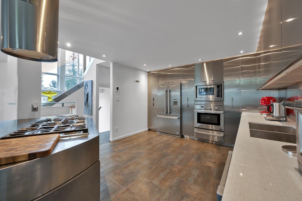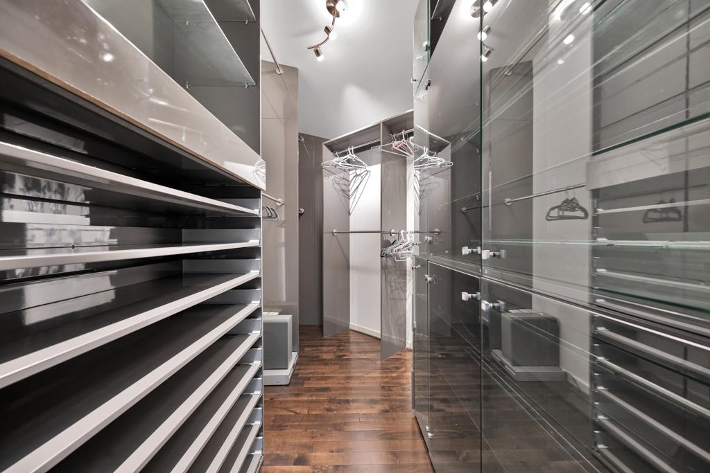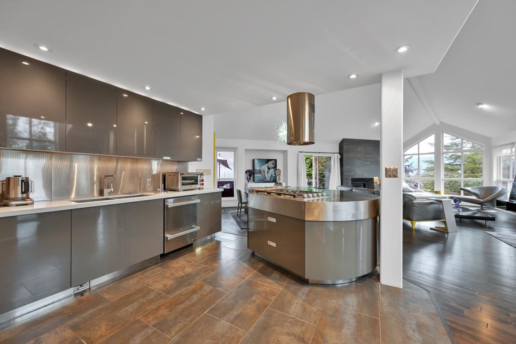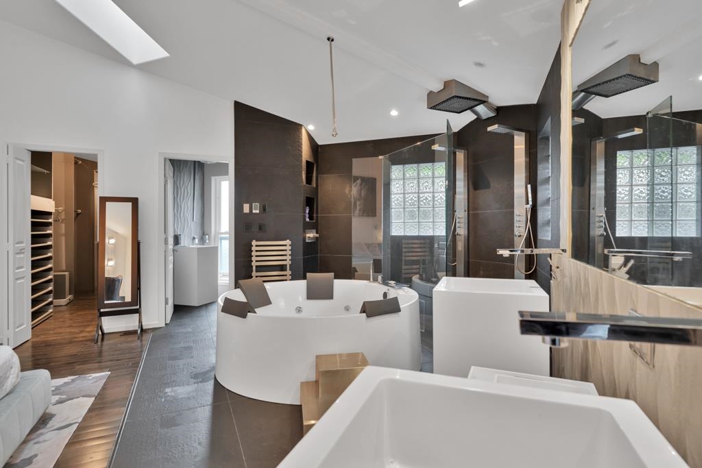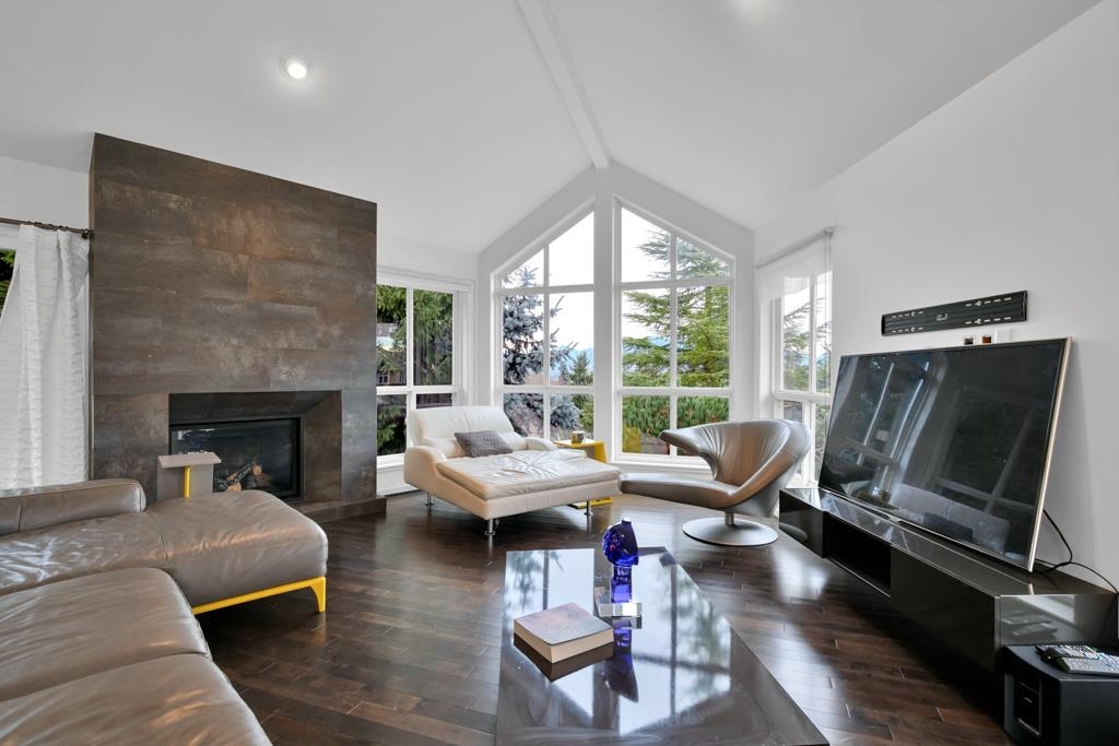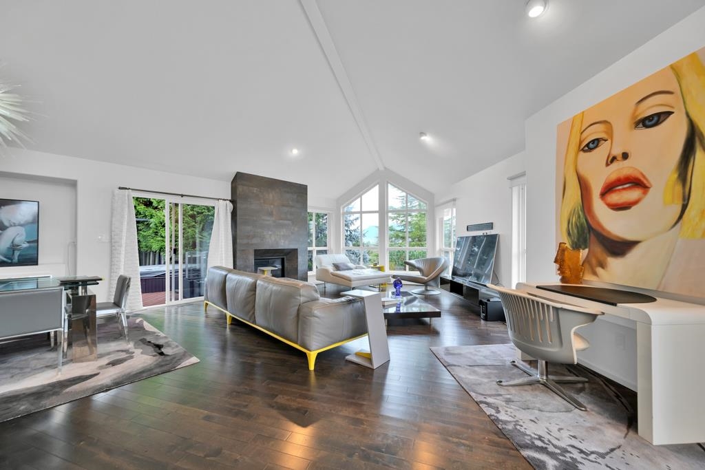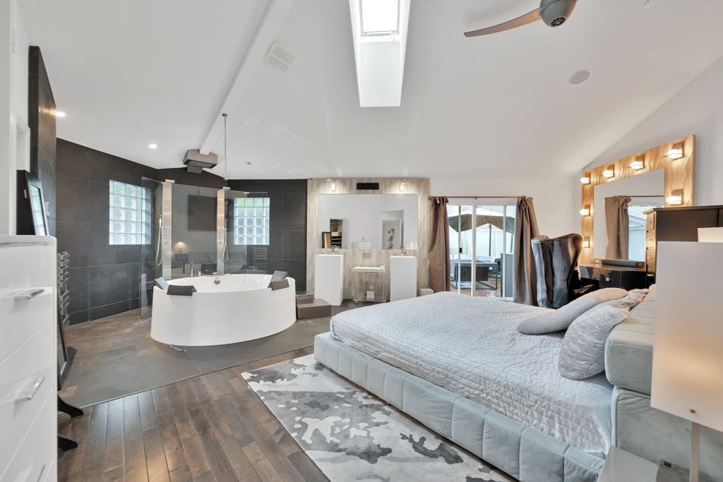 Spectacular contemporary urban gem flooded with natural light and framed by breathtaking mountain views. A dramatic double-height, open-concept living & dining area is crowned by a spacious loft bedroom featuring custom glass railings & skylights. Lavish upgrades and refined finishes throughout include hardwood floors & tiles, air conditioning, custom glass chandeliers, & a designer gourmet kitchen with stainless steel and lacquered cabinetry, quartz countertops, & premium Fisher & Paykel DCS appliances. expansive primary suite/master bedroom offers a true spa-like retreat with a double walk-in shower. Downstairs, is a one-bedroom suite w/ separate access through the double garage great as mortgage-helper potential. TREX deck off the living room, complete w/ a hot tub. Great location!
