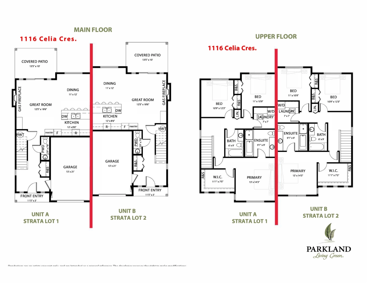 Brand new 2 Storey Duplex in Parkland Phase 4. This 3 bdrm. 2.5 bath, 1720 sq. ft. home is effectively situated on it's own fenced & landscaped 33' x 131' Lot. The Kitchen comes with a stainless steel fridge, stove & dishwasher. The Living room has a cozy natural gas fireplace & opens onto a 13'x10' covered patio. Upstairs is the large Master Bedroom with walk-in closet, and ensuite bath with separate tub & shower (glass surround). There are 2 additional bedrooms, & another 4 piece bathroom. The upstairs Laundry includes the washer & dryer. Includes AIR CONDITIONING. Easy care vinyl siding and a concrete driveway leads to the 13'X21' garage. Walking distance to tennis courts, ball parks, schools, 2 malls & Rec Centre. Eligible for the New Home PTT Exemption & the PRICE INCLUDES GST.