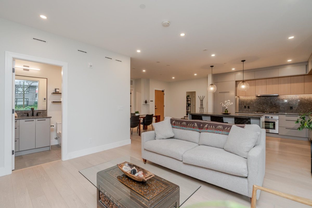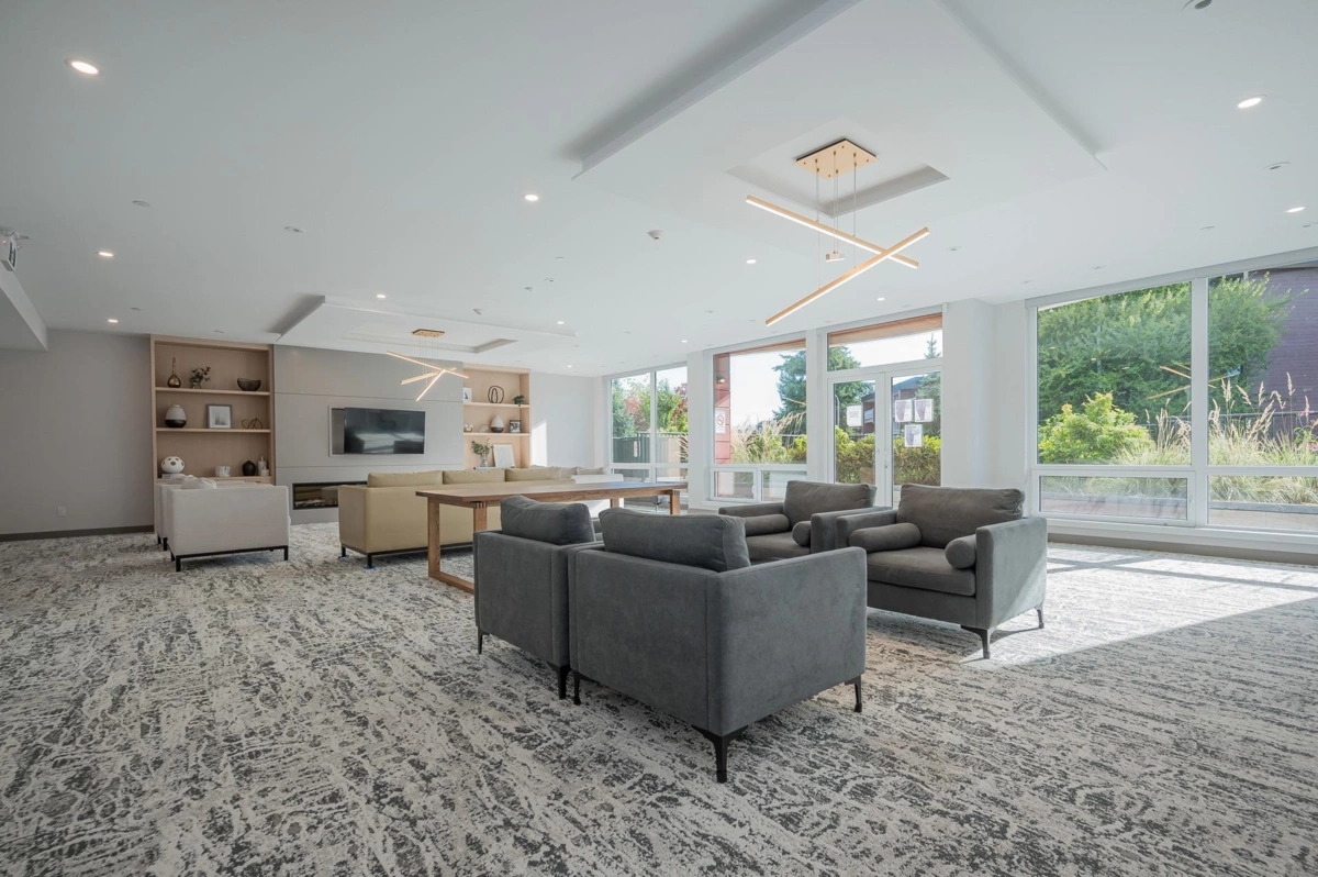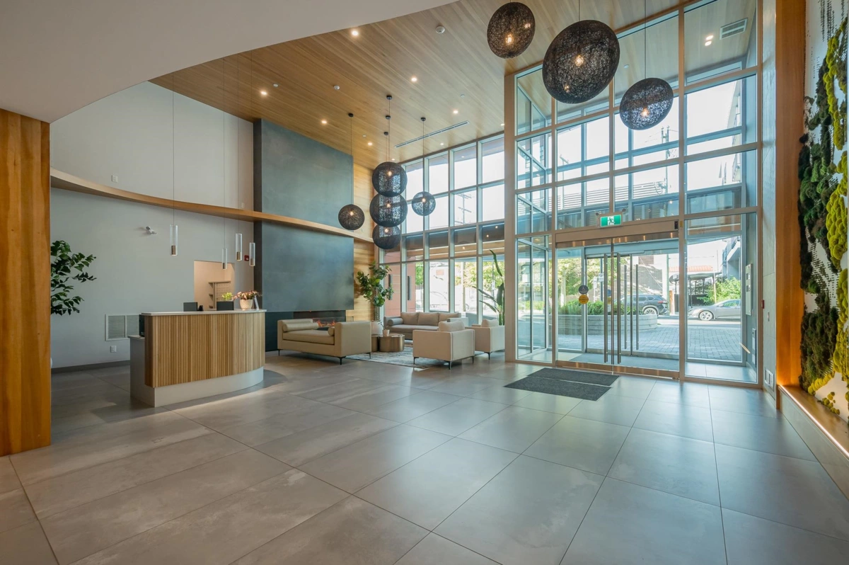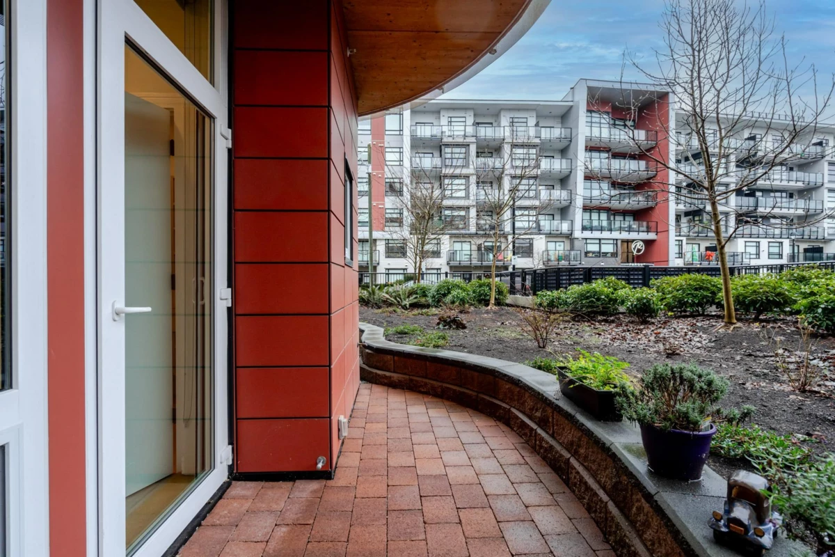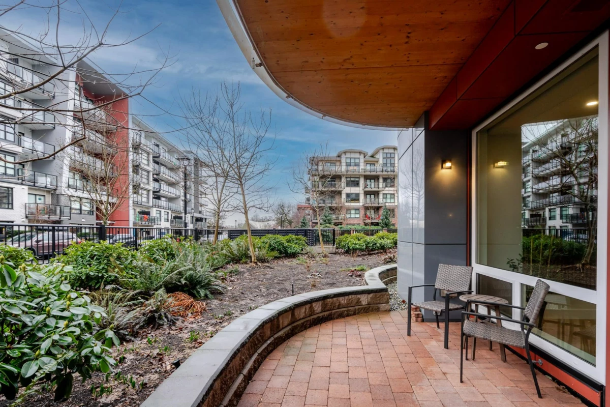 Legacy on Park Avenue! Extra-wide ground-floor corner home with garden space, offering 2 beds & 2 baths with floor-to-ceiling windows throughout. Featuring sound-insulated interiors, air conditioning, 9-ft ceilings, composite hardwood flooring, high-end millwork, this home stands well beyond anything else in Langley. Kitchen boasts Caesarstone countertops and backsplash, modern cabinetry w lighting, undermount sink, & Fisher & Paykel appliances. Striking curved architecture creates an extra-large covered patio, + a bonus 2nd patio off the guest bed, perfectly positioned to enjoy the morning sun. Full concierge building with a two-storey grand lobby, deluxe fitness centre, & an impressive residents’ lounge. Steps to shops, parks + community centre, and just an 8-min walk to future skytrain.