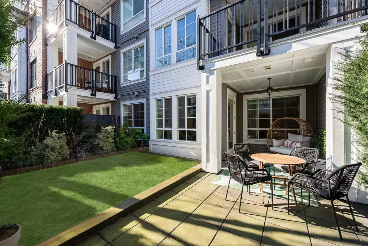 Ground-Level Condo with Private Entry and Expansive Patio at Foster by Mosaic! Offering 2 bedrooms, 2 bathrooms, and over 900 sq ft of spacious living with the convenience of direct patio access to your home! This modern open plan has a generous peninsula kitchen with quartz counters, sleek cabinetry and counter seating for 4. A versatile nook that is perfect for a home office. The living/dining area flows to a massive patio and yard surrounded by lush greenery for ultimate privacy. Bedrooms are located on either side of the living room, and the primary has ample closet space + a 3 piece ensuite. 2 Parking spots + a storage locker. Prime location - centrally located within walking distance to the Skytrain, Safeway, shops and restaurants + quick access to Lougheed Town Centre and Highways.