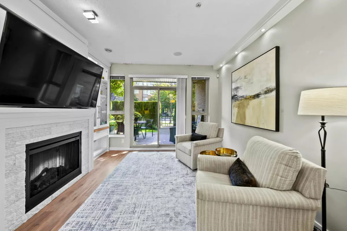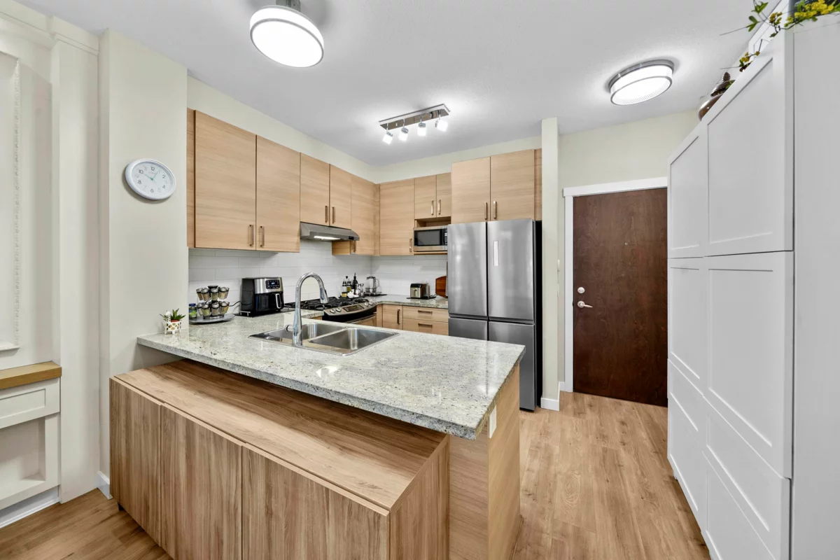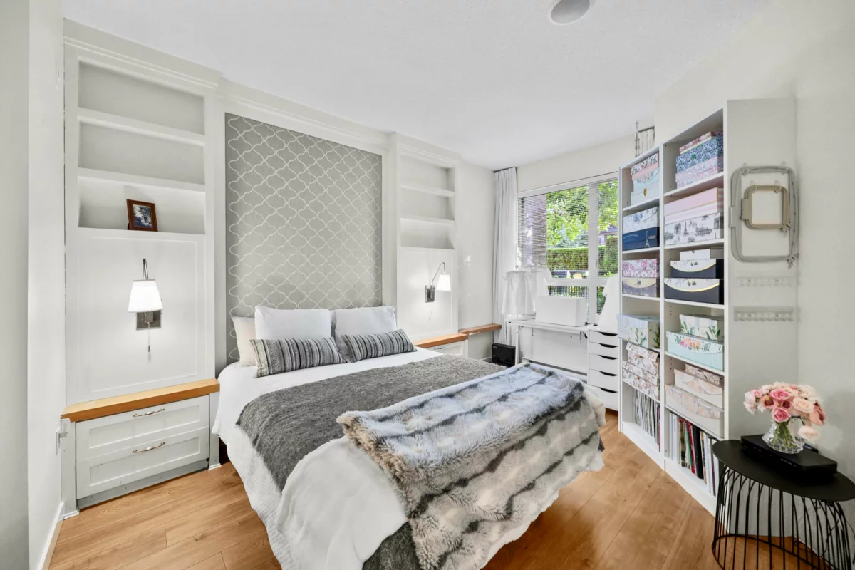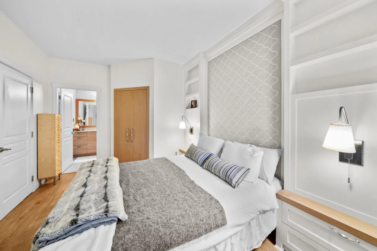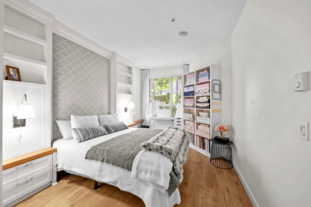 This STUNNING former "Show Home" is MOVE IN READY!! The "Thomas house" built by Polygon is a 2 bed/2 bath ground floor home featuring upgrades throughout: sophisticated built-ins, natural wood highlights, designer wallpaper, large framed mirrors, custom designed headboard featuring built-in side tables with lights, new flooring and more! BONUS: 9' ceiling, gas stove, storage locker, EV charging, LARGE patio w/ fenced yard - perfect for pets/kids! Residents also have access to the private Nakoma Clubhouse, which features over 18,000 sq. ft. of resort-style amenities: basketball/badminton court, outdoor pool, gym, guest suites, & yoga area. Located near trails, schools, parks, Skytrain, & more. Open house: Sunday, January 18th from 12 - 1:30pm