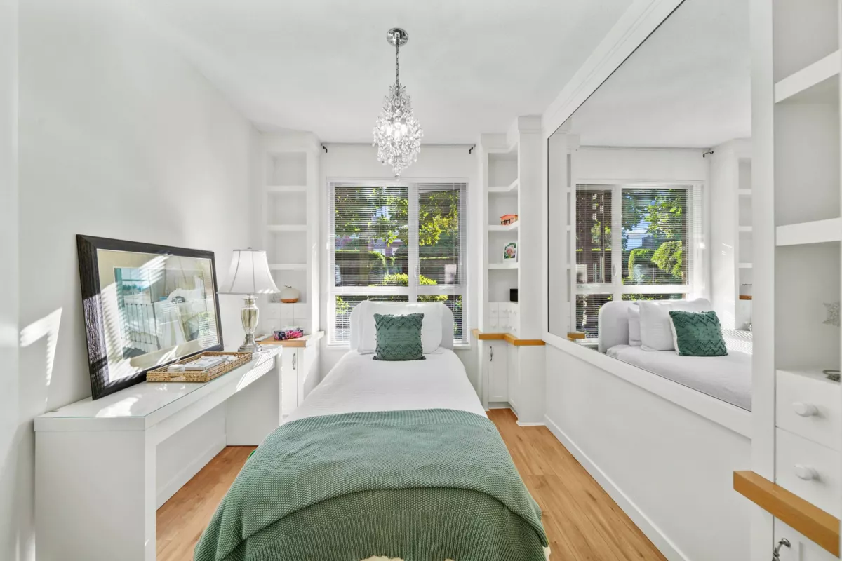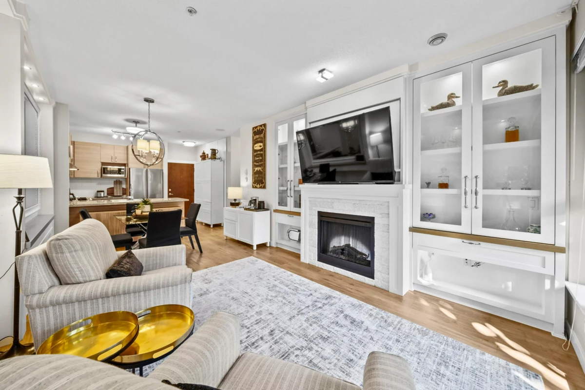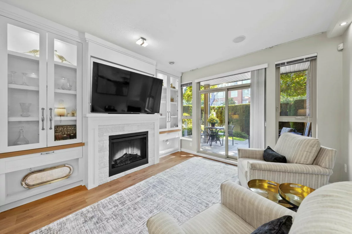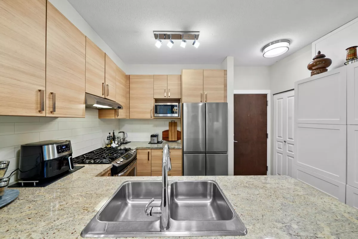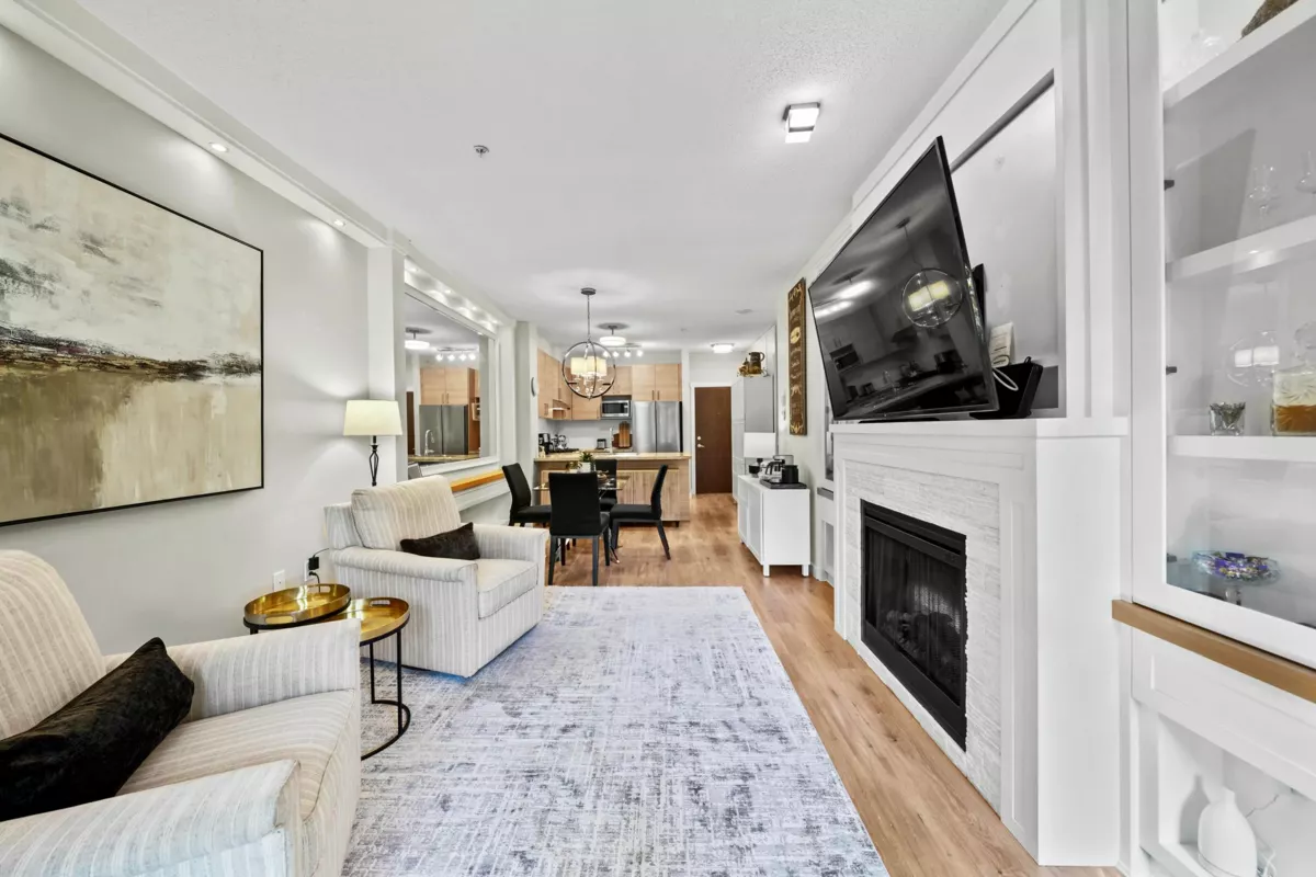 This STUNNING former "Show Home" is MOVE IN READY!! The "Thomas house" built by Polygon is a 2 bed/2 bath ground floor home featuring upgrades throughout: sophisticated built-ins, natural wood highlights, designer wallpaper, large framed mirrors, custom designed headboard featuring built-in side tables with lights, new flooring and more! BONUS: 9' ceiling, gas stove, storage locker, EV charging, LARGE patio w/ fenced yard - perfect for pets/kids! Residents also have access to the private Nakoma Clubhouse, which features over 18,000 sq. ft. of resort-style amenities: basketball/badminton court, outdoor pool, gym, guest suites, & yoga area. Located near trails, schools, parks, Skytrain, & more. Open house: Sunday, January 18th from 12 - 1:30pm