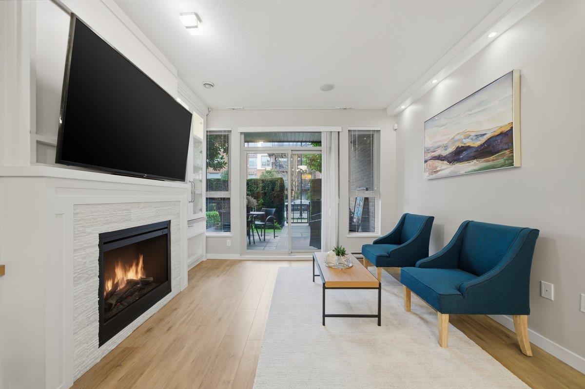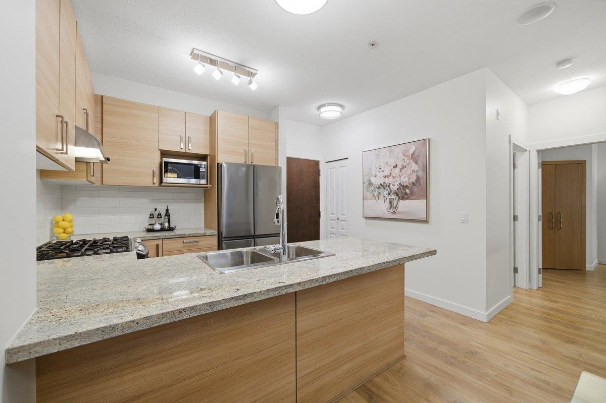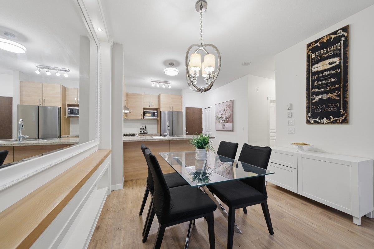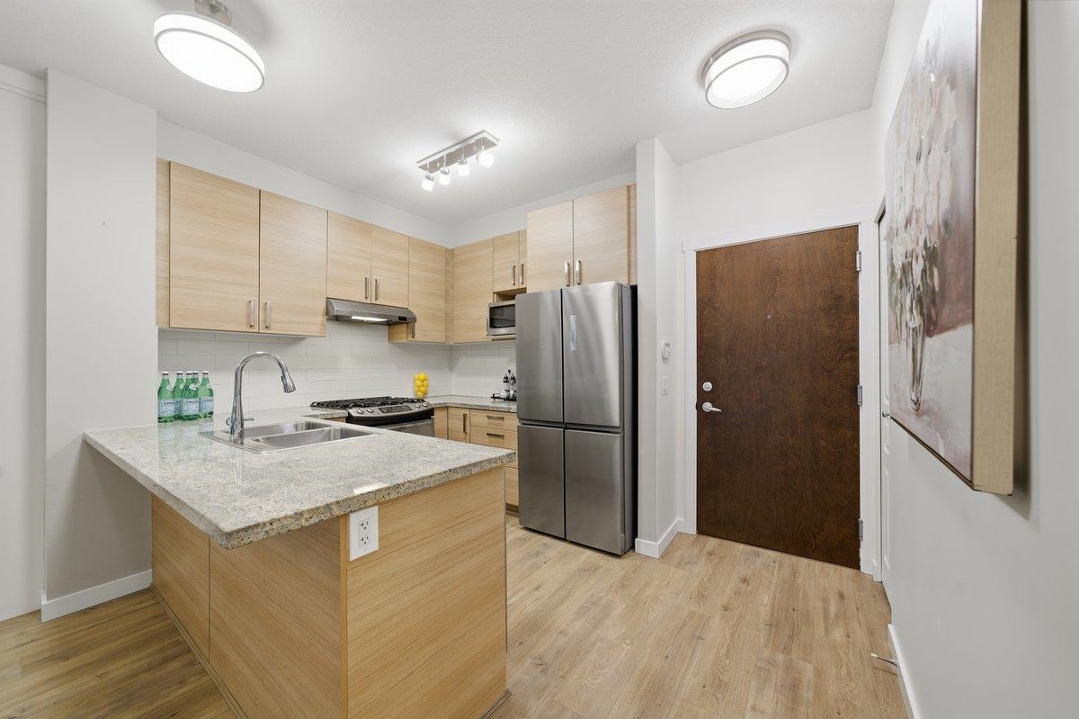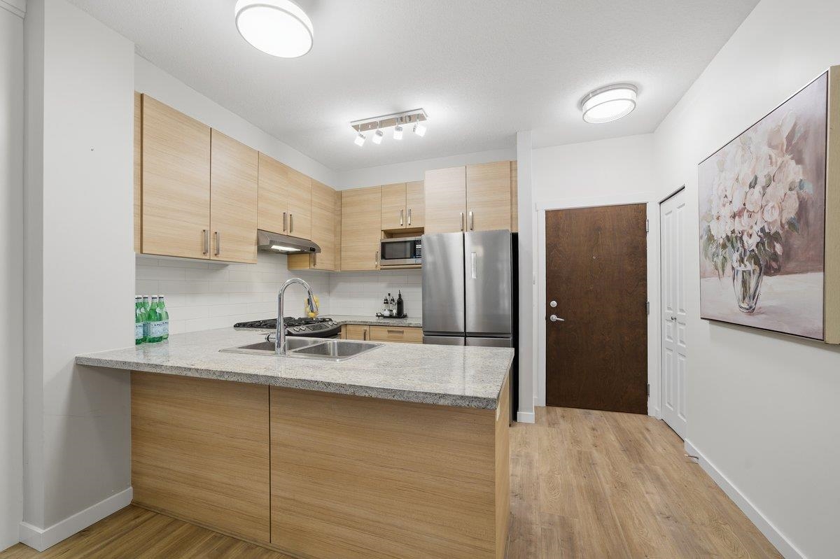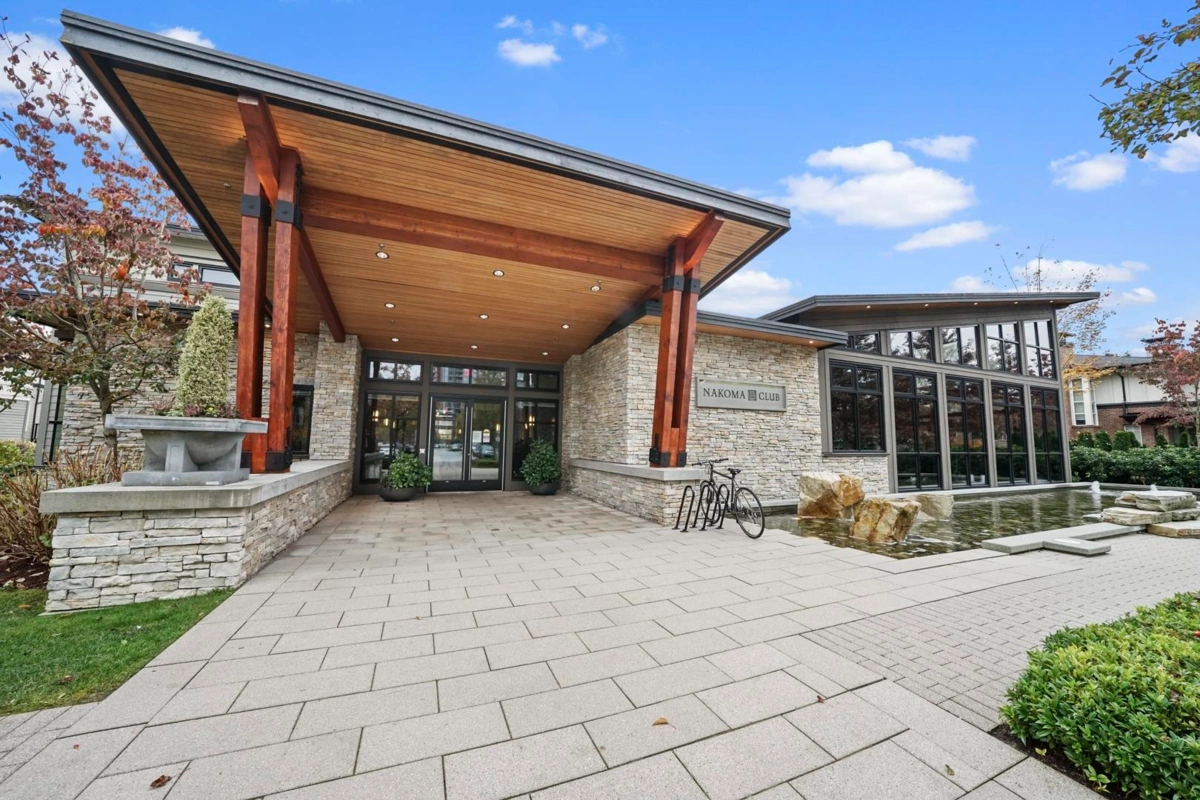 This STUNNING former "Show Home" is MOVE IN READY!! The "Thomas house" built by Polygon is a 2 bed/2 bath ground floor home featuring upgrades throughout: sophisticated built-ins, natural wood highlights, designer wallpaper, large framed mirrors, new flooring and more! BONUS: 9' ceiling, gas stove, storage locker, EV charging, LARGE patio w/ fenced yard - perfect for pets/kids! Residents also have access to the private Nakoma Clubhouse, which features over 18,000 sq. ft. of resort-style amenities: basketball/badminton court, outdoor pool, gym, guest suites, & yoga area. Located near trails, schools, parks, Skytrain, & more. Open house: Saturday, February 7th from 2:30 - 4:30pm.