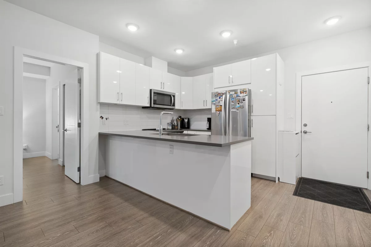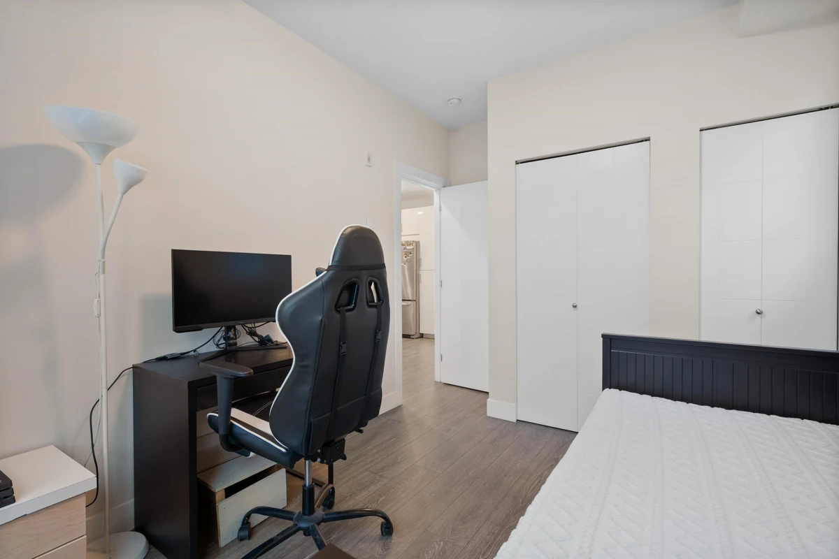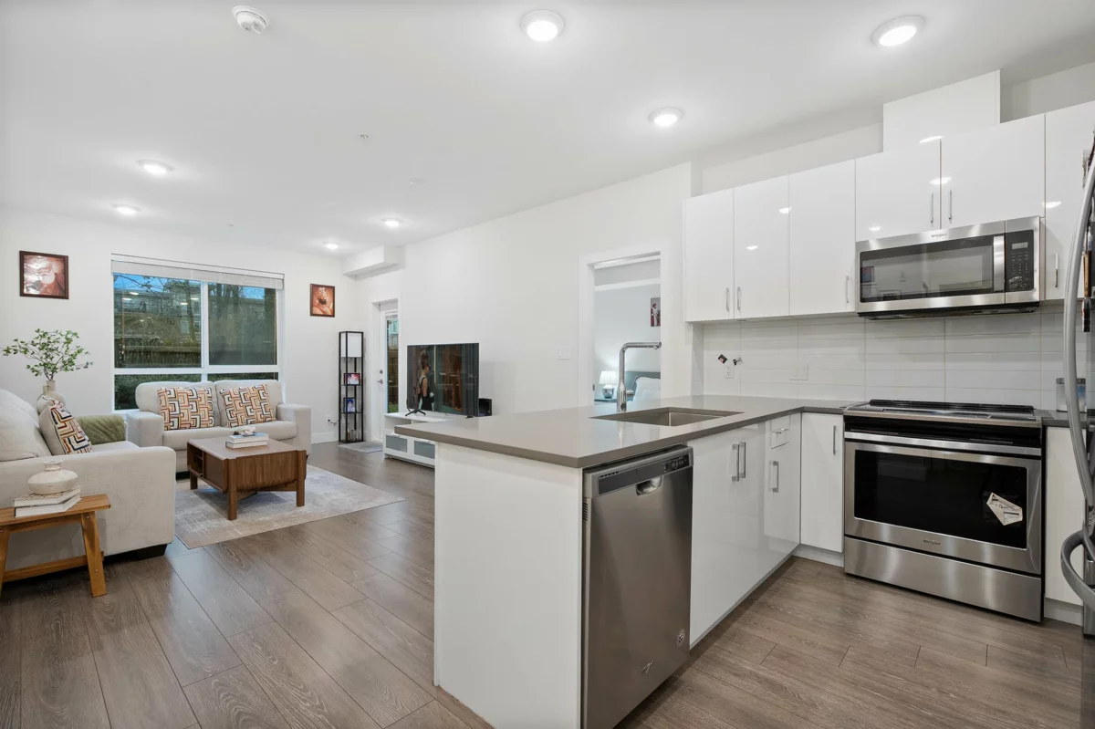 Location, location, location! Ideal for first-time buyers or investors. Brand new ground-floor 2 bed, 2 bath condo at The Guildford by Tangerine Developments featuring a private fenced backyard and patio, perfect for kids and pets. Functional layout with two entrances, full-size laundry, spacious bedrooms with walk-in closets, and modern finishes. Stainless steel Whirlpool appliances. Excellent amenities include a recreation room with TV lounge, kitchen and pool table, well-equipped gym, and guest suite. One underground parking stall plus ample street parking. 5-storey low-rise West Coast contemporary building. Steps to Guildford Mall, shopping, schools, and transit.