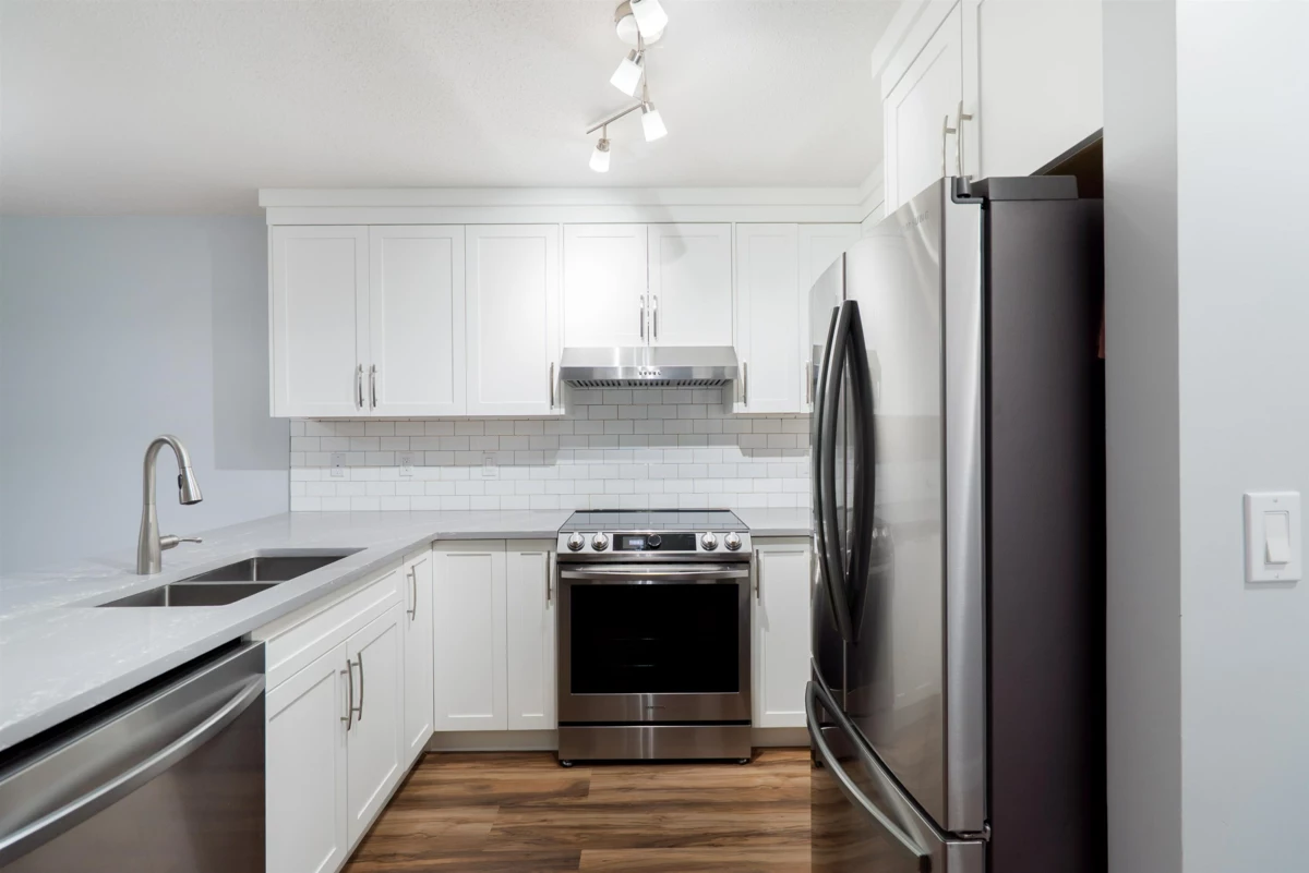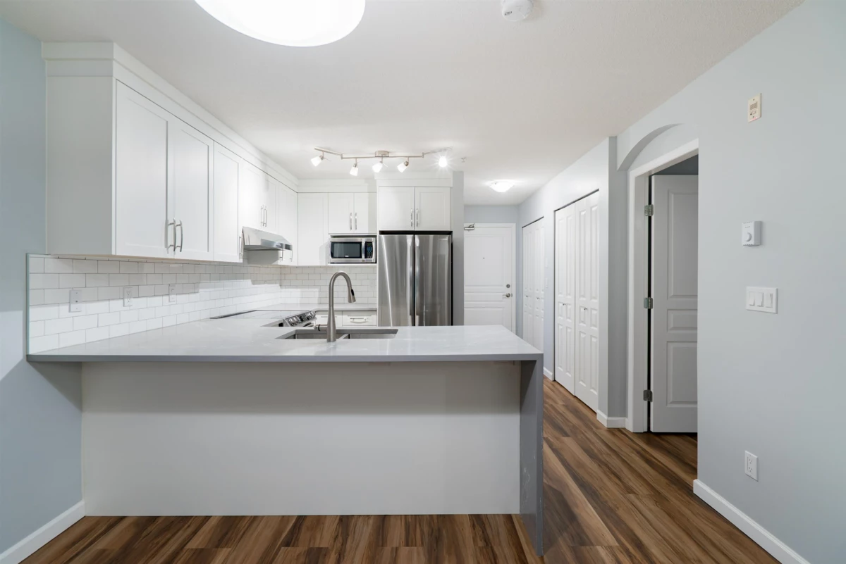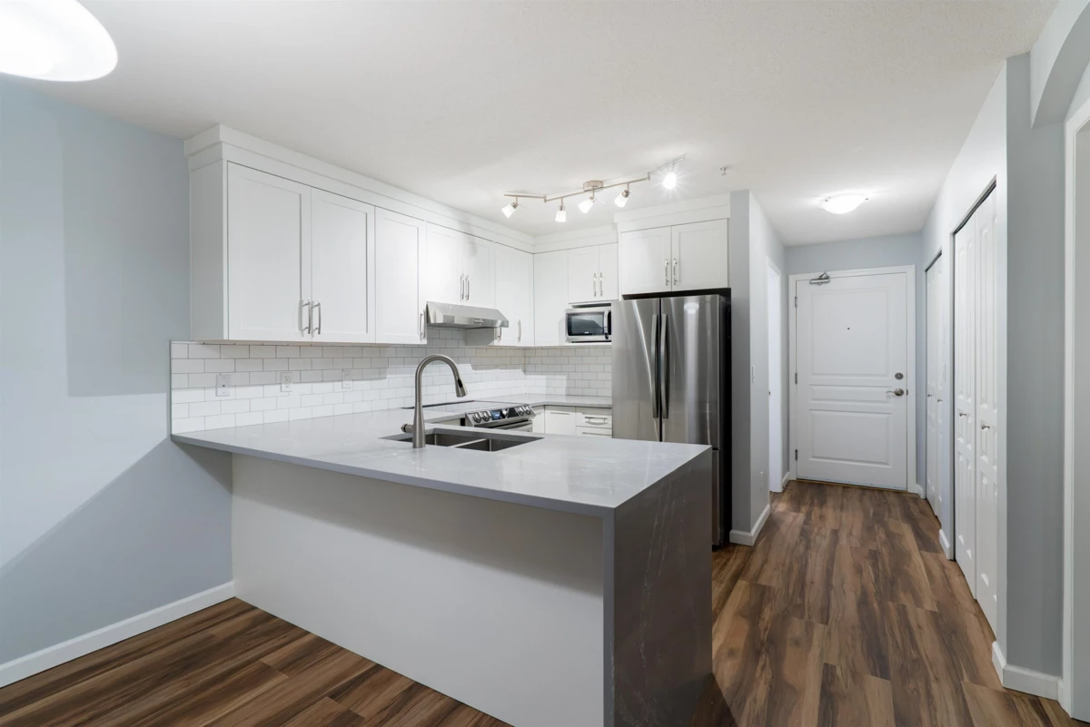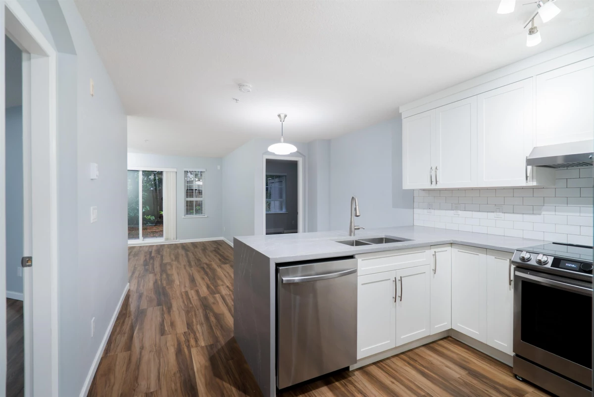 Welcome to Strathmore Lanes! Built by reputable Leddingham McAllister, this fully renovated 2 bed & den home with a huge walk out yard will impress the minute you walk through the door. Quality updates include custom kitchen cabinetry with thoughtful made-to-order inner storage solutions and a quartz waterfall countertop, fully renovated bathrooms with detailed tile work in both showers, LVP flooring, and fresh paint and lighting. Kids and dog lovers will love the MASSIVE fully fenced walk out yard. Tucked away on a quiet side street but located steps to anything you need - Skytrain, Lougheed mall, amazing restaurants, and the new Cameron Community Center. Pet friendly building (2 dogs or 2 cats allowed) with 1 storage locker & 1 parking included. Book your showing today!