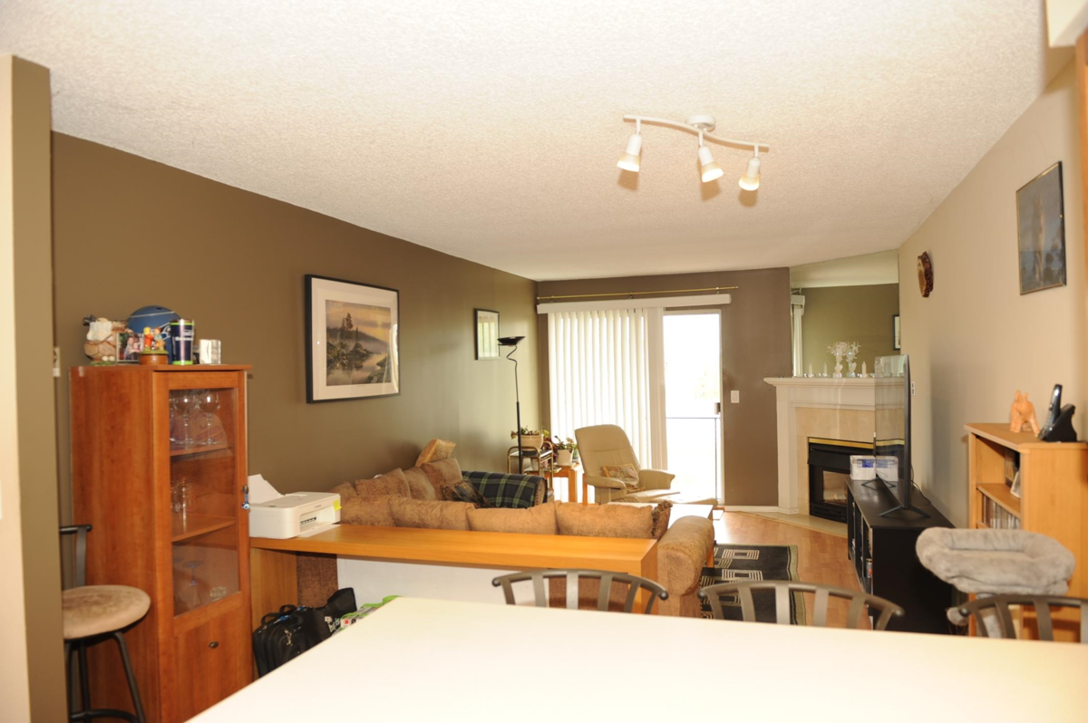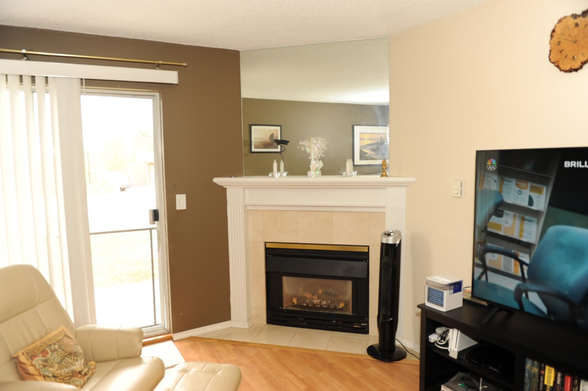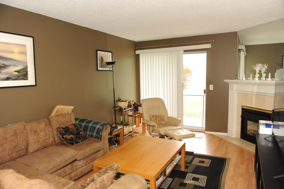 Fraser view at Riverside. Large 1 Bdrm, 1 Bathrm ground level unit with a view of Fraser River. Kitchen with oak cabinets, dining rm, living rm with gas fireplace & sliding door to patio with view of the Fraser River, adult 55+ complex. Unit has its own laundry, storage room which could be used as a den. Pet friendly, guest suite and activity room for parties. Close to shopping, West Coast Express, transportation & across from Brickwood Park & tennis courts.