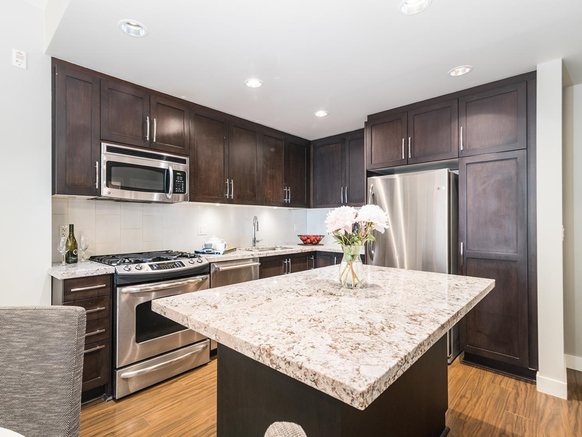 This Elegant 2bd 2 bath unit tucked in a tranquil location of Grandview Heights & offering a beautiful private oasis. The open concept design offers lots of natural light, marble & granite island, tons of storage, SS appliances, gas stove. With a warm inviting colour palate, undercounter lighting this inviting unit needs to be seen. You will love the private walk out covered patio to enjoy the morning sun. Bonus office & huge amenity room to rent, Bike room, Fitness room, storage & 1 UG parking with lots of visitor parking. Centrally located near shopping, restaurants, transit, commuter routes and the perfect place to call home. Furniture can be included. Put this one on your list. Come take a look