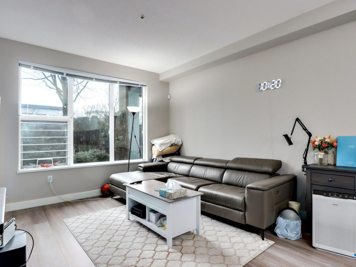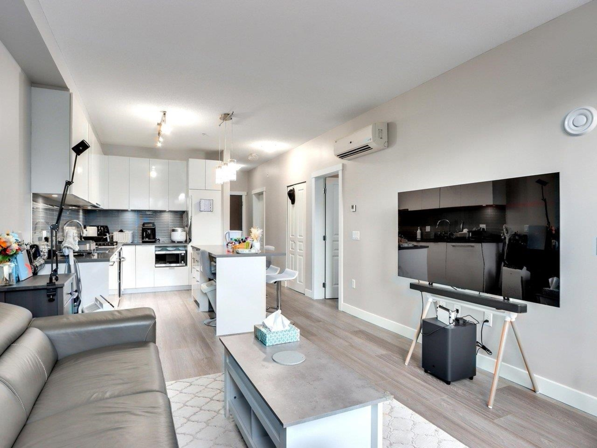 Introducing Alexandra Court, a meticulously crafted residence by Polygon, located in sought-after West Cambie area. This spacious 1 Bed+Den unit spans 654 SF, offering a sleek open concept layout w/top-notch finishes. Features include S/S kitchen appliances, quartz countertops, A/C, 8'11" ceilings, and laminate flooring throughout. The living & dining area seamlessly connects to a private 115SF outdoor patio facing the landscaped Courtyard. The bedroom features a walk-through closet leading to a cheater en-suite bathroom. An open Den/Flex space is perfect for an office. Enjoy resort-style amenities such as an outdoor pool, lounge, gym, indoor basketball court, Ping Pong Room, Media Room & guest suites. Central location near Walmart, restaurants, shops, and transit. 1 parking & 1 storage.
