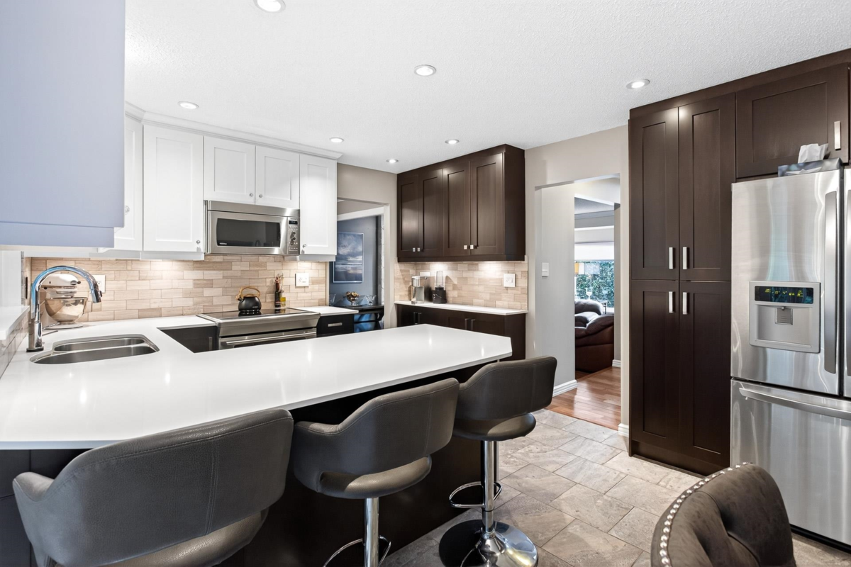 Come home to your peaceful oasis in a quiet cul-de-sac, once you are here you never want to leave. Perfectly situated on a private greenbelt with a sunny south-facing backyard. This beautifully renovated 4 level split home features solid hardwood floors, a newer kitchen with quartz countertops, high-end appliances, Atlas custom cabinetry, & a convenient butler bar. Enjoy a massive, covered sundeck and patio with a 50-year guarantee—ideal for BBQs and entertaining. Extended side yard offers space for a pool or? Renovated main bath includes dual sinks, skylight, and custom storage cabinets. Den off the entry, custom windows with built-in screens, LED décor switches and dimmers. Unfinished bsmt is roughed in for bath & f/p. Two mature apple trees complete this move in ready oasis. Act Now!
