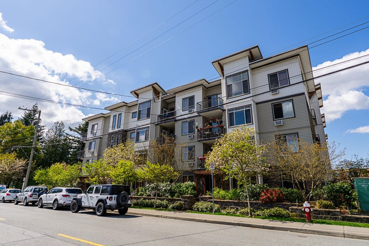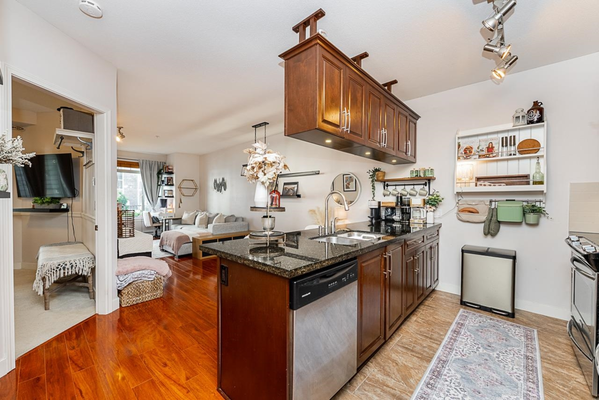 Sought-after Wellington Station by Quadra Homes offers a quality home in the heart of Maple Ridge. This 1 bed + den, 1 bath, ground floor unit is situated on the quiet, North side of the building with convenient patio access. The unit is spacious, with in-suite laundry and storage and features granite countertops, soft close cabinets, stainless steel appliances, heated bathroom floors and a fog free bathroom mirror. The primary bedroom has ensuite access and is equipped with an AC unit that keeps the home cool throughout the Summer months. Close to transit, shopping and recreation, this home is a must see.