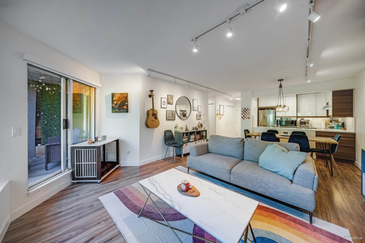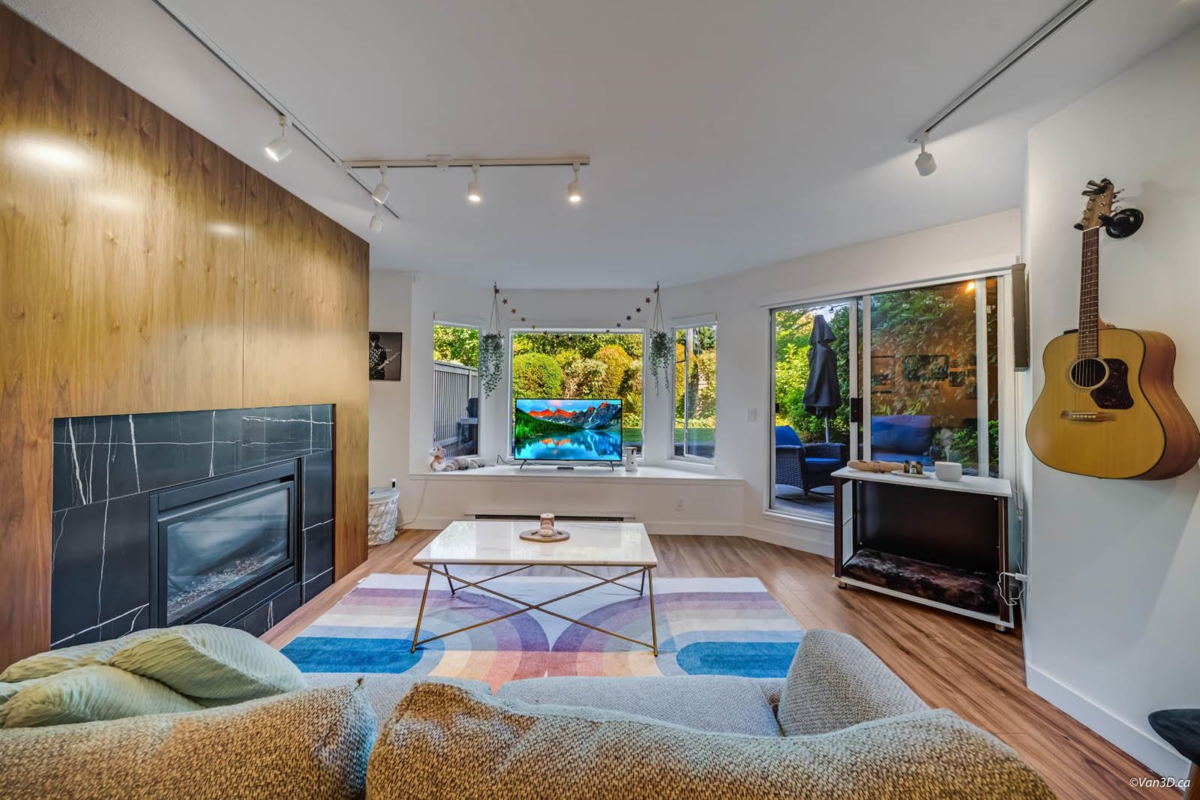 Gorgeous 2 bedroom 2 bathroom ground level unit with expansive garden patio. Beautifully renovated in 2017. Open concept floor plan features an updated kitchen with white high gloss upper cabinets, walnut toned lower cabinets, quartz countertops with eating bar, stainless appliances, overlooking the spacious living room with a cozy gas fireplace. The primary bedroom includes a walk-in closet. Renovated bathrooms include Nu heat floor, updated cabinets, counters and tiled flooring. Insuite laundry. This quiet home comes with 1 parking and a storage locker. The generous layout is perfect for families, pet owners, and gardening enthusiasts. Ideally located near transit, Broadview Park, Downtown, BCIT, Metrotown etc. Building is well maintained. You will love it !!