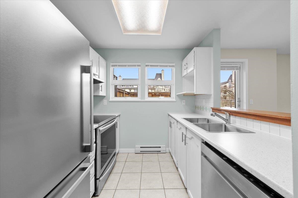Welcome to Le Chateau! This freshly renovated 2-bedroom, 1.5 bathroom home is move in ready. With its extra large patio facing the courtyard, this additional outdoor space (approx 600 Sq Ft.) provides a beautiful space to relax and enjoy those long summer evenings. With an abundance of windows in this corner unit there is also plenty of natural light. Centrally located, this property provides quick access to the highway for easy commuting. Transit and Skytrain are also just around the corner. Minutes away you will find shopping, restaurants, and entertainment. Included is 1 parking spot and 1 storage unit. Quick possession possible. Call for a private showing