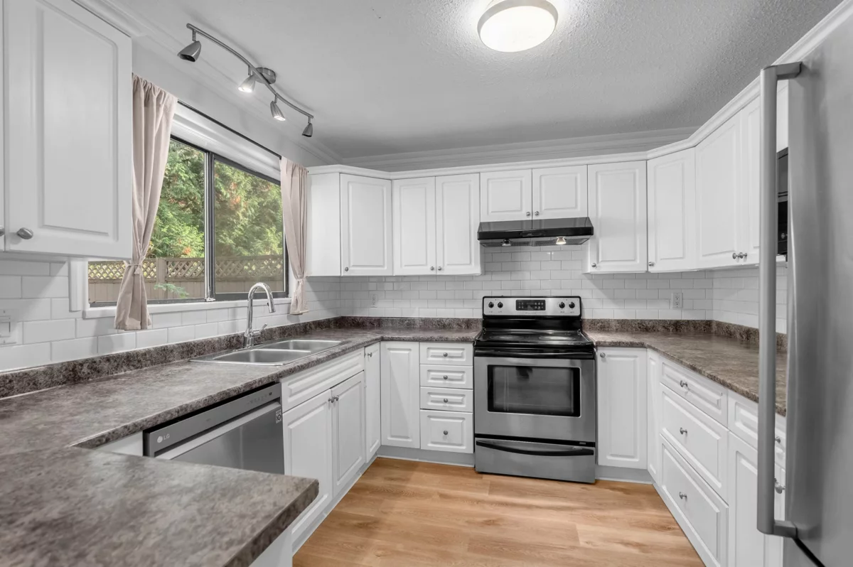 Beautifully updated 3-bedroom, 3-bath home in the quiet New Horizons neighbourhood. Features include a stylish kitchen with white cabinets and s/s appliances, a cozy family room with a wood-burning fireplace, and French doors leading to a private, fully fenced backyard backing onto a greenbelt. Just steps from transit, schools, Douglas College, Coquitlam Centre, Lafarge Lake, and Town Centre Park. Move-in ready with potential for future redevelopment. A must-see!
