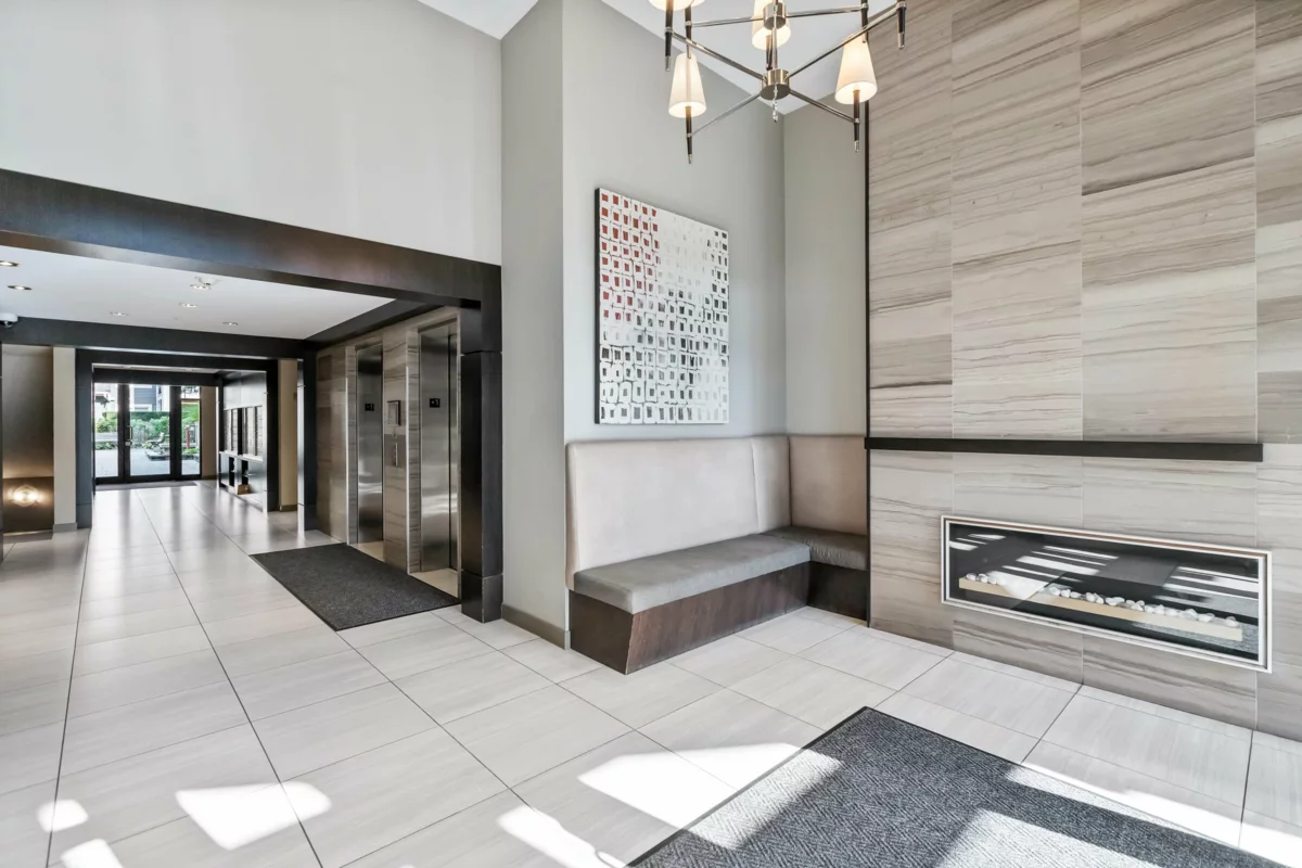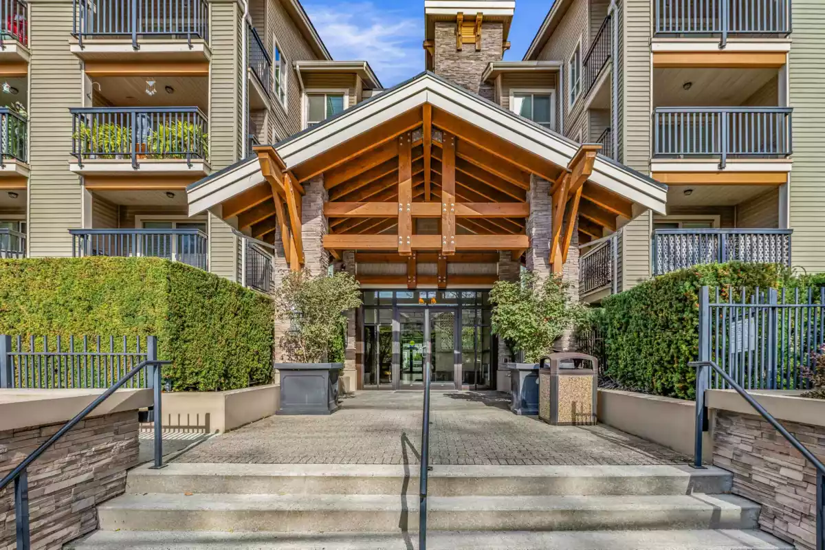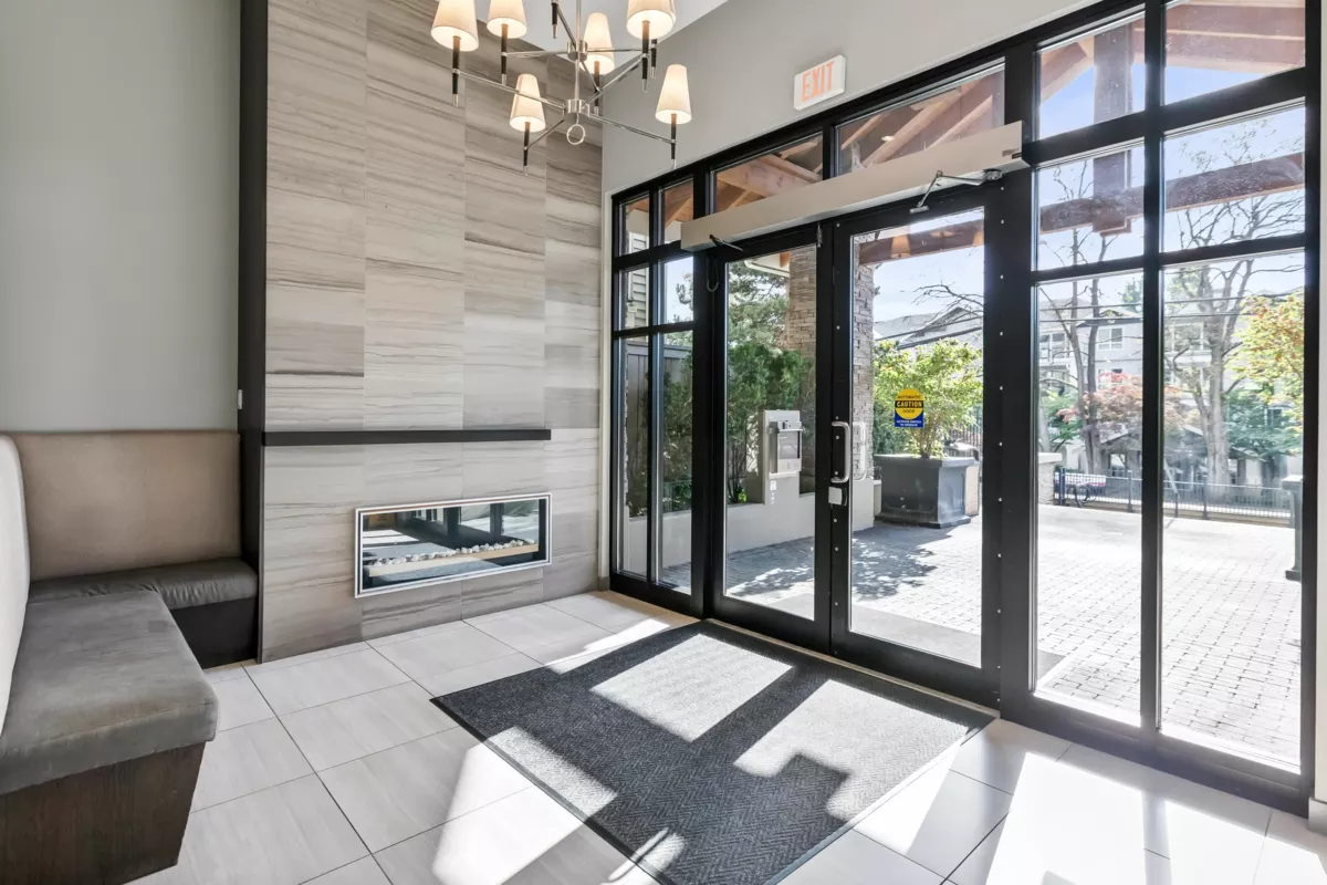 CORNERSTONE presents this beautiful GROUND FLOOR HOME offering a LARGE PRIVATE YARD with EXTRA ENTRANCE, situated on the QUIET SIDE OF THE BUILDING. Located in a secure, raised podium-style complex with no public access,ideal for pets/children.This 2-bedrm, 2-bathrm condo features an open-concept floor plan. The modern kitchen is thoughtfully designed with quartz countertops, S/S appliances, sleek cabinetry & laminate flooring that flows seamlessly into the dining/living areas.Living rm includes a floating fireplace & provides access to your private 149 sqft patio/large yard through oversized sliding doors/windows. The well-designed layout offers separated bedrms for added privacy,primary features a W/I closet & full ensuite. Pet-friendly building & located just off the Langley Bypass.