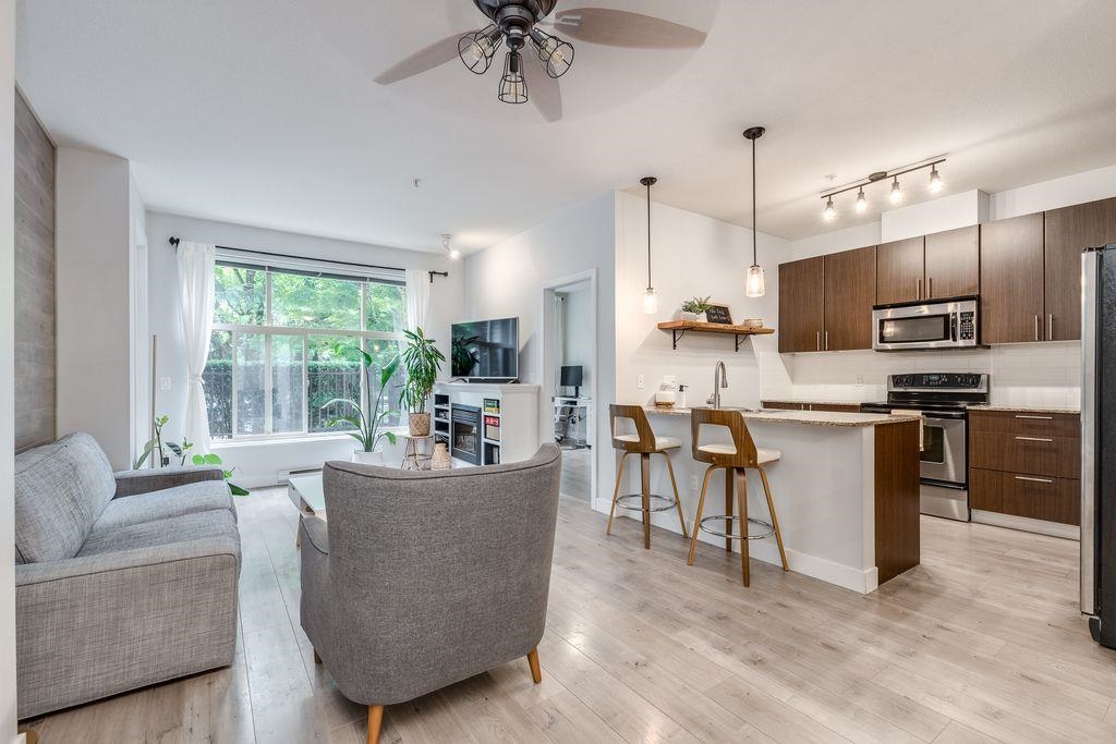 Welcome to your new home! This ideally situated, immaculate ground floor 2 bedroom 2 bathroom unit with private entrance is the perfect starter, downsizer or investment property! Recent upgrades include laminate flooring throughout, granite counters, custom lighting, custom electric fireplace, custom dining room wall feature, paint and more! The ground floor location offers a huge gated balcony with private street entrance just half a block to the newly refurbished Gates Park and all the shopping, recreation, restaurants and transit Downtown Port Coquitlam has to offer. Comes with 1 underground parking spot plus gym and a theatre room! Excellent quality building, very well run strata, everything you need in one convenient location! Book your private showing today!
