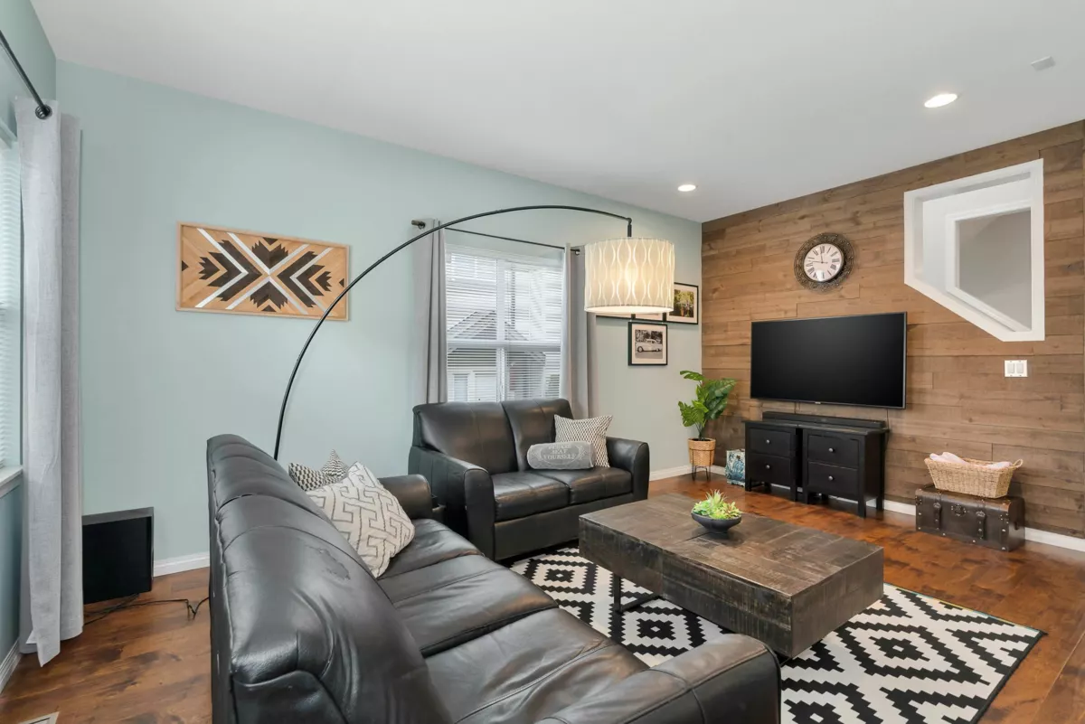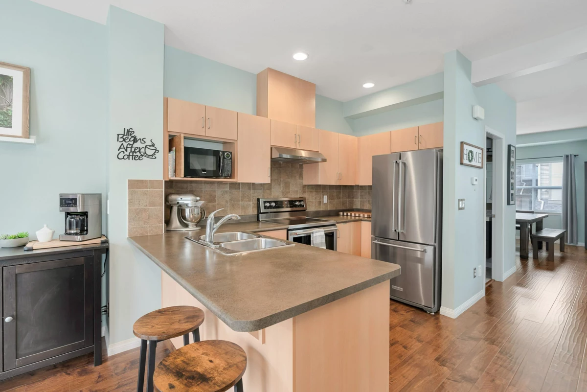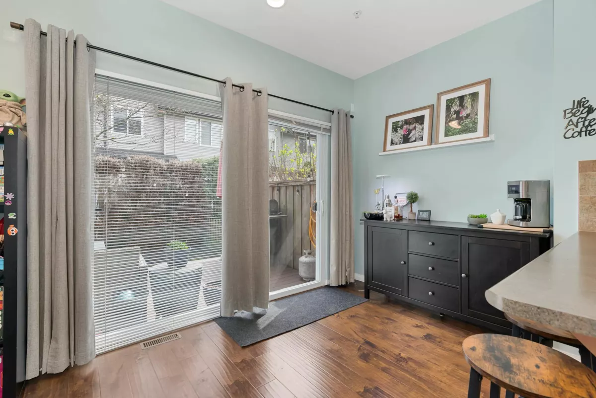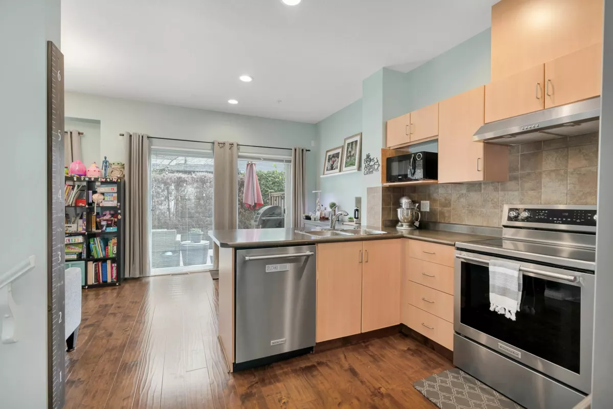 HIGHLY SOUGHT AFTER Family friendly complex across from Blakeburn Elementary is ready for it's next family. A well thought out & spacious end unit townhome, your main floor offers an open living/dining room PLUS flexible options for an eat-in kitchen and family room w/powder room. Upstairs has an extra large primary bedroom with WIC & ensuite. The two additional bedrooms are also a good size,overlook the private, fenced yard. Bottom floor is perfect for another flex space/office/rec room OR 4th bedroom option! Many many updates including new s/s appliances, modern accent walls,paint, updated powder room, newer hot water tank, new deck. DBL garage plus lots of storage! Walking distance to parks, shopping, transit and all levels of schools. Easy access to highways, you will LOVE living here.