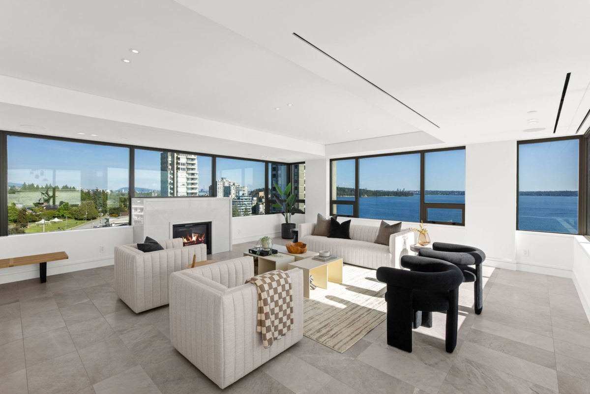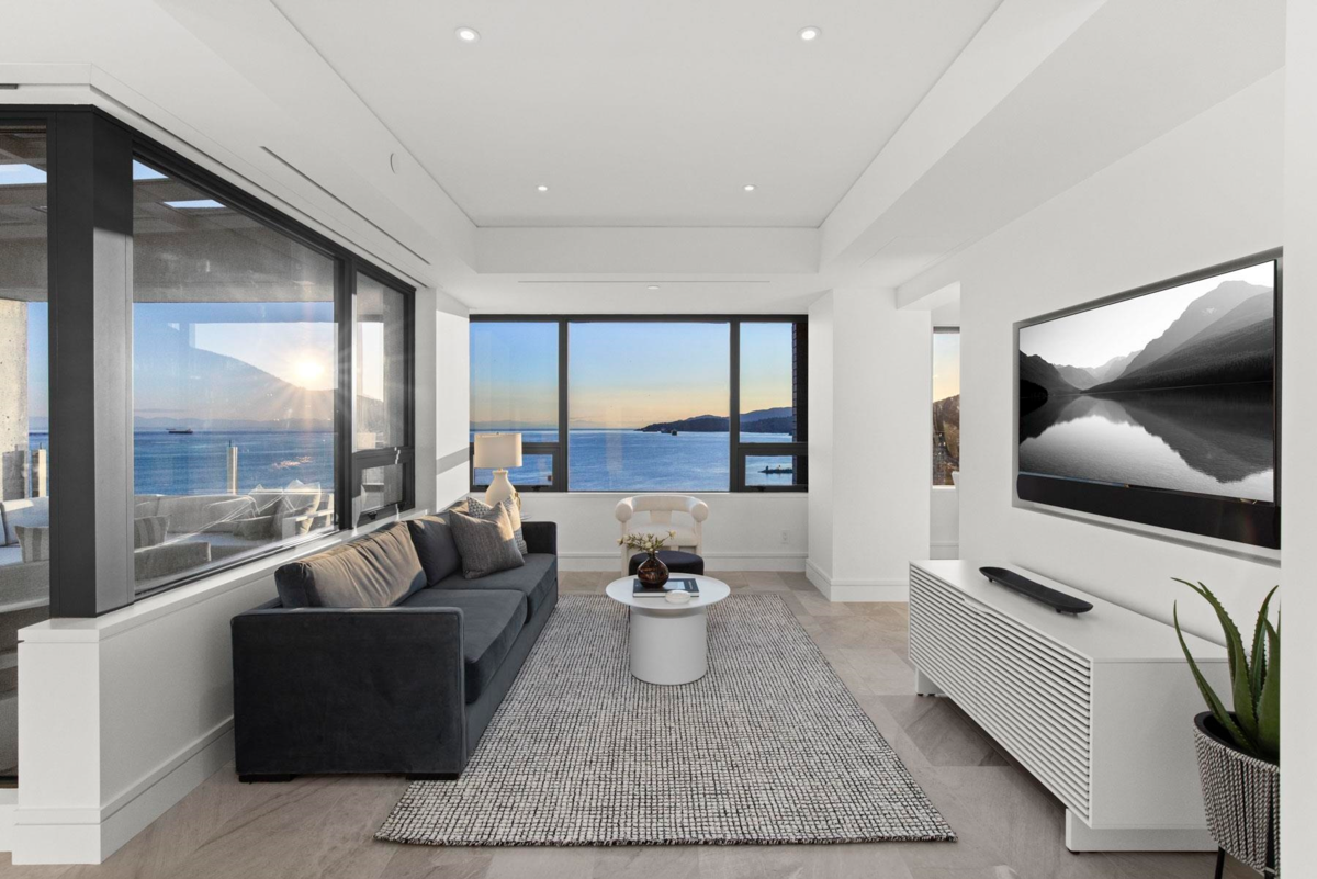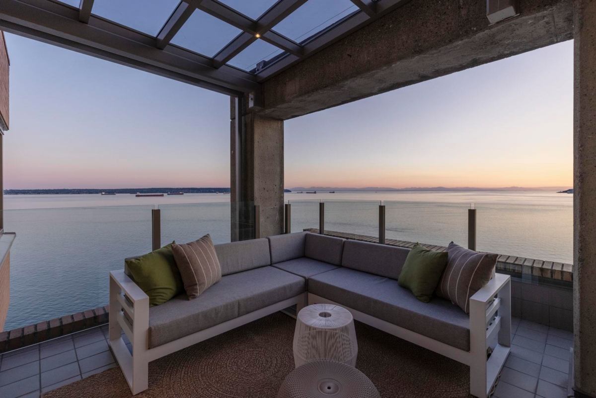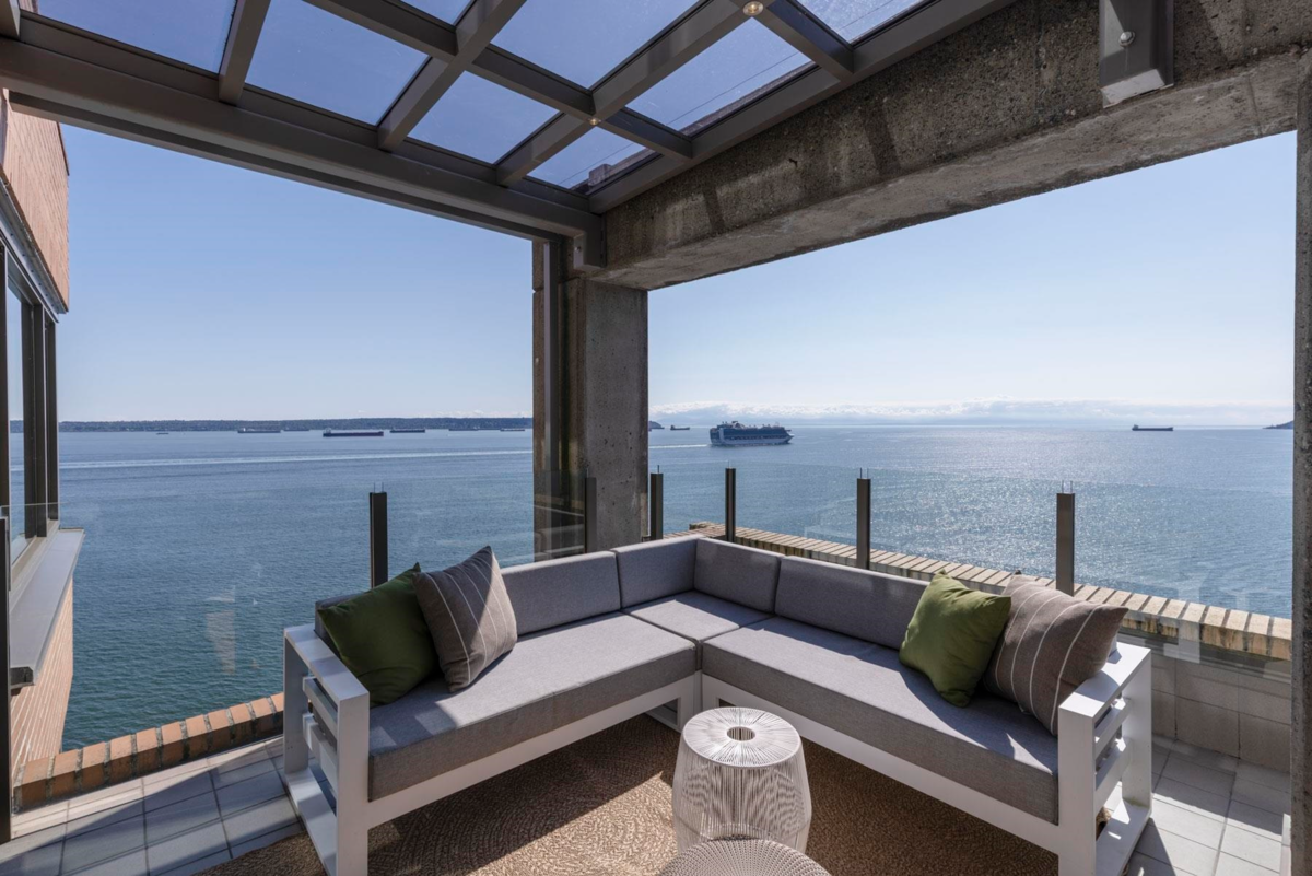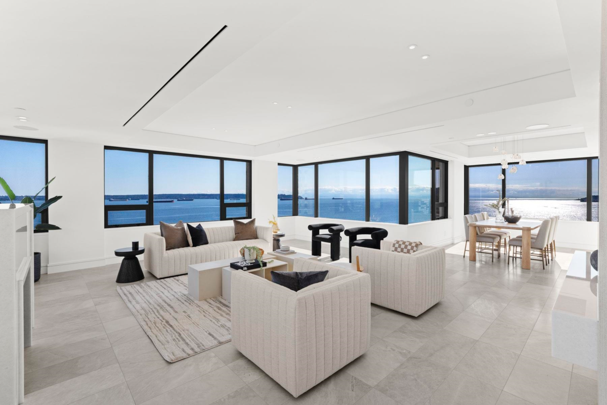 Welcome to Les Terraces, steps from the seawall, where only one unit occupies each floor. Spanning approx 3,000sqft, this sub-penthouse was substantially renovated to the studs at the highest level by Bradner Homes and HB Design. Open concept living/dining area w/ fireplace & incredible city, ocean & mountain views. Chef’s kitchen w/ Miele & Sub-Zero appliances, connected to the family room & large outdoor covered terrace. Stunning primary bdrm w/ covered patio & spa-like ensuite. Two more generous sized ensuite bdrms, full-size laundry room & powder room complete the impeccable floorplan. Other features include: automatic blinds, A/C, Lutron lighting, private 2 car garage w/ storage, 2 elevators, indoor pool, hot tub & on-site executive concierge. Steps to great cafes & restaurants.