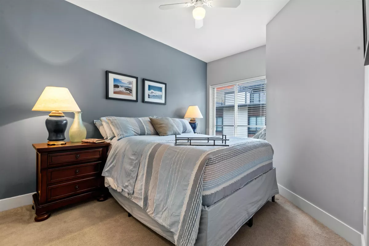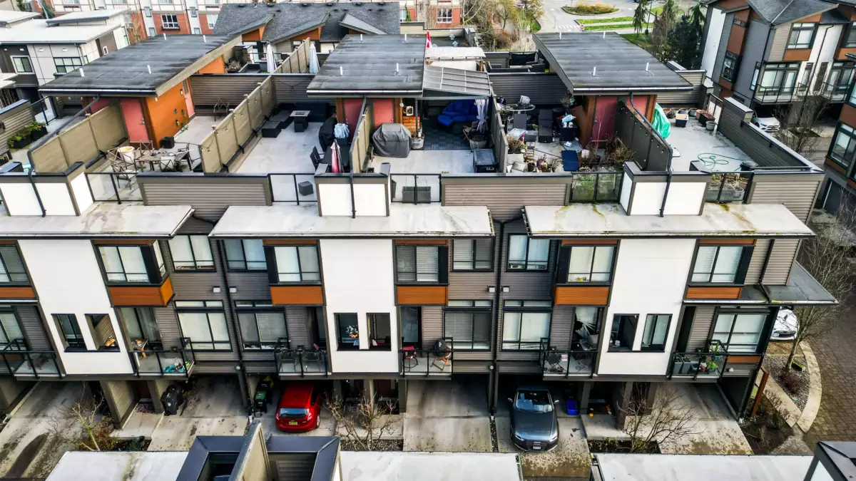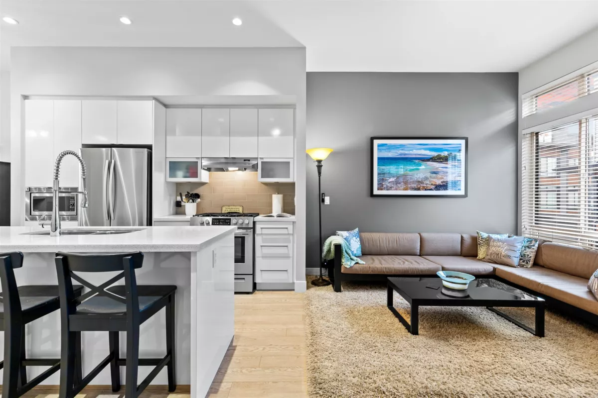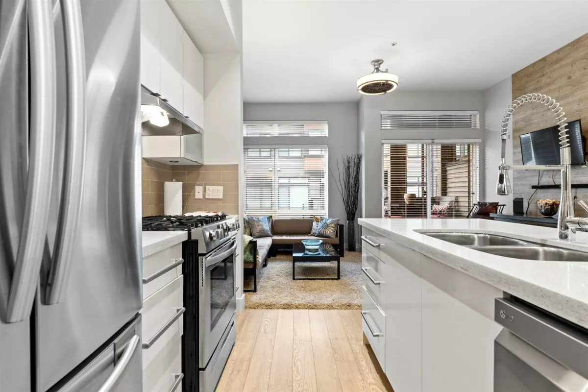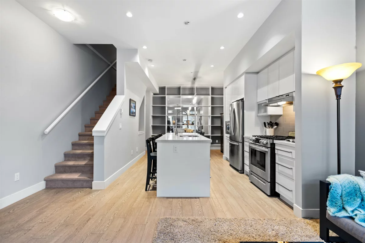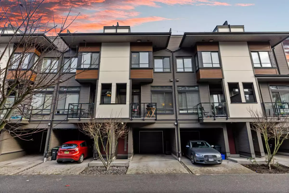 Situated in the quiet wing of the complex, this family-friendly home built by Hayer is located in the sought-after Exchange community. It features a modern kitchen with quartz countertops, gas cooking, large island, built-in microwave, and spacious dining area. Bright open layout with large windows throughout. Enjoy two outdoor spaces including a balcony off the living room and an impressive over 400 sq ft rooftop patio with gas hookup and partial Mount Baker views—perfect for sunsets, entertaining, or relaxing. Upstairs offers two bedrooms, primary with walk-in closet and ensuite. Parking for two plus amenities including clubhouse, playground, and guest suite. Steps to Richard Bulpitt Elementary, Willoughby Town Centre, Costco, parks, and more.