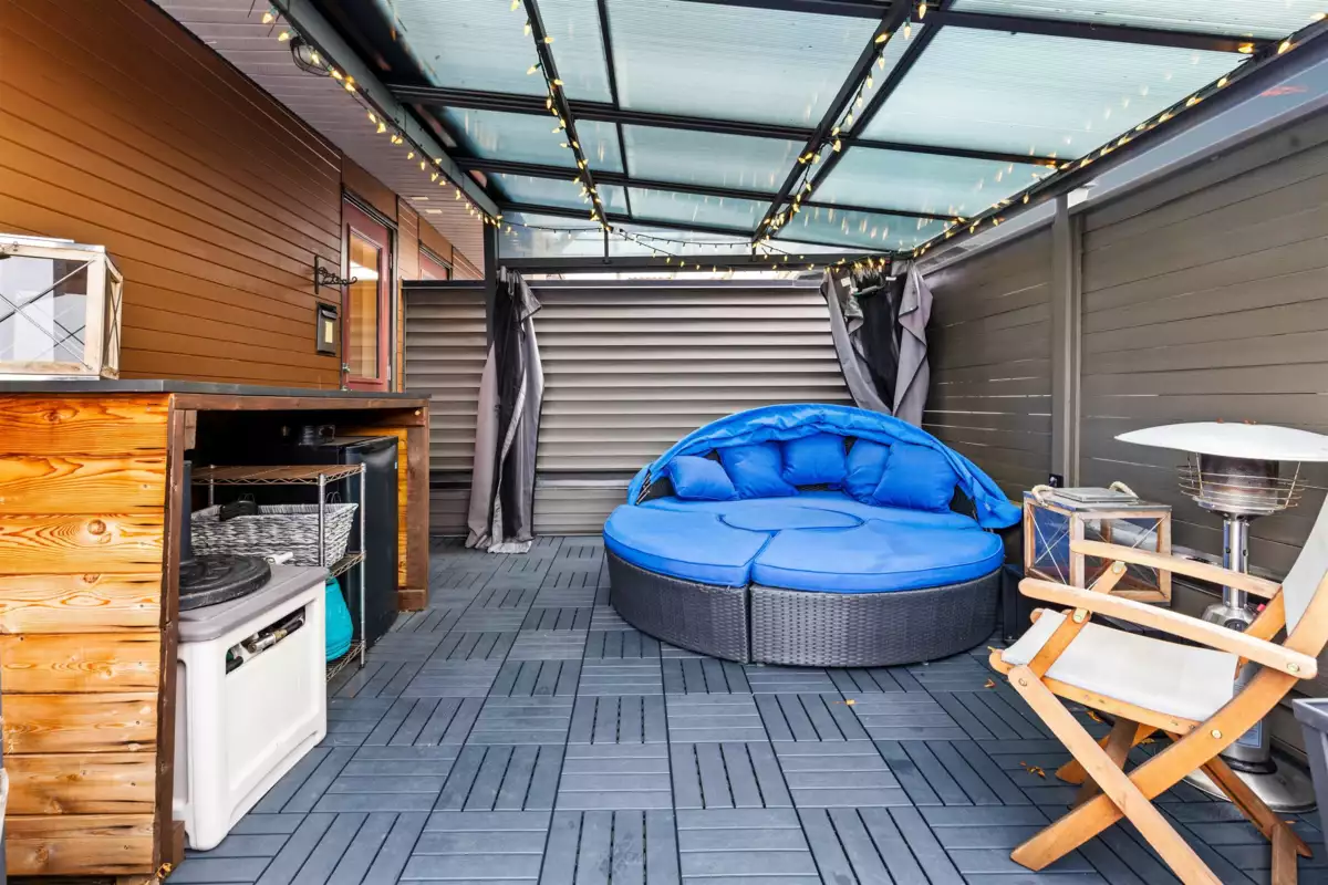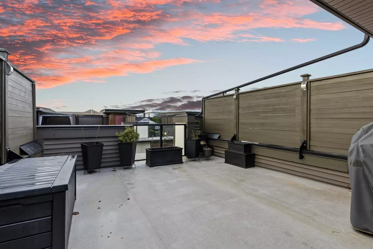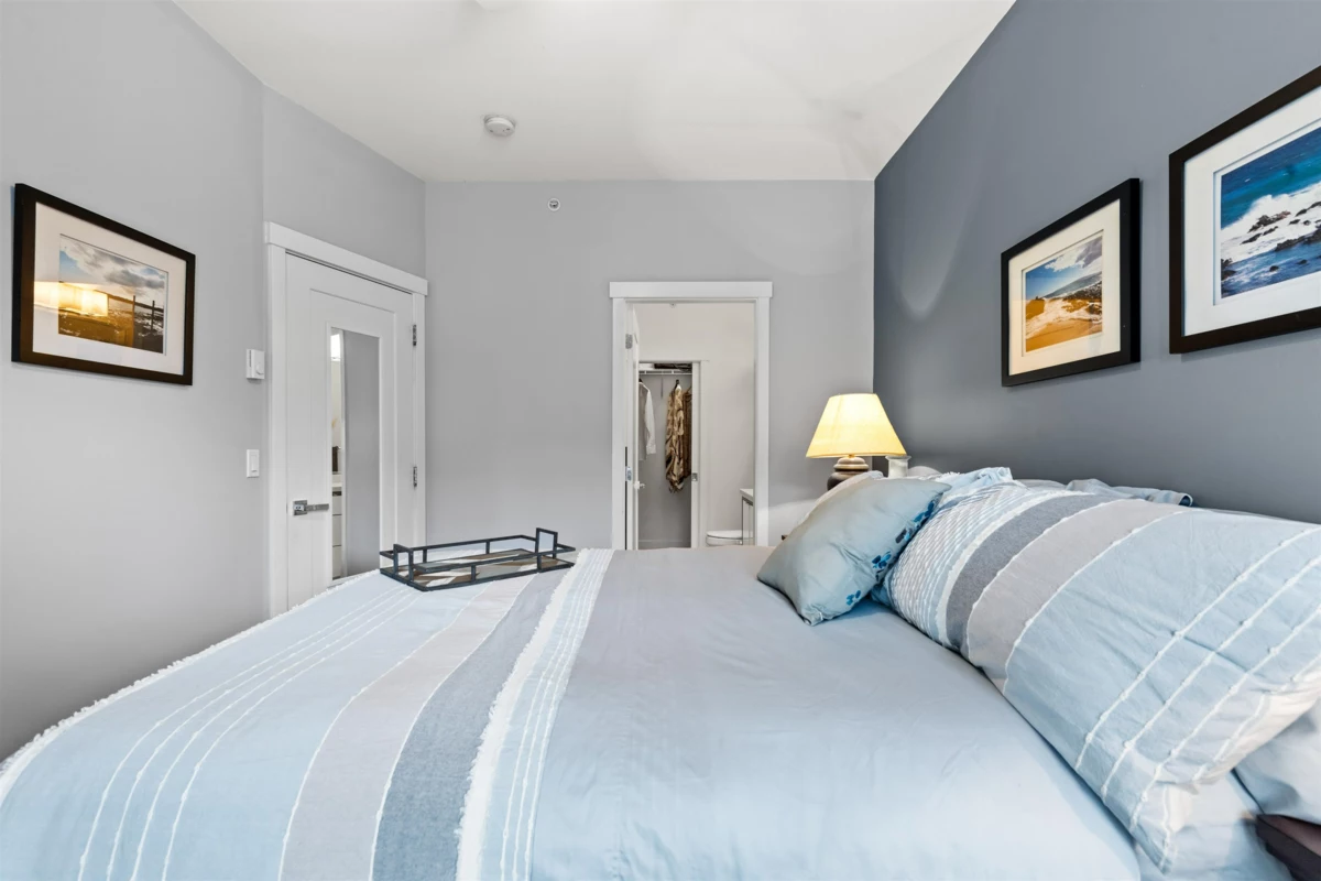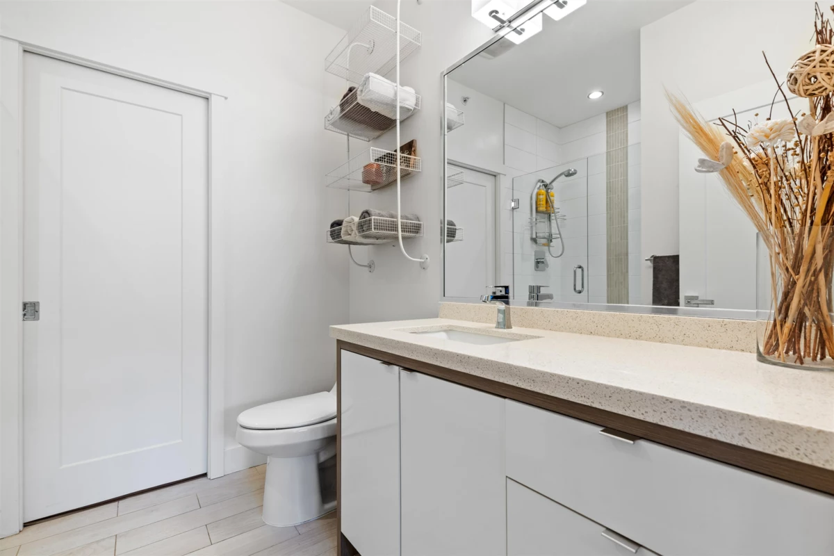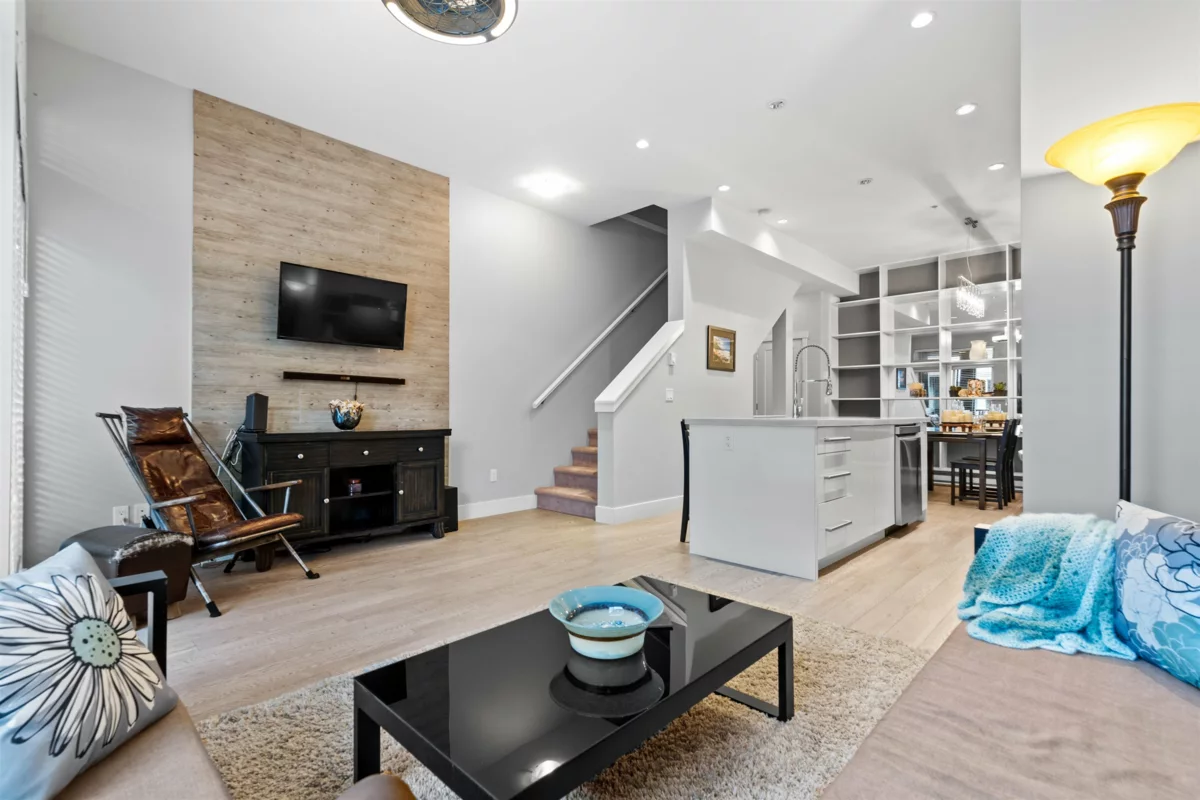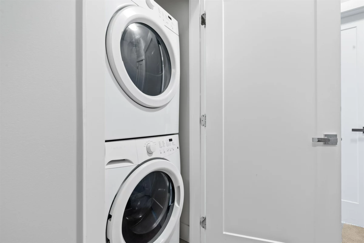 Situated in the quiet wing of the complex, this family-friendly home built by Hayer is located in the sought-after Exchange community. It features a modern kitchen with quartz countertops, gas cooking, large island, built-in microwave, and spacious dining area. Bright open layout with large windows throughout. Enjoy two outdoor spaces including a balcony off the living room and an impressive over 400 sq ft rooftop patio with gas hookup and partial Mount Baker views—perfect for sunsets, entertaining, or relaxing. Upstairs offers two bedrooms, primary with walk-in closet and ensuite. Parking for two plus amenities including clubhouse, playground, and guest suite. Steps to Richard Bulpitt Elementary, Willoughby Town Centre, Costco, parks, and more.