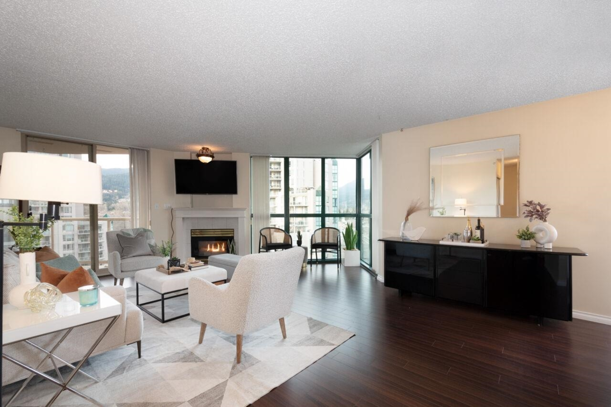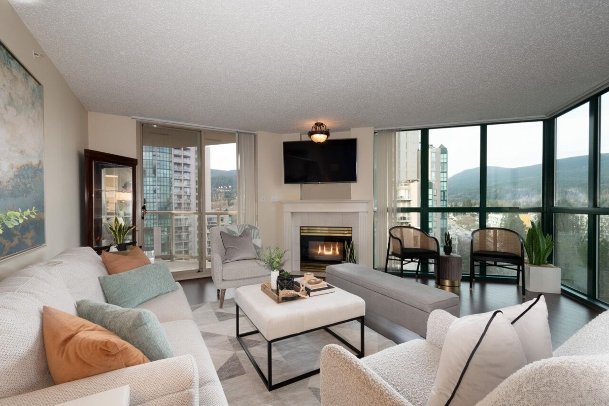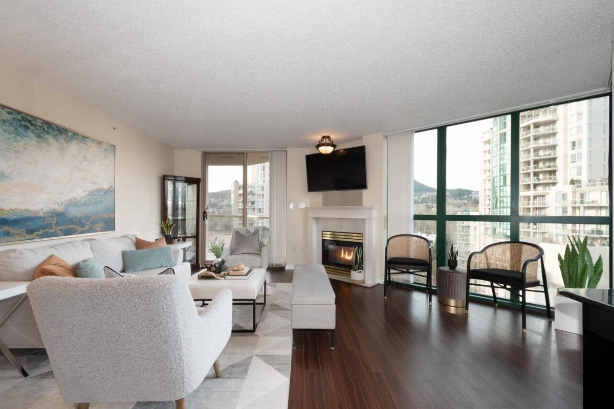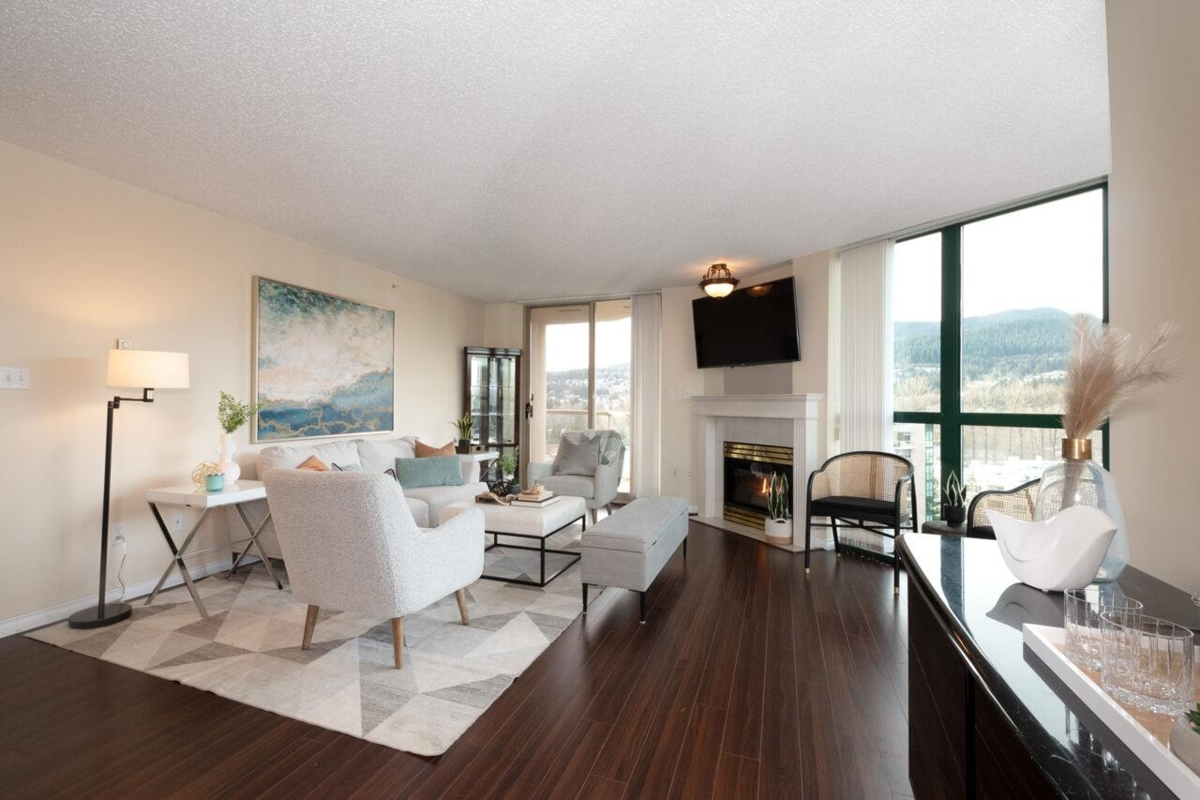 The Mackenzie featuring newly re-piped plumbing! Originally selected as developers premier show suite, this corner unit offers panoramic views to the North, East & South through its expansive floor-to-ceiling windows in the living area. Generous 1259 sq ft, this 2-bedroom haven features a cozy gas fireplace, balcony for outdoor relaxation, & bonus eating area within the kitchen. Enjoy tranquil garden space w/ gazebo. Shared amenity-rich building: community room, sauna, racquetball court, fitness room, swimming pool & hot tub. Unit includes 2 parking stalls, 2 visitor passes, 1 dedicated locker & access to 4 EV charging stalls. Allows for 2 pets! Stroll to Coq Centre, Town Centre, Skytrain/transit, Glen Elem, Maple Creek Middle, Pinetree Sec & Douglas College.TO BE SOLD AS IS WHERE IS.