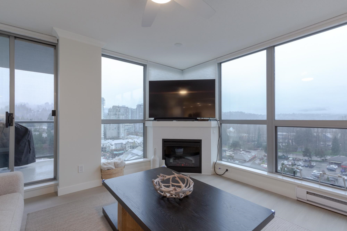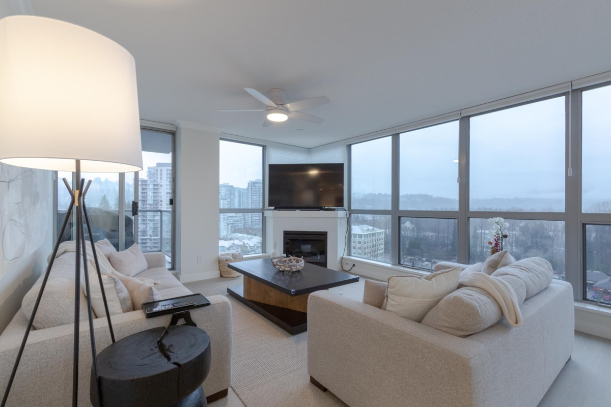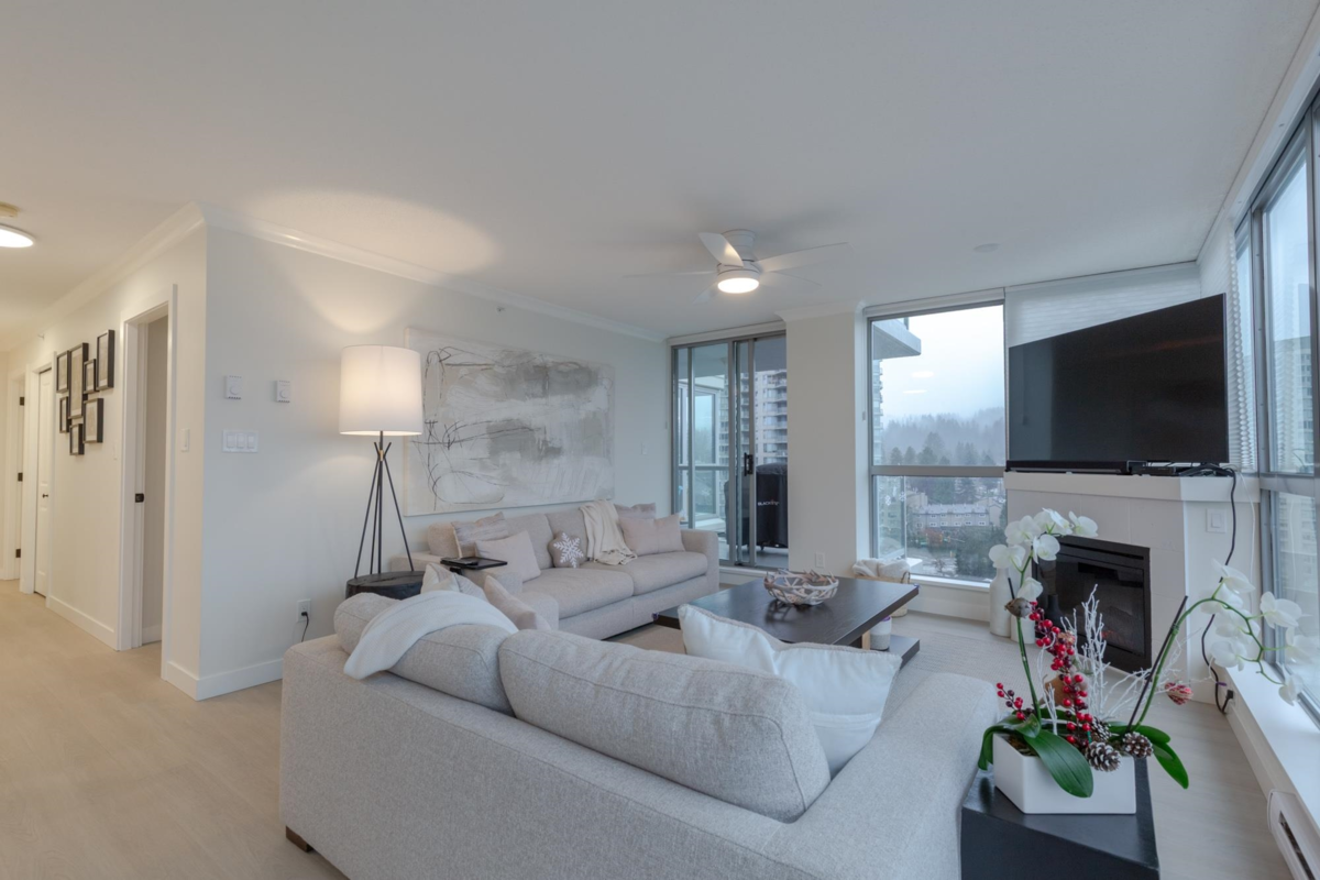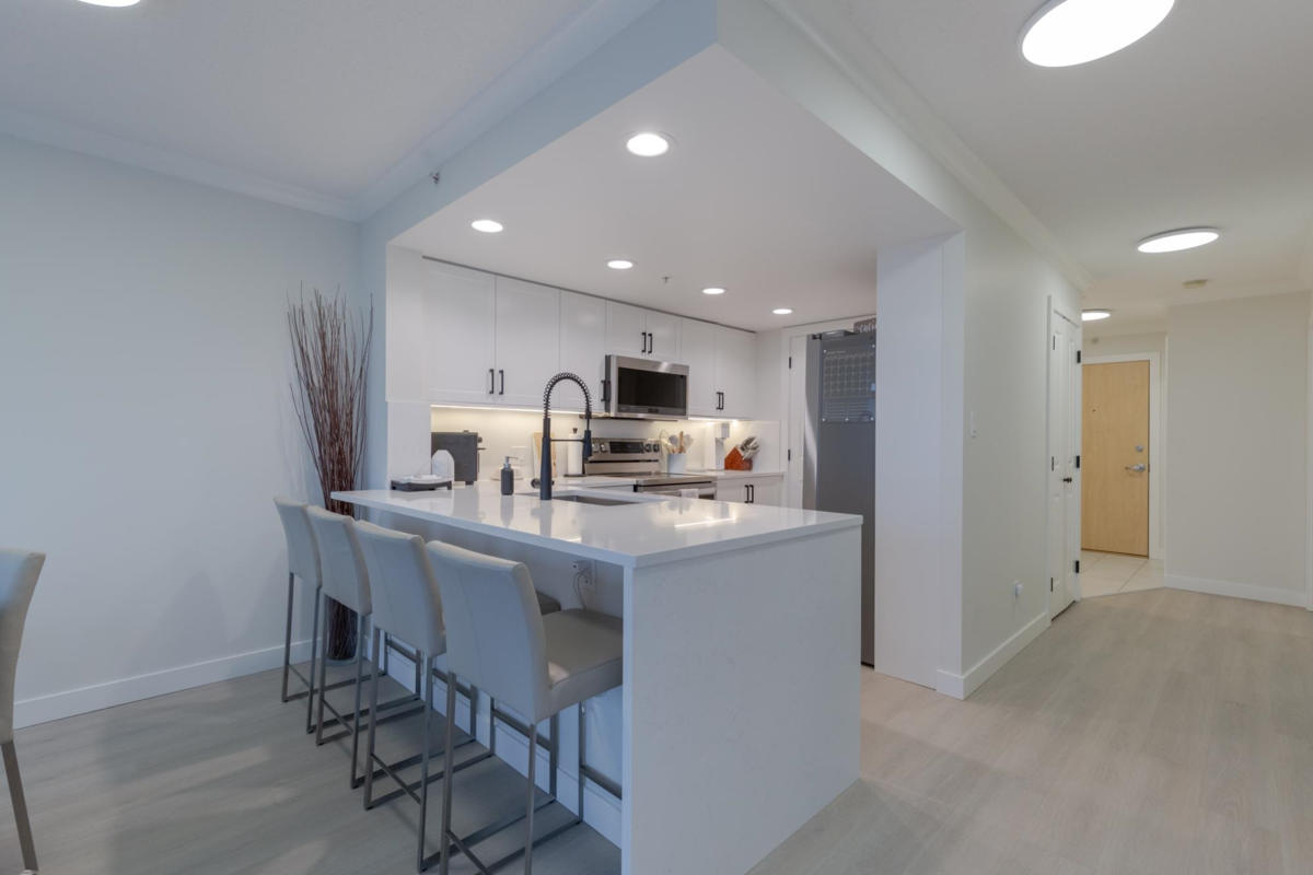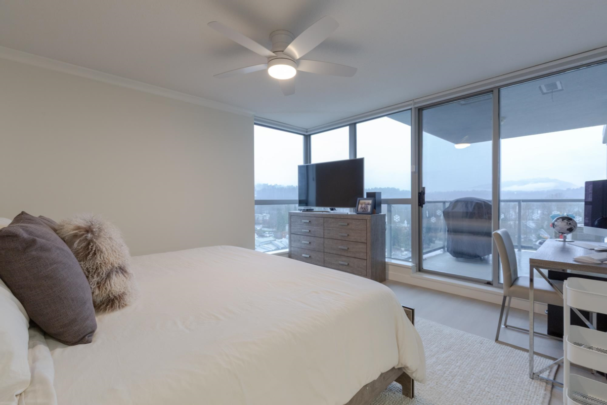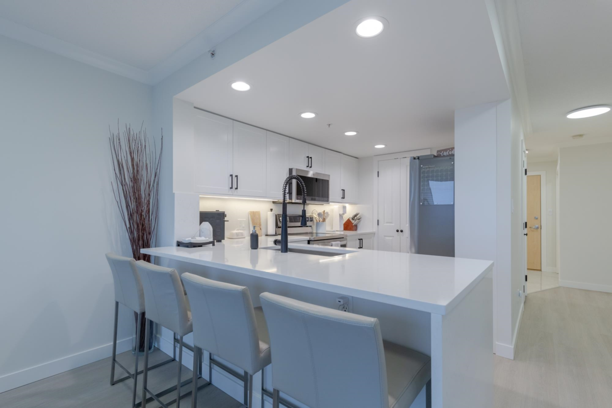 The Sentinel, Newport Villages most sought after building! South facing 2 bedroom + den w/extensive renovations just a year ago. Quartz countertops & backsplashes w/under mount sinks throughout, cabinet soft close doors, 3 stage led lights, baseboards & door casings, closet organizers, electric wand honeycomb blinds w/blackout window coverings and appliances. Corner unit has plenty of natural light and a water view. It has 2 parking stalls with a private & secure 6'x5' storage room adjacent 1 of them. Walk to Newport Village with all it's shops, amenities with the Rec. Centre and Eagle Ridge Hospital across the street and short walk to Skytrain. Well maintained & managed building, w/sauna, hot tub, steam room and fitness area. Buy with confidence! Open Sat & Sun (Feb 14 & 15) 2-4 pm