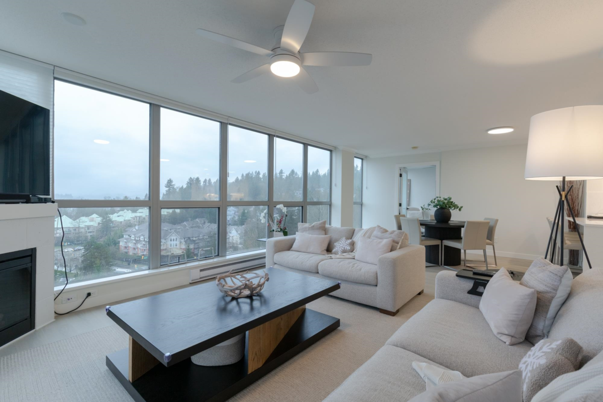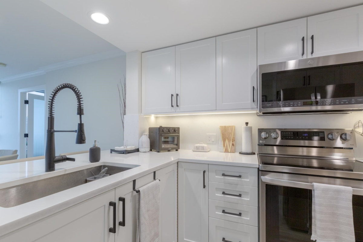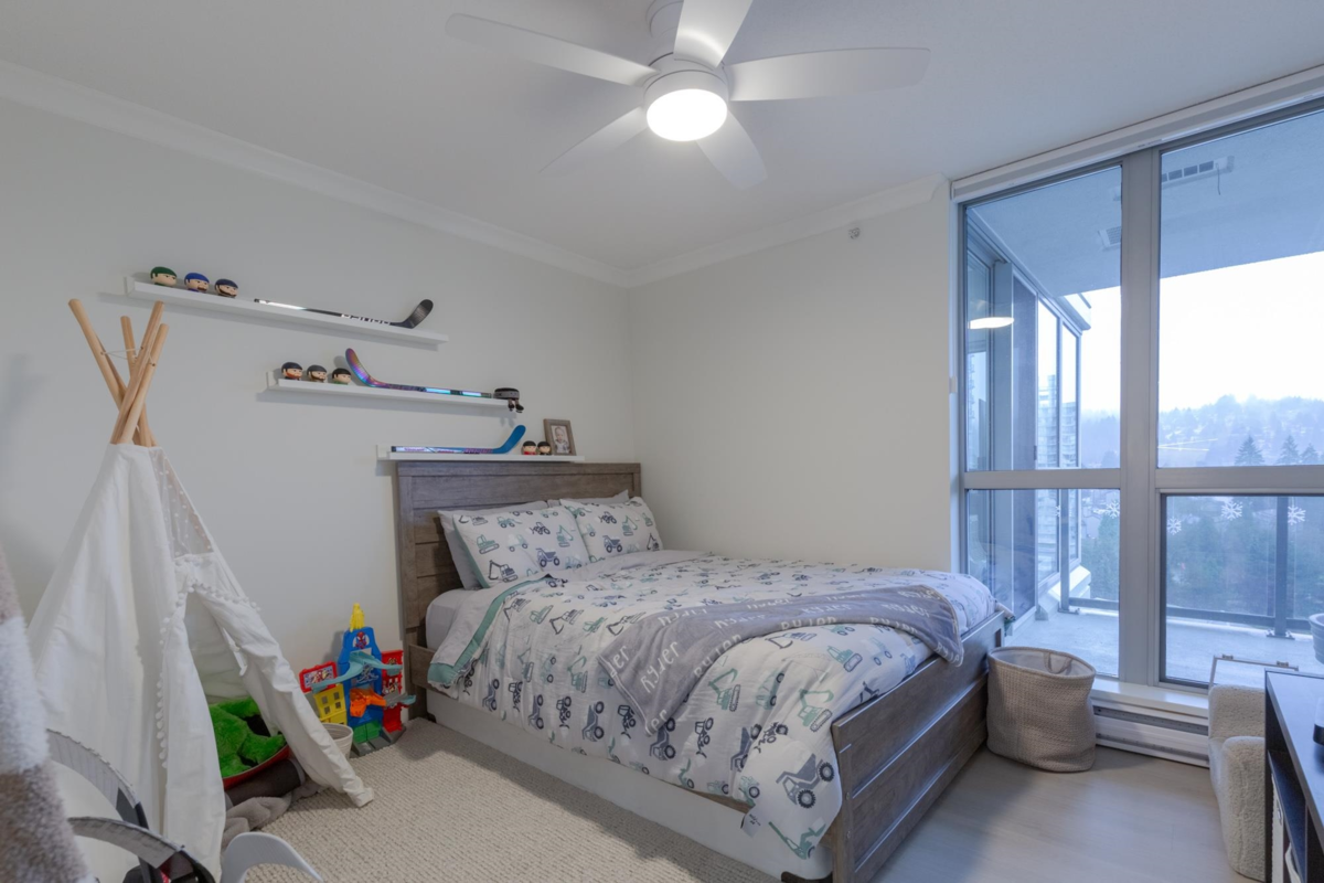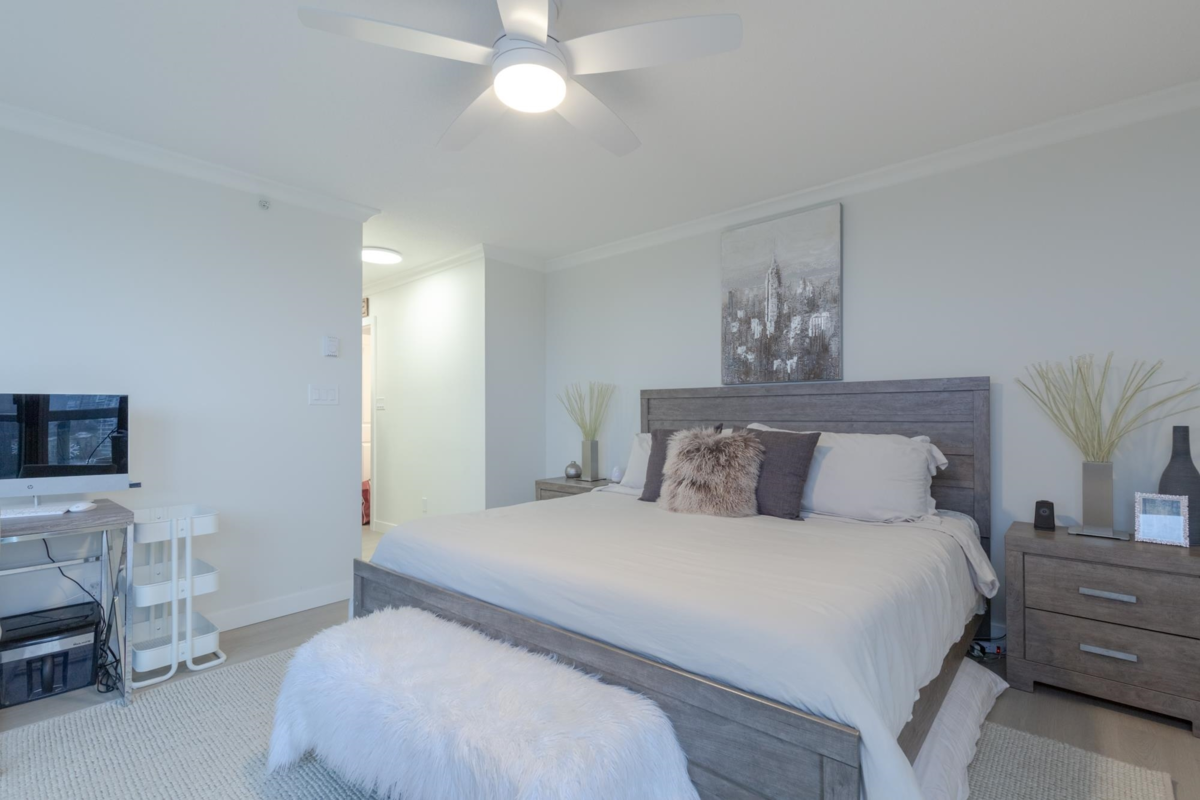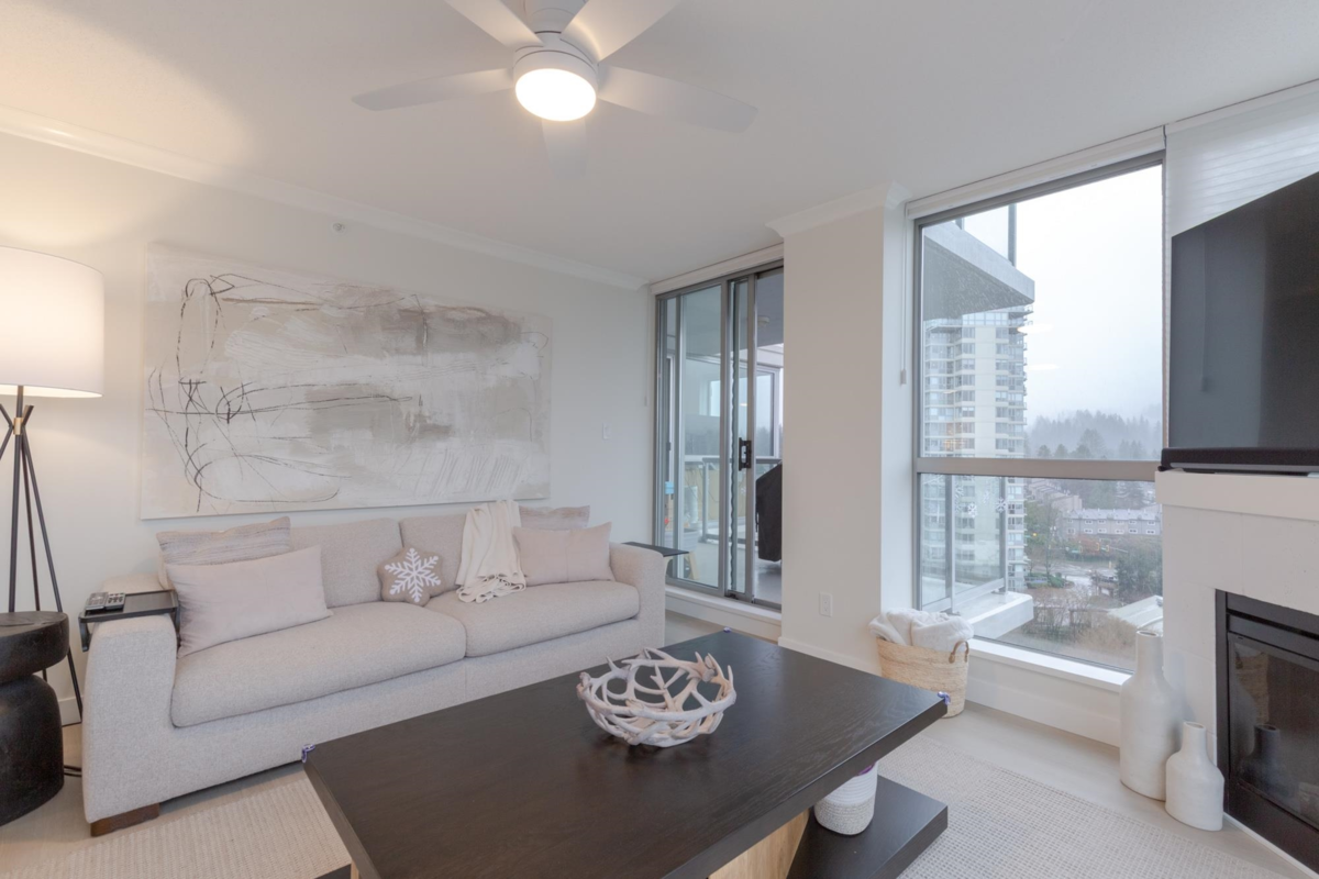 The Sentinel, Newport Villages most sought after building! South facing 2 bedroom + den w/extensive renovations just a year ago. Quartz countertops & backsplashes w/under mount sinks throughout, cabinet soft close doors, 3 stage led lights, baseboards & door casings, closet organizers, electric wand honeycomb blinds w/blackout window coverings and appliances. Corner unit has plenty of natural light and a water view. It has 2 parking stalls with a private & secure 6'x5' storage room adjacent 1 of them. Walk to Newport Village with all it's shops, amenities with the Rec. Centre and Eagle Ridge Hospital across the street and short walk to Skytrain. Well maintained & managed building, w/sauna, hot tub, steam room and fitness area. Buy with confidence! Open Sat & Sun (Feb 14 & 15) 2-4 pm