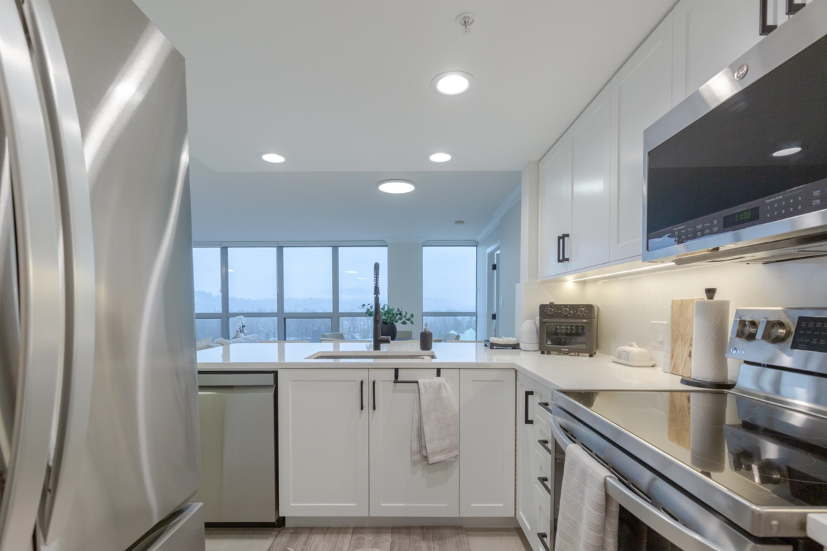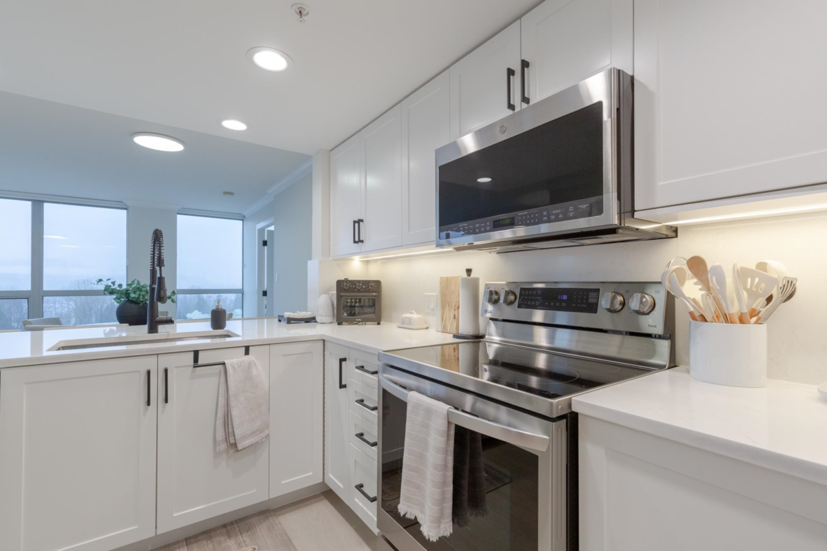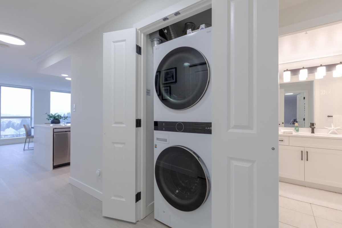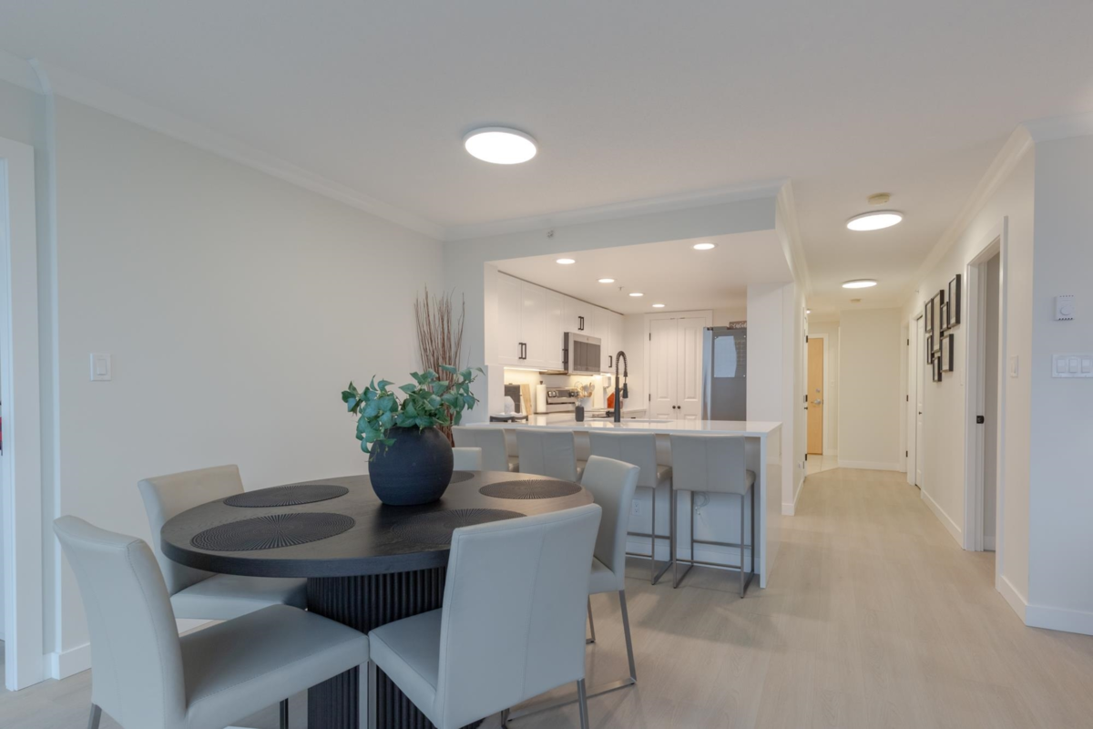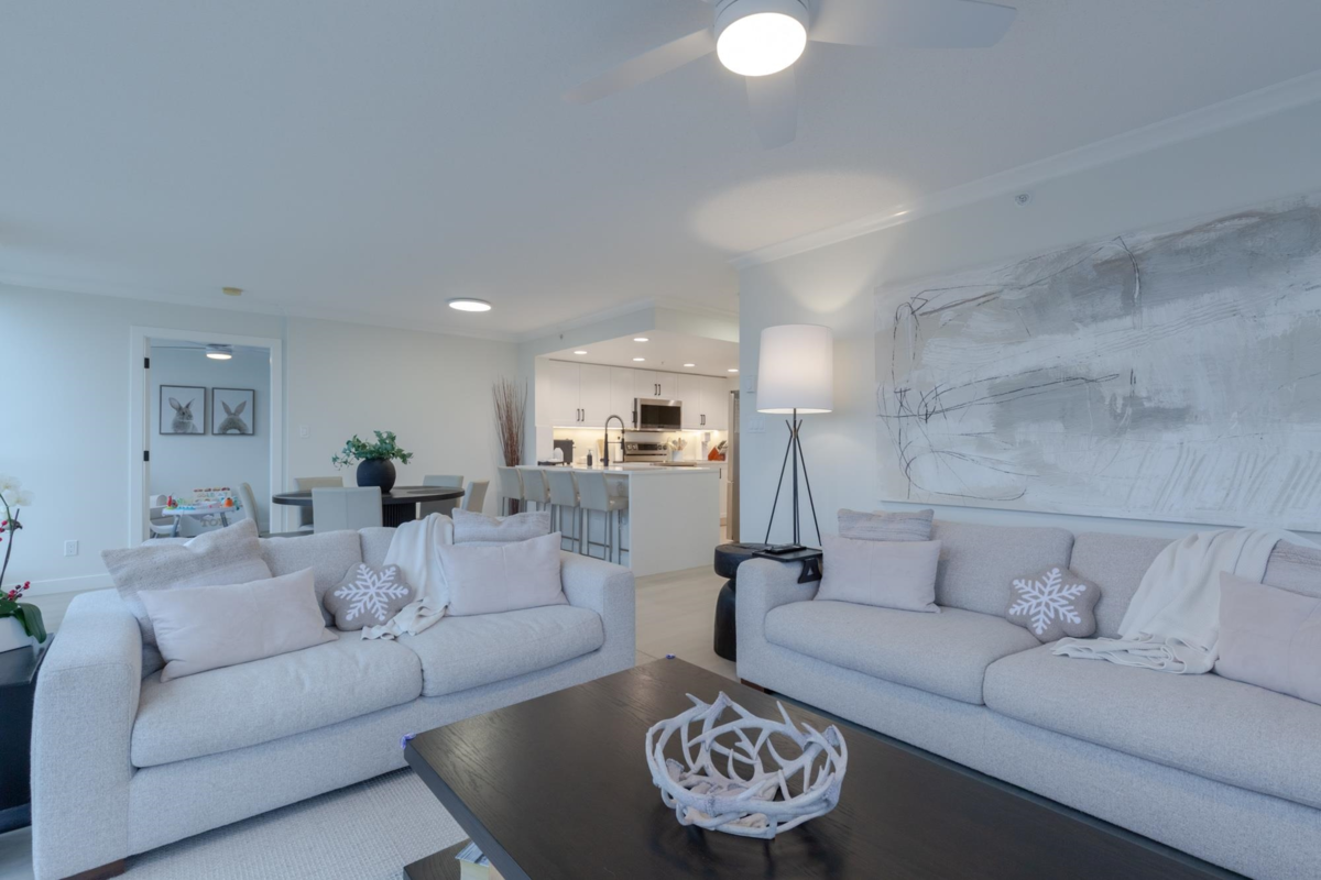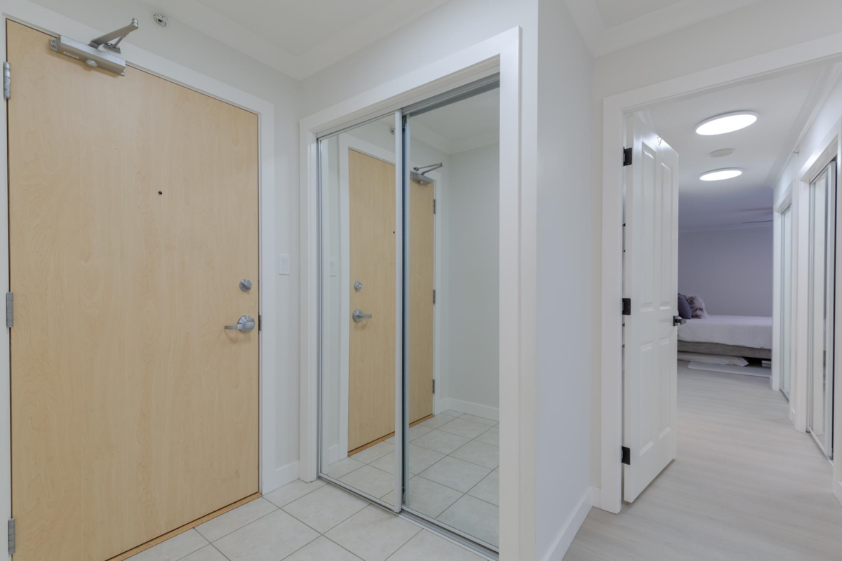 The Sentinel, Newport Villages most sought after building! South facing 2 bedroom + den w/extensive renovations just a year ago. Quartz countertops & backsplashes w/under mount sinks throughout, cabinet soft close doors, 3 stage led lights, baseboards & door casings, closet organizers, electric wand honeycomb blinds w/blackout window coverings and appliances. Corner unit has plenty of natural light and a water view. It has 2 parking stalls with a private & secure 6'x5' storage room adjacent 1 of them. Walk to Newport Village with all it's shops, amenities with the Rec. Centre and Eagle Ridge Hospital across the street and short walk to Skytrain. Well maintained & managed building, w/sauna, hot tub, steam room and fitness area. Buy with confidence! Open Sat & Sun (Feb 14 & 15) 2-4 pm